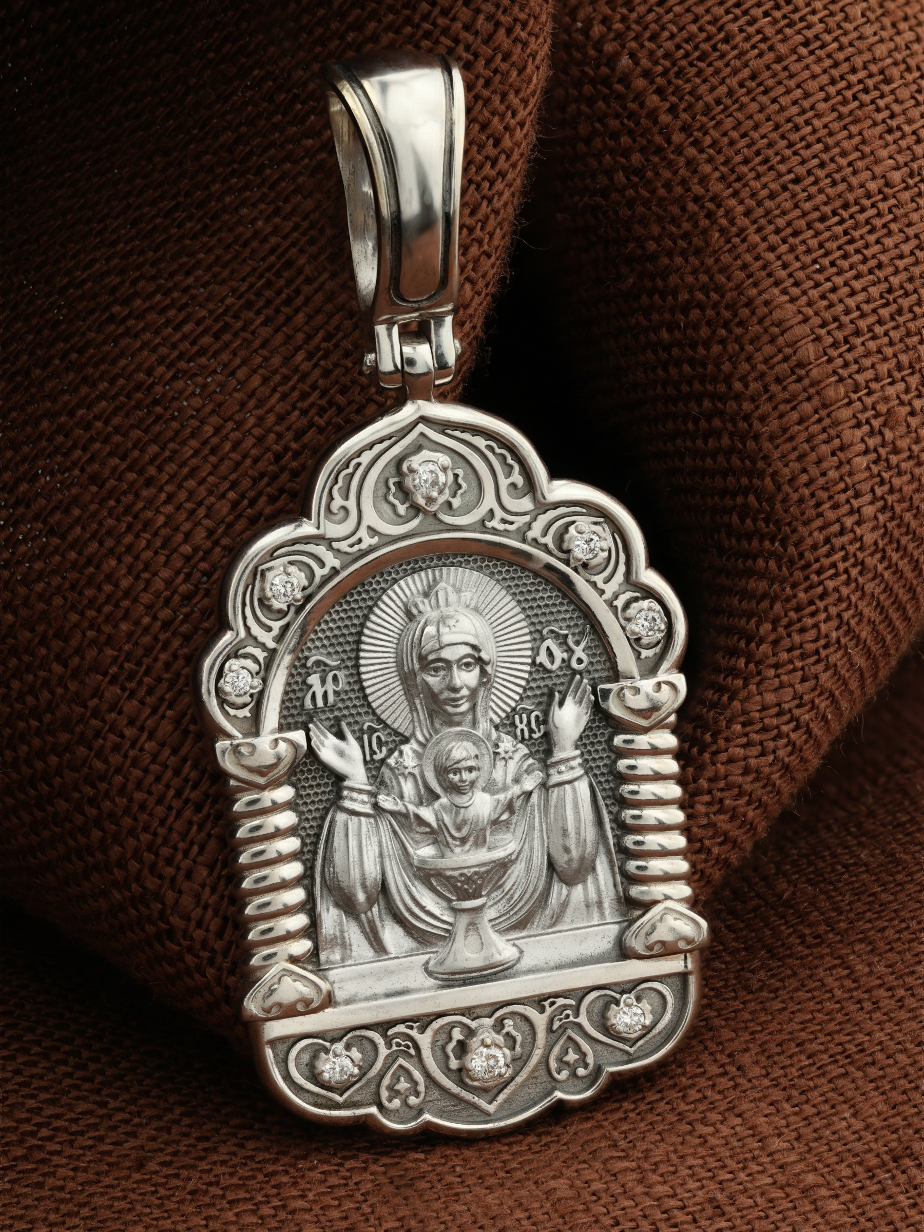 На лицевой части образка изображена икона Божией Матери «Неупиваемая чаша». Икона славится помощью в исцелении зависимостей, помогает людям обрести свободу от греховных страстей.