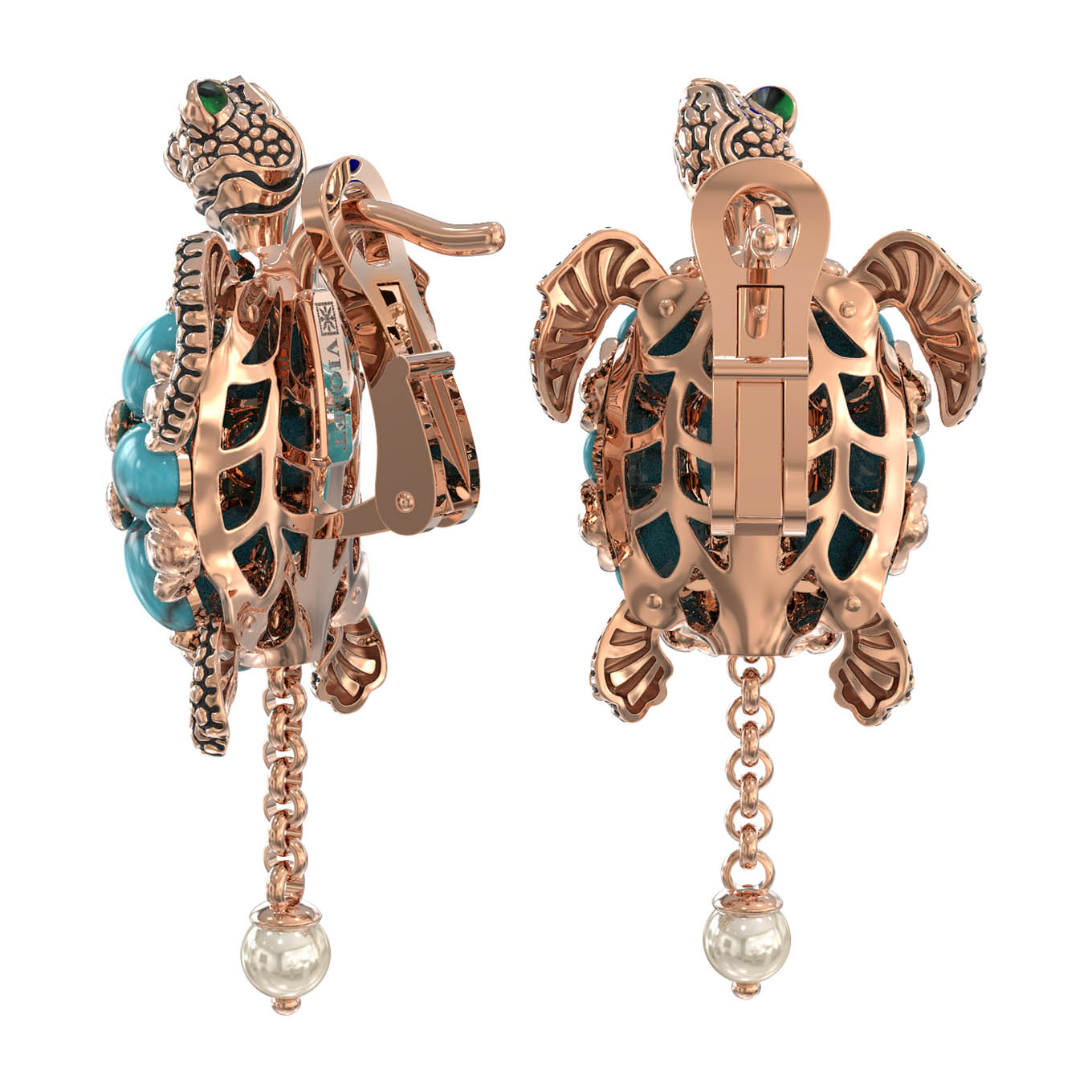 Серьги из золота c эмаль, жемчугом и бирюзой