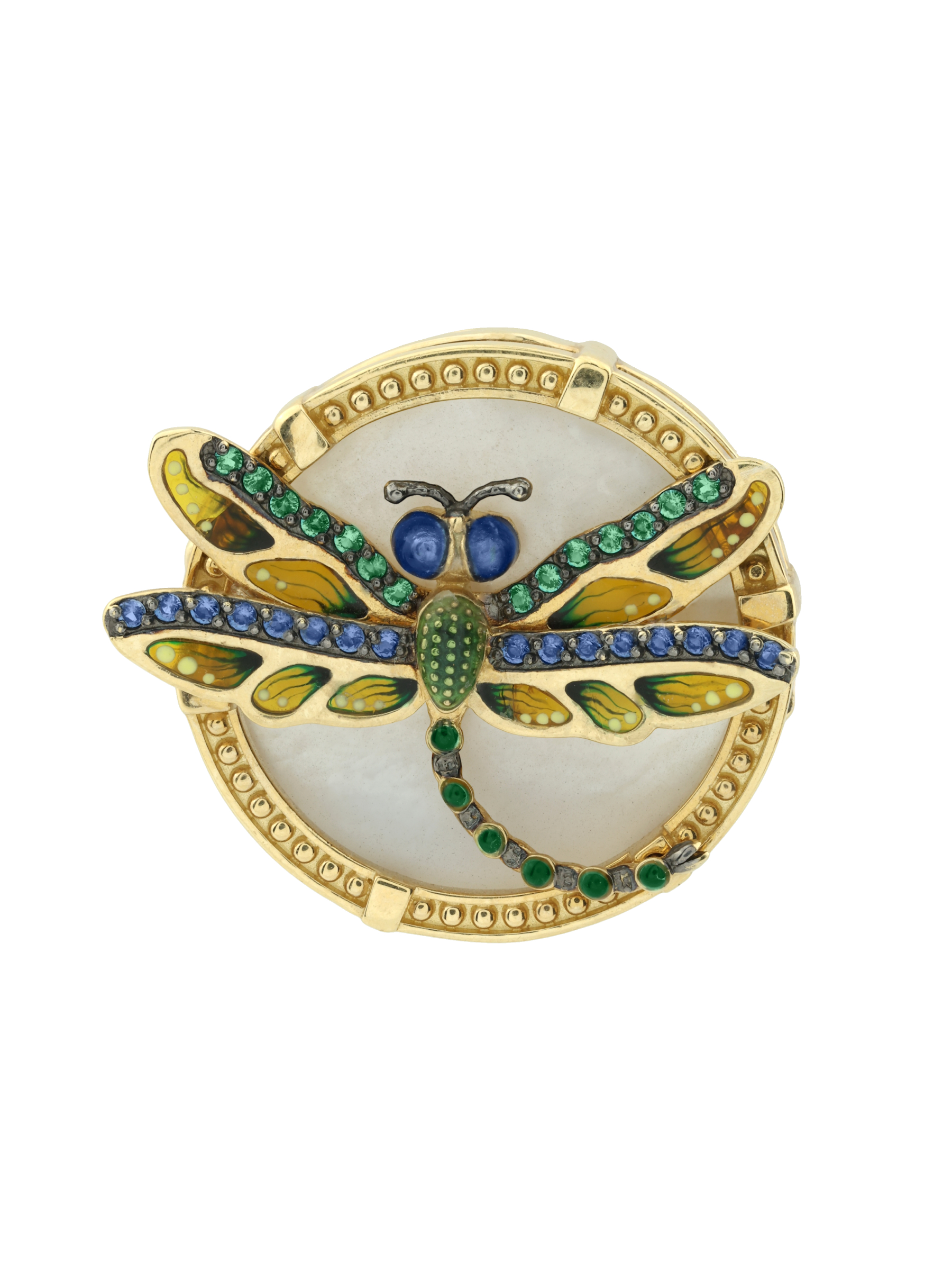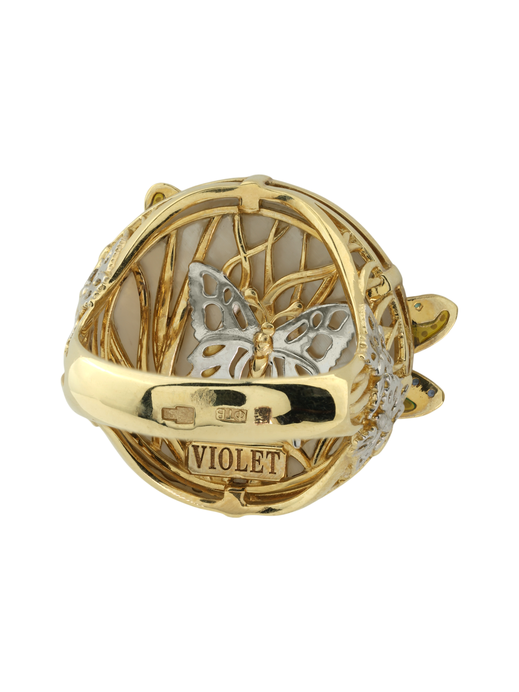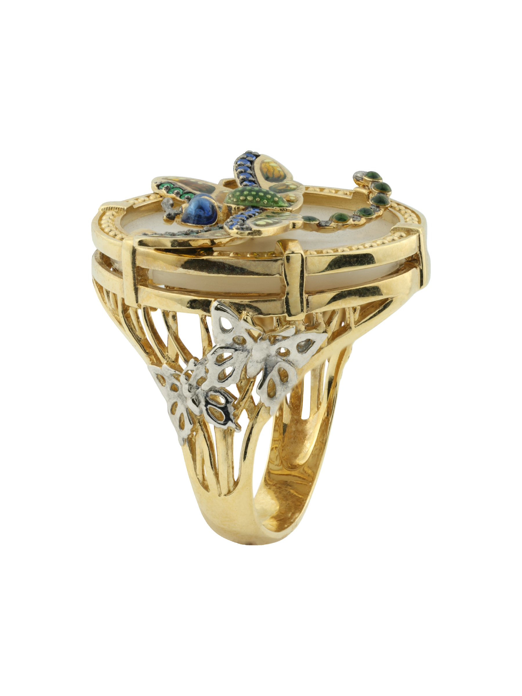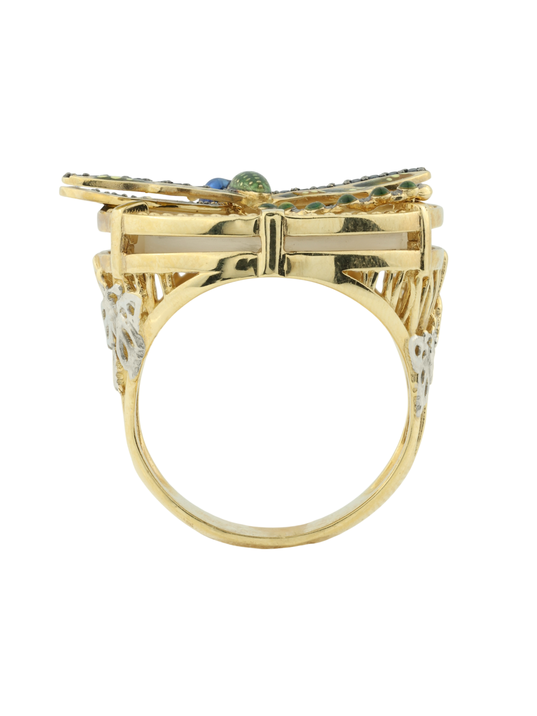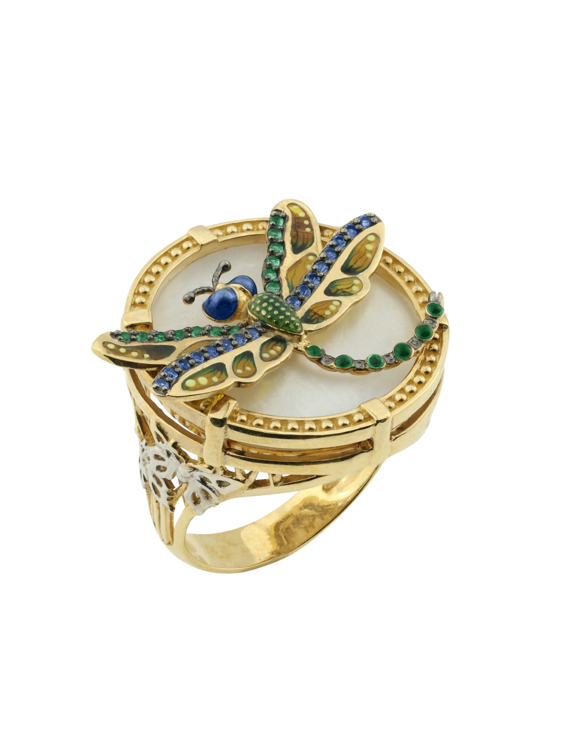 Кольцо из лимонного золота c сапфиром, изумрудом, эмалью и перламутром
