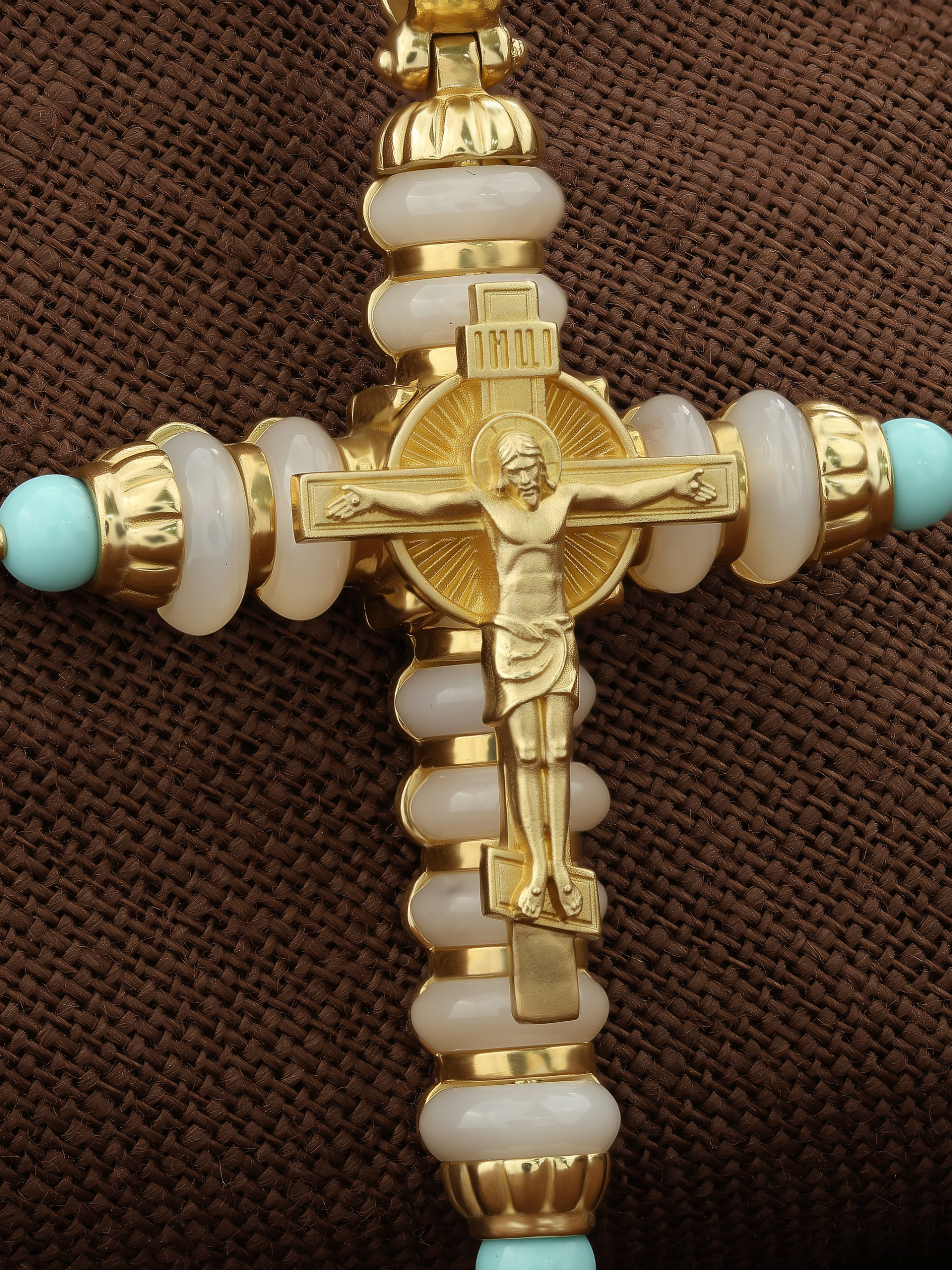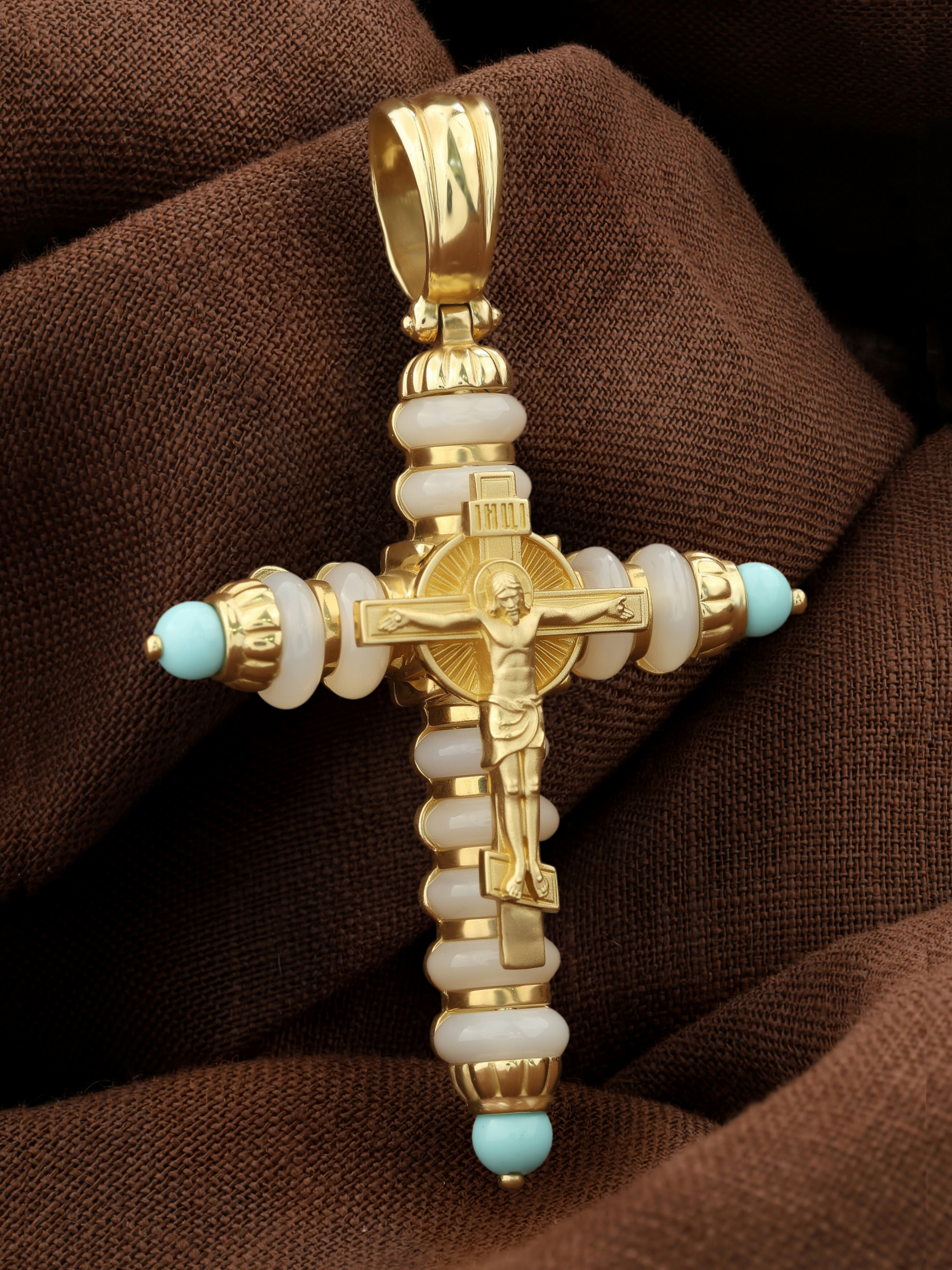 Крест из лимонного золота c бирюзой и кахолонгом