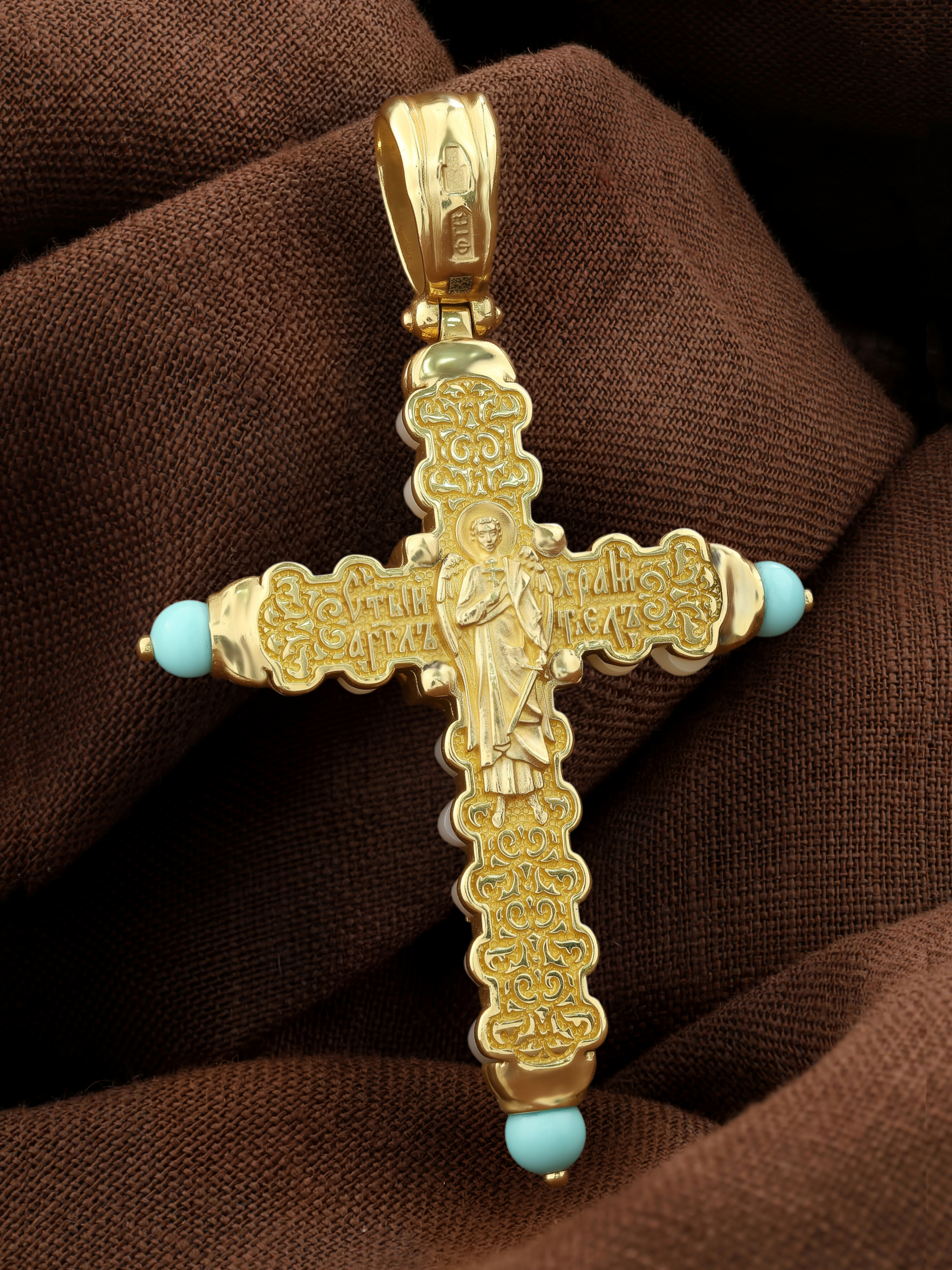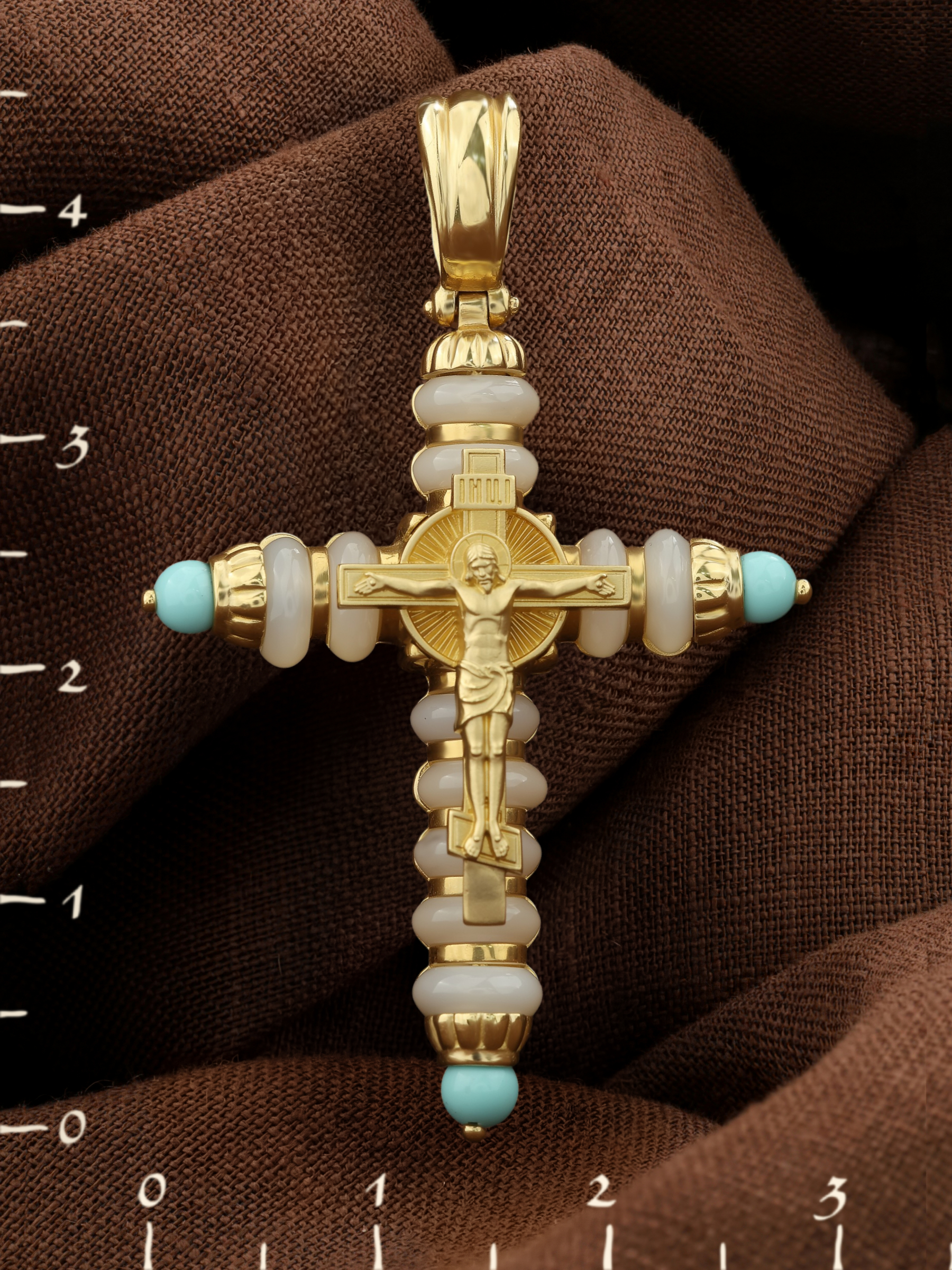 Крест из лимонного золота c бирюзой и кахолонгом
