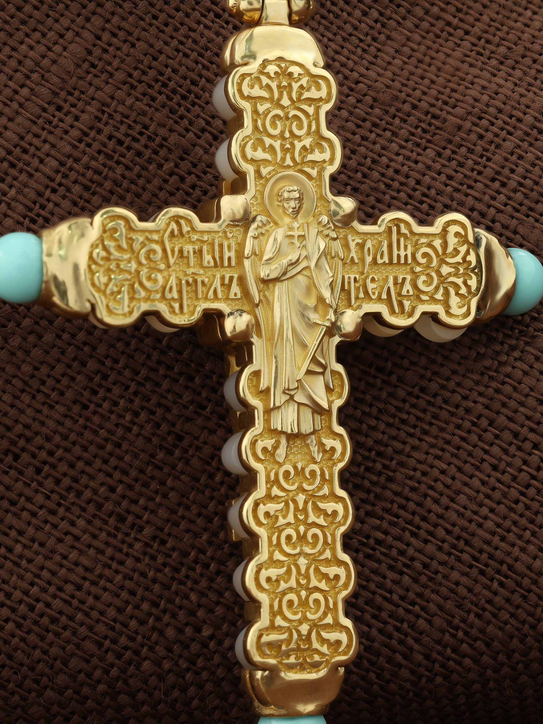 На оборотной стороне креста изображен святой Ангел-Хранитель в виде прекрасного юноши держащего в правой руке крест, а в левой — сферу. Ангел-Хранитель — это Ангел приставляемый Богом к человеку при крещении для охраны и помощи в добрых делах. Невидимо пребывая при нас постоянно, он, руководствуя нас ко спасению, не только по нашему желанию таинственно наставляет нас на все доброе и полезное, не только возносит наши молитвы к Богу, но еще и сам от себя охраняют и защищают нас от врагов видимых и невидимых, ходатайствует за нас пред Богом.