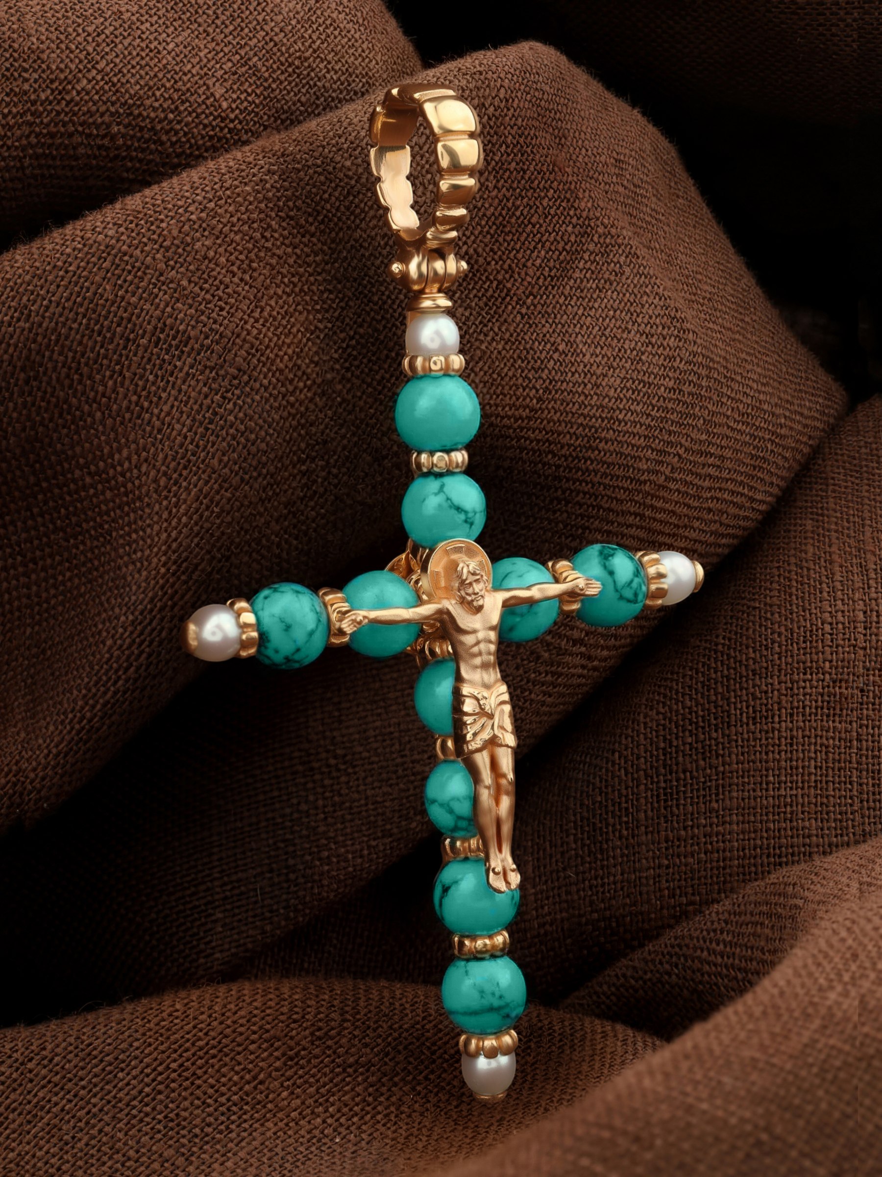 На лицевой стороне креста изображено Распятие Господа и Спасителя нашего Иисуса Христа. Своими крестными страданиями Господь смыл наши грехи, покрыл наш долг перед Богом или, на языке Писания, нас «искупил». В Голгофе сокрыта непостижимая тайна бесконечной правды и любви Бога. Крест стал символом победы добра над злом, жизни над смертью, напоминанием бесконечной Божьей любви, предметом радости. Воплотившийся Сын Божий Своею кровью освятил крест и сделал его проводником Своей благодати, источником освящения верующих. На верхней табличке, выше головы Иисуса, расположена надпись, составленная Понтием Пилатом — «IНЦI». Она означает «Иисус Назорей, Царь Иудейский». Надпись «IC» «ХC», означает Иисус Христос, помещаются на разных сторонах поперечной перекладины креста. Христос в Своей Божественной любви, над которой смерть не властна и которая, страдая, и не страдает в обычном смысле, простирает к людям со Креста Свои объятия, в которые призывается и привлекается весь мир. Поэтому Тело Его не висит, а торжественно покоится на Кресте.