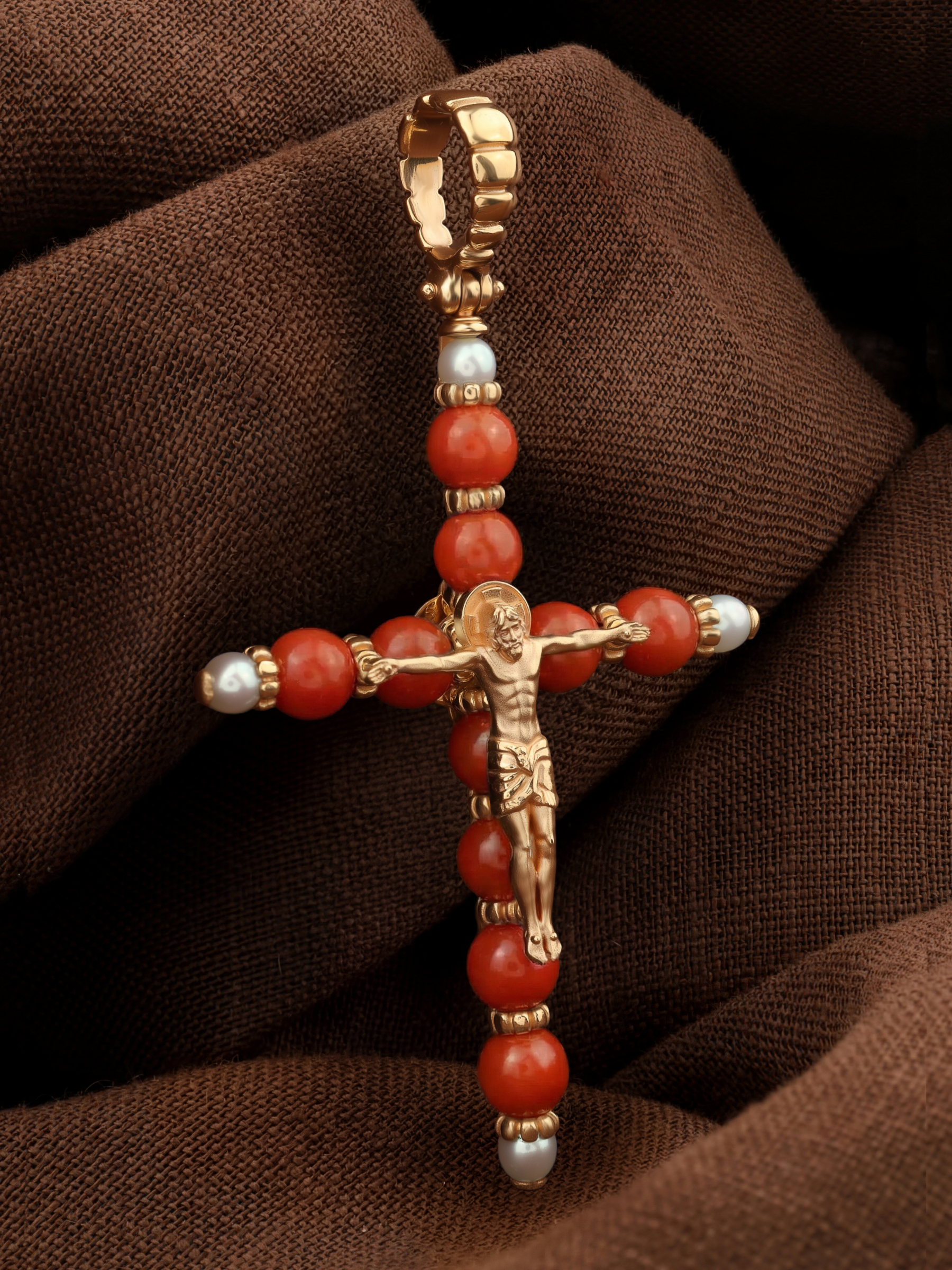 Крест из золота c жемчугом и кораллом