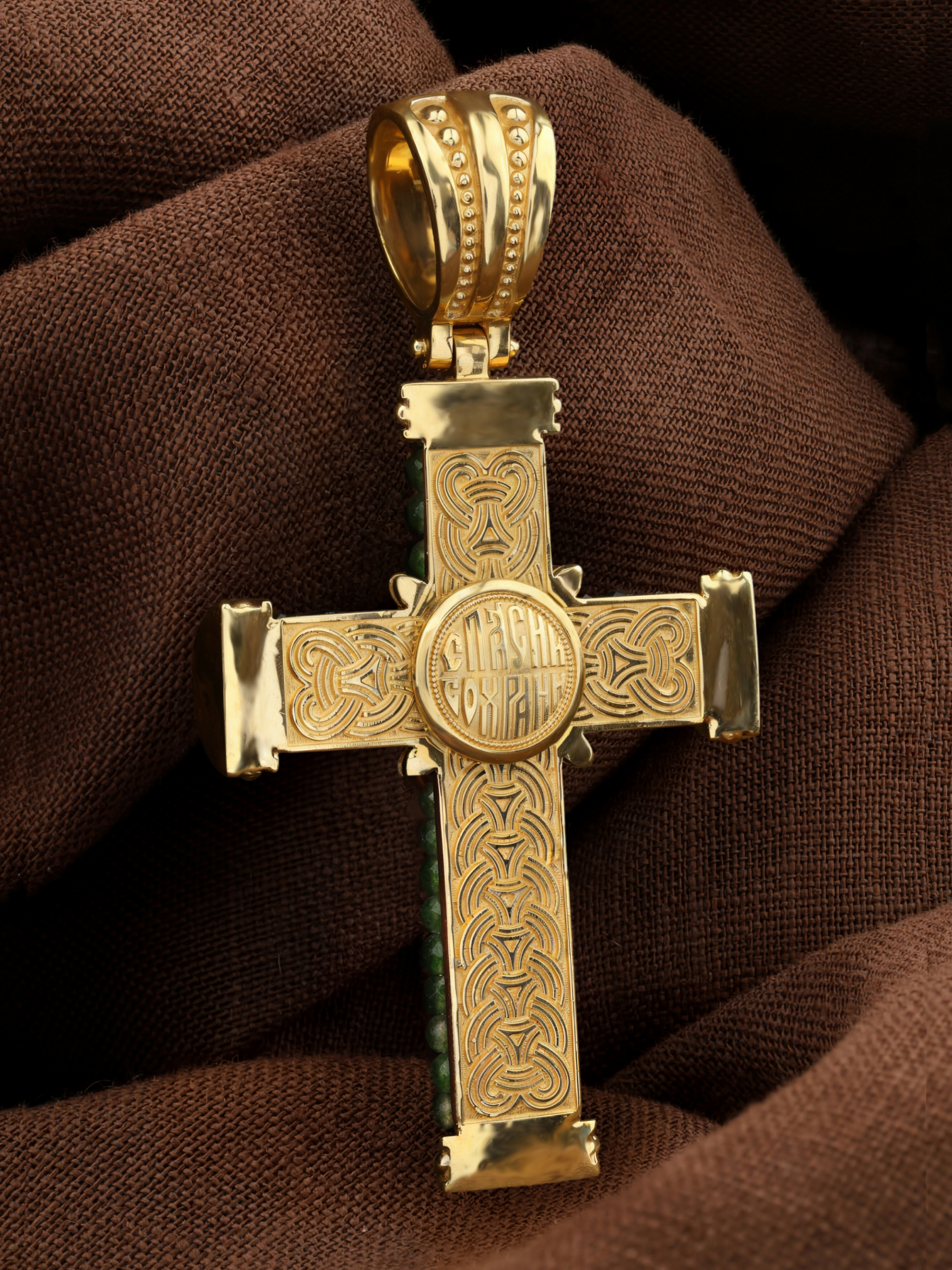 В центрально части оборотной стороны креста написана молитва: «Спаси и сохрани».