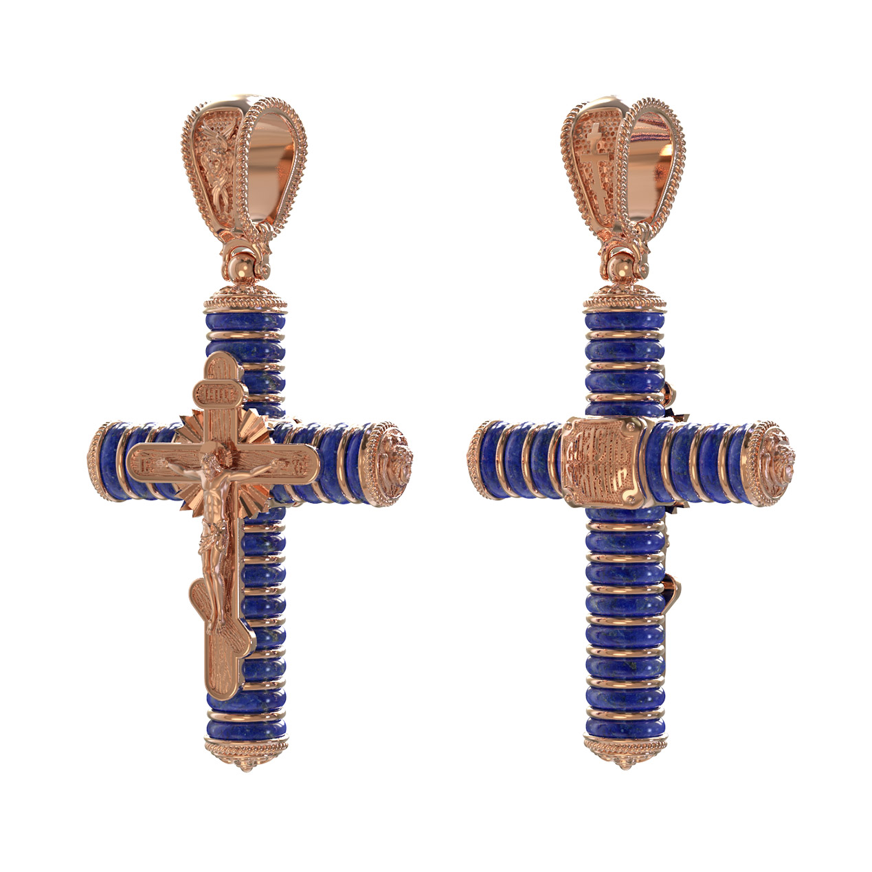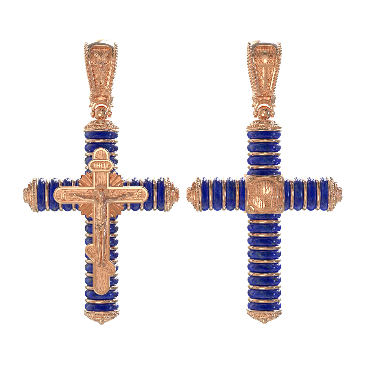 На лицевой стороне креста изображено Распятие Господа и Спасителя нашего Иисуса Христа. Своими крестными страданиями Господь смыл наши грехи, покрыл наш долг перед Богом или, на языке Писания, нас «искупил». В Голгофе сокрыта непостижимая тайна бесконечной правды и любви Бога. Крест стал символом победы добра над злом, жизни над смертью, напоминанием бесконечной Божьей любви, предметом радости. Воплотившийся Сын Божий Своею кровью освятил крест и сделал его проводником Своей благодати, источником освящения верующих. На верхней табличке, выше головы Иисуса, расположена надпись, составленная Понтием Пилатом — «IНЦI». Она означает «Иисус Назорей, Царь Иудейский». Надпись «IC» «ХC», означает Иисус Христос, помещаются на разных сторонах поперечной перекладины креста. Христос в Своей Божественной любви, над которой смерть не властна и которая, страдая, и не страдает в обычном смысле, простирает к людям со Креста Свои объятия, в которые призывается и привлекается весь мир. Поэтому Тело Его не висит, а торжественно покоится на Кресте. На кулонном кольце изображен шестикрылый Серафим. Серафим означает «Пламенный». Горя любовью к Богу, он зажигает огонь этой любви и в сердцах людей.