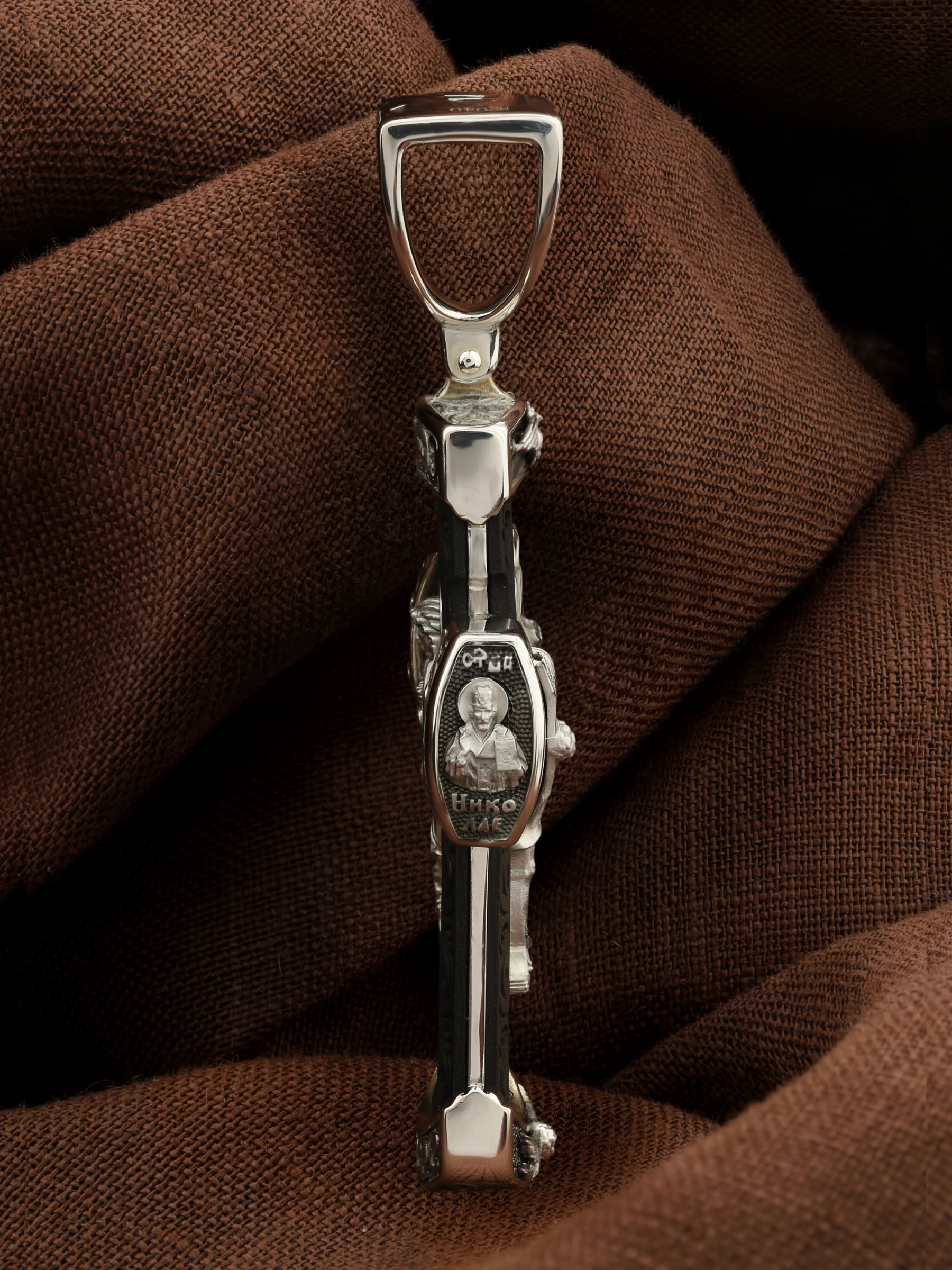 На торце изделия с левой стороны помещена икона Святого Николая Чудотворца — самый почитаемый в Православной Церкви, которого еще называют Николай Угодник за то, что он угодил своей жизнью Богу. Николай Чудотворец, помощник в делах, покровитель учащихся, утешитель обиженных и нуждающихся, целитель самых страшных и тяжелых недугов, предстатель и молитвенник за людей перед Богом. Также Святитель Николай Чудотворец известен своими молитвами за путешественников, когда непрестанный ветер и бушующие волны утихают и корабль заходит в спокойную гавань. На торце изделия с правой стороны — икона Святого Иоанна Крестителя. Святой Иоанн был последним пророком Израиля. Он призывал к покаянию, предвозвещая приближение Царствия Небесного (Мф. 3, 2), и удостоился стать Крестителем Христа. Иисус Христос говорит о нем: «Сей есть о котором написано: «Вот, Я посылаю Ангела Моего пред лицем Твоим, который приготовит путь Твой пред Тобою» (Лк. 7, 27). И еще: «Из рожденных женами нет ни одного пророка больше Иоанна Крестителя» (Лк. 7, 28).