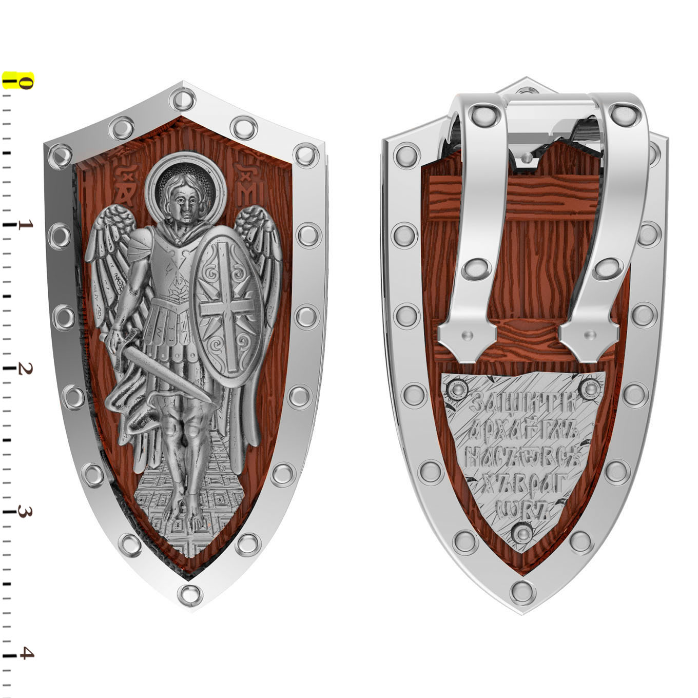 На оборотной стороне образка написаны слова молитвы: «Защити Архангел нас от всех врагов».