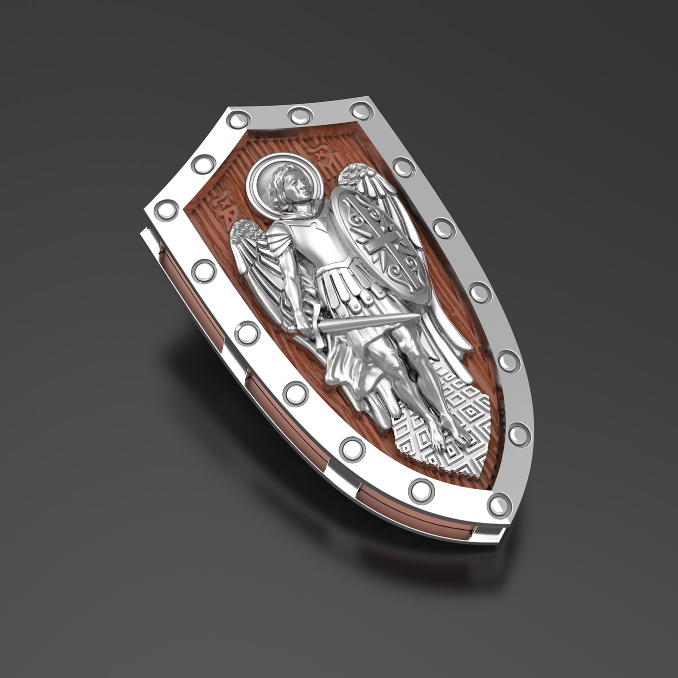 На лицевой стороне образка изображение Архангела Михаила — верного служителя Божия, который низринул с Неба возгордившегося денницу с другими павшими духами. В Православии его называют Архистратигом, что означает глава святого воинства Ангелов и Архангелов. Образок сделан в виде воинского щита. Архангел Михаил изображен в воинственном виде с огненным мечом в правой руке и щитом в левой. Архангел почитается как покровитель воинов и всех верных Богу и ведущих борьбу против сил зла, борец против ересей, а также защитник душ умерших, страж райских врат. С древних времен прославлен своими чудесами Архангел Михаил на Руси. Примеров явления и помощи Архистратига Михаила в русской истории бессчетно. Архангел Михаил не перестает ратоборствовать за славу Творца и Господа всяческих, за дело спасения рода человеческого, за церковь и чад ее. И, согласно, Откровению Иоанна Богослова во время последней битвы небесных и дьявольских сил Михаил и его ангелы опять низвергнут Люцифера вместе с его войском: «Михаил и Ангелы его воевали против дракона, и дракон и ангелы его воевали [против них], но не устояли, и не нашлось уже для них места на небе. И низвержен был великий дракон, древний змий, называемый диаволом и сатаною, обольщающий всю вселенную, низвержен на землю, и ангелы его низвержены с ним» (Откр.12:7−9).