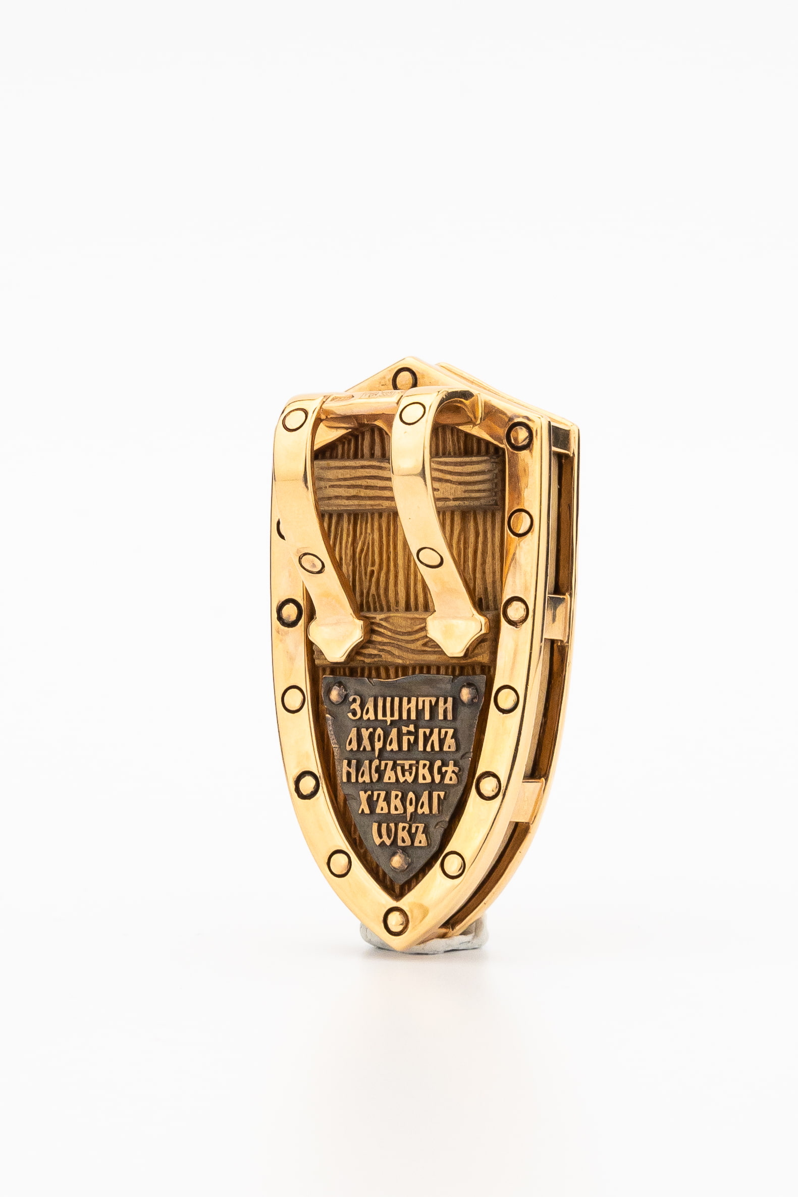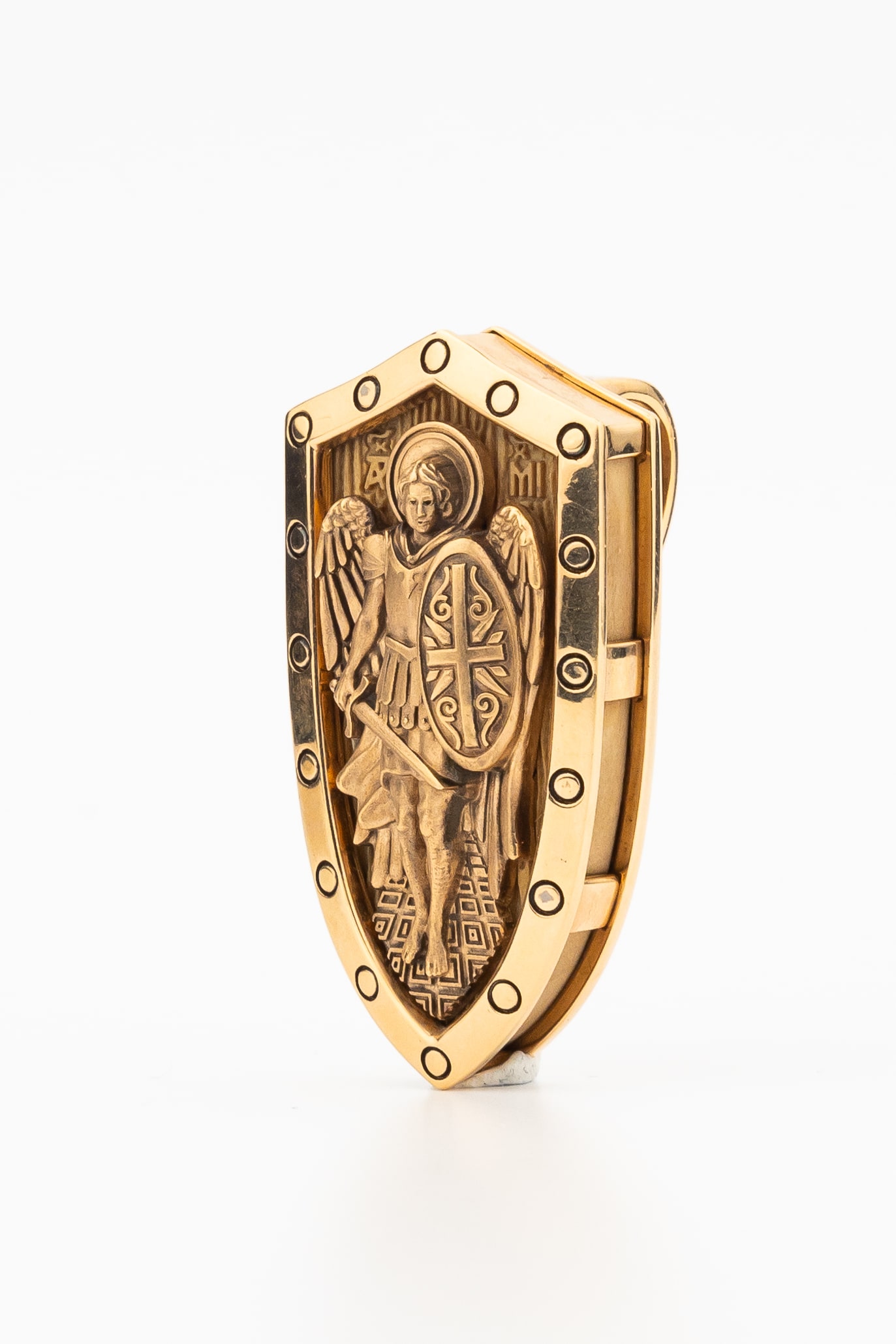 На лицевой стороне образка изображение Архангела Михаила — верного служителя Божия, который низринул с Неба возгордившегося денницу с другими павшими духами. В Православии его называют Архистратигом, что означает глава святого воинства Ангелов и Архангелов. Образок сделан в виде воинского щита. Архангел Михаил изображен в воинственном виде с огненным мечом в правой руке и щитом в левой. Архангел почитается как покровитель воинов и всех верных Богу и ведущих борьбу против сил зла, борец против ересей, а также защитник душ умерших, страж райских врат. С древних времен прославлен своими чудесами Архангел Михаил на Руси. Примеров явления и помощи Архистратига Михаила в русской истории бессчетно. Архангел Михаил не перестает ратоборствовать за славу Творца и Господа всяческих, за дело спасения рода человеческого, за церковь и чад ее. И, согласно, Откровению Иоанна Богослова во время последней битвы небесных и дьявольских сил Михаил и его ангелы опять низвергнут Люцифера вместе с его войском: «Михаил и Ангелы его воевали против дракона, и дракон и ангелы его воевали [против них], но не устояли, и не нашлось уже для них места на небе. И низвержен был великий дракон, древний змий, называемый диаволом и сатаною, обольщающий всю вселенную, низвержен на землю, и ангелы его низвержены с ним» (Откр.12:7−9).