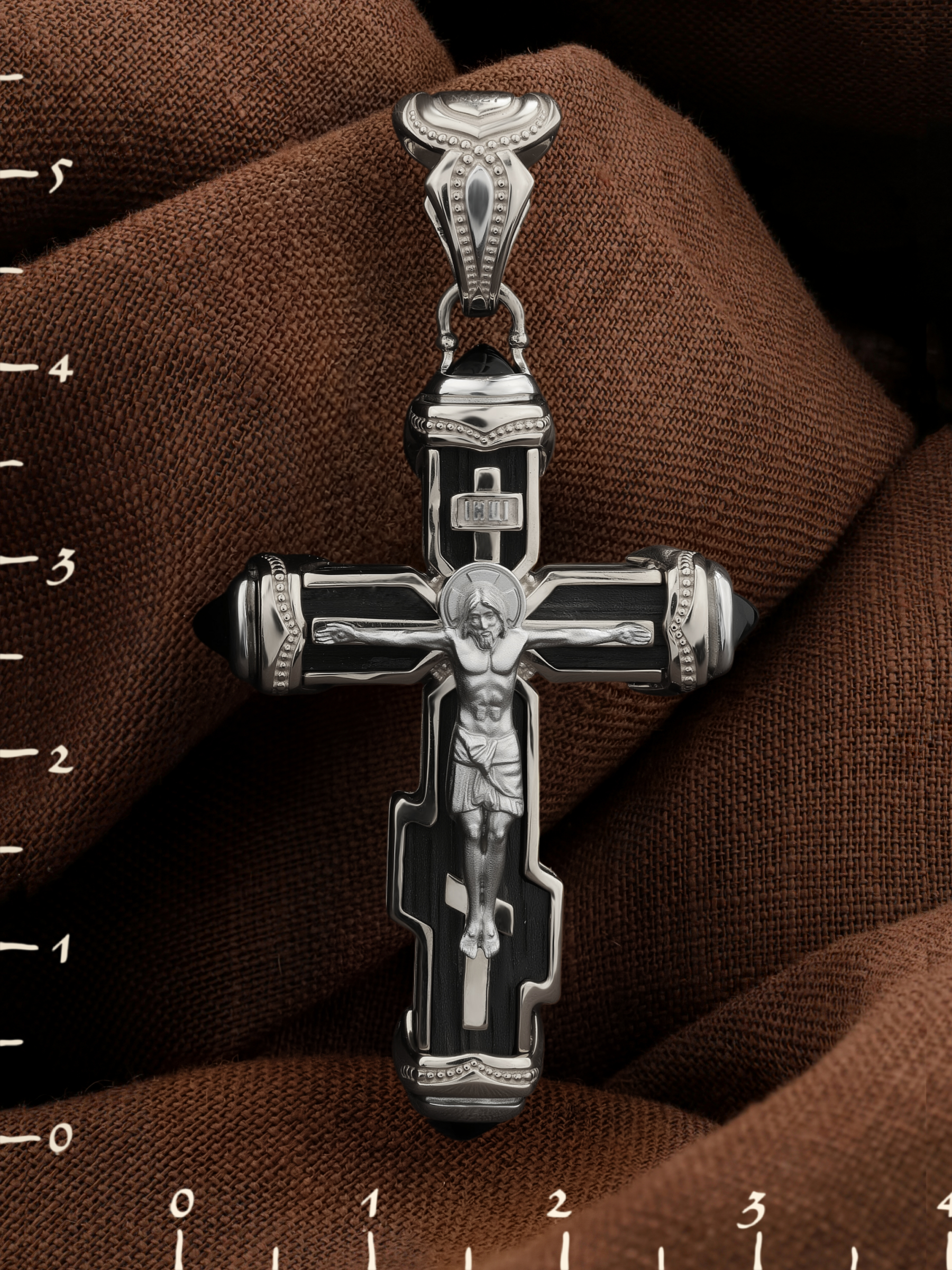 На лицевой стороне креста изображено Распятие Господа и Спасителя нашего Иисуса Христа. Своими крестными страданиями Господь смыл наши грехи, покрыл наш долг перед Богом или, на языке Писания, нас «искупил». В Голгофе сокрыта непостижимая тайна бесконечной правды и любви Бога. Крест стал символом победы добра над злом, жизни над смертью, напоминанием бесконечной Божьей любви, предметом радости. Воплотившийся Сын Божий Своею кровью освятил крест и сделал его проводником Своей благодати, источником освящения верующих. На верхней табличке, выше головы Иисуса, расположена надпись, составленная Понтием Пилатом — «IНЦI». Она означает «Иисус Назорей, Царь Иудейский». Надпись «IC» «ХC», означает Иисус Христос, помещаются на разных сторонах поперечной перекладины креста. Христос в Своей Божественной любви, над которой смерть не властна и которая, страдая, и не страдает в обычном смысле, простирает к людям со Креста Свои объятия, в которые призывается и привлекается весь мир. Поэтому Тело Его не висит, а торжественно покоится на Кресте.