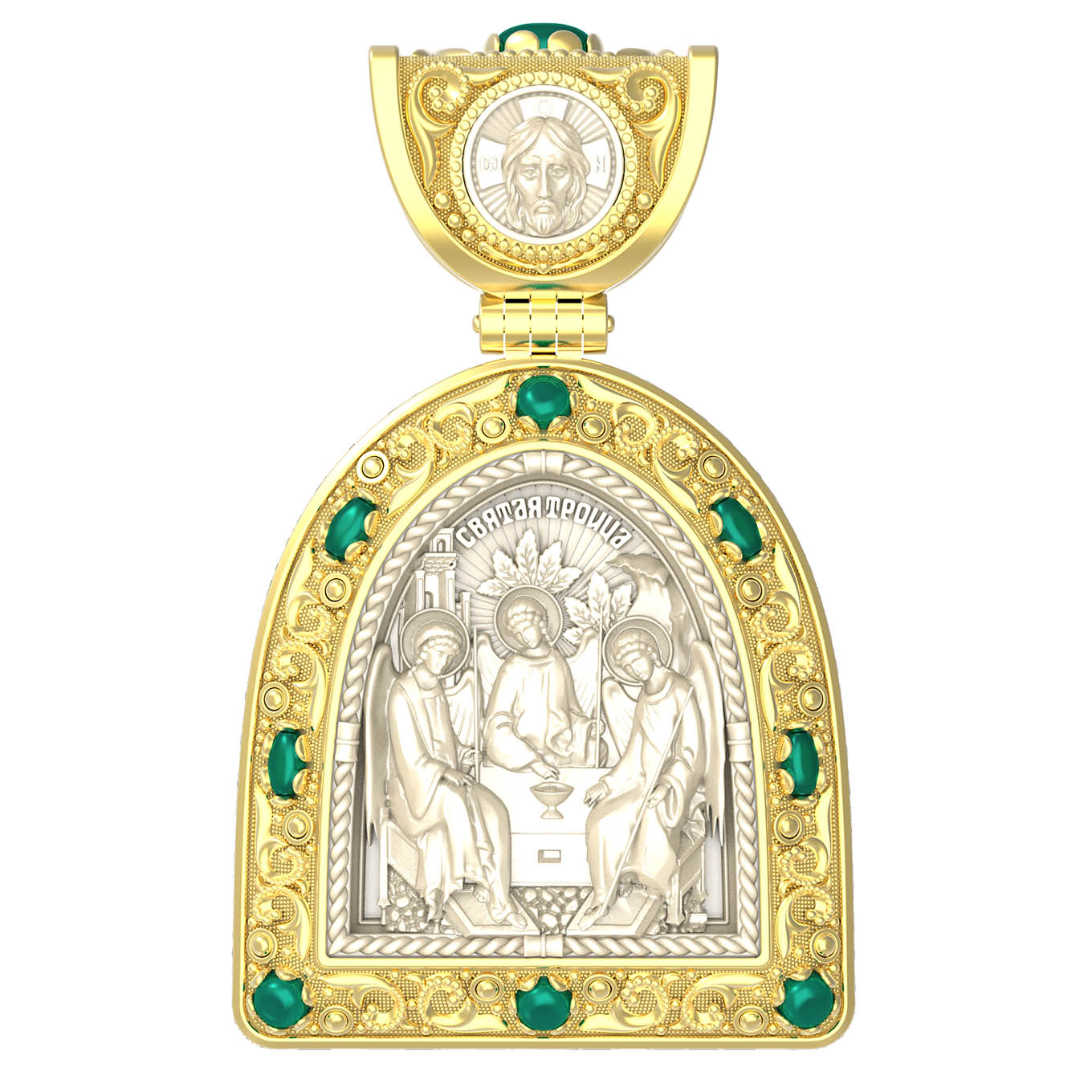 Основой композиции лицевой стороны является икона Святой Троицы.
