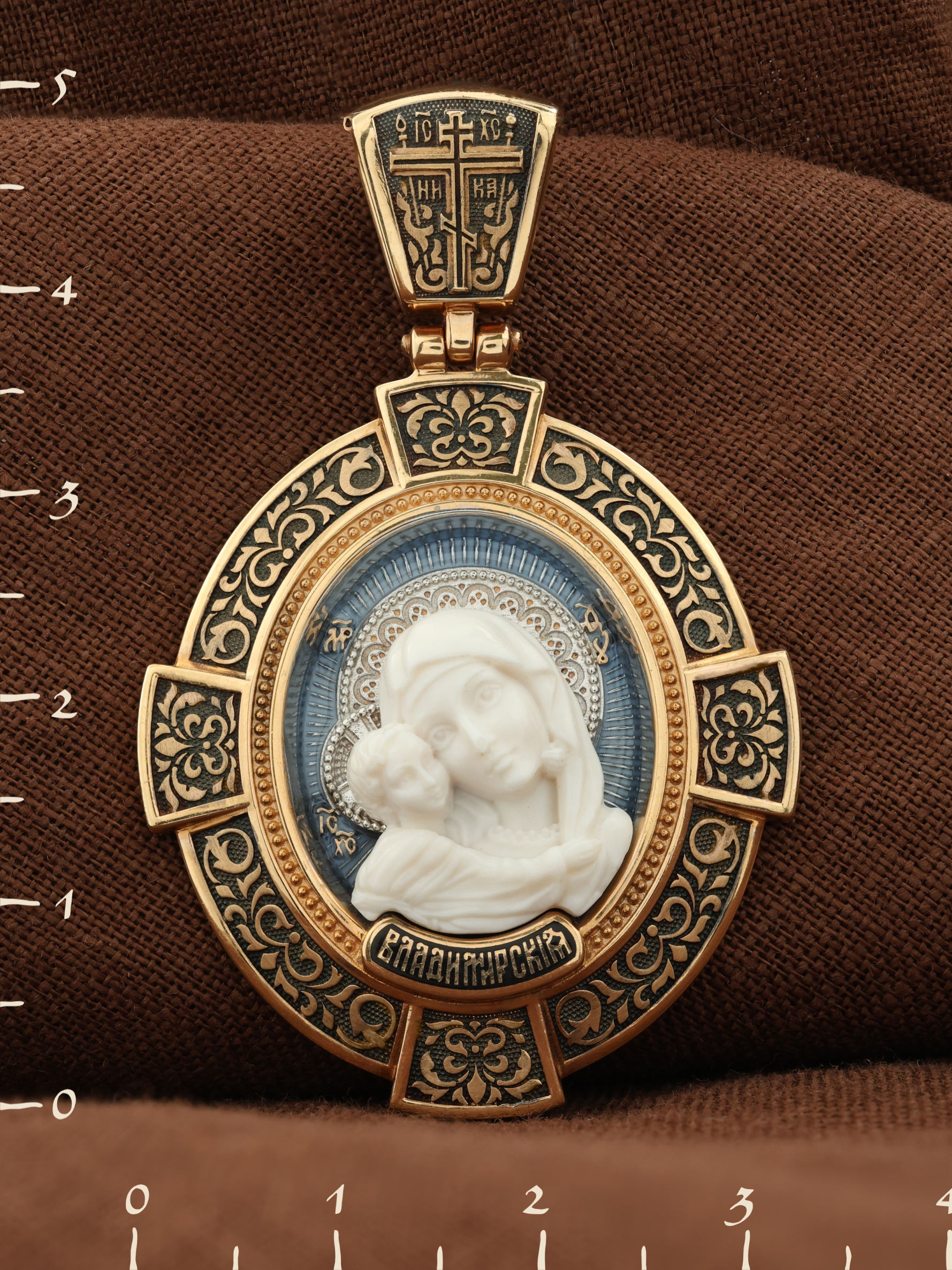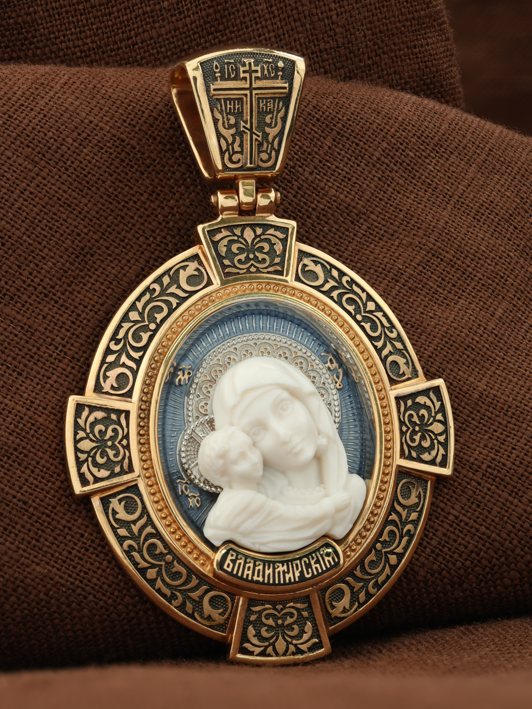На лицевой стороне образка изображена Владимирская икона Божией Матери — одна из самых чтимых святынь Русской православной церкви. По преданию, икона была написана Святым апостолом и евангелистом Лукой во время земной жизни Богородицы. Дева Мария, увидев Свое изображение, молвила: «Отныне ублажат Мя вси роди. Благодать Рождшегося от Меня и Моя с сим образом да будет». Образ написан в лирическом иконографическом типе «Умиление». Младенец припал щекой к щеке Матери и тянется к ней правой рукой, другой нежно обнимая за шею. Икона вплоть до V века находилась в Иерусалиме, затем была перевезена в Византию. На Русь икона была привезена в 1131 г. За прошедшие столетия святыня неоднократно переезжала из Владимира в Москву и обратно, не раз спасая страну от захватчиков. Русская Православная Церковь установила троекратное празднование Владимирской иконе Божьей Матери. Каждый из дней празднования связан с избавлением русского народа от порабощения иноплеменниками по молитвам ко Пресвятой Богородице. В последующие века у иконы происходили многие важные исторические события: подписание актов, принятие присяги значимых государственных деятелей и возведение на престол. На кулонном кольце изображен Спас Нерукотворный — образ Господа и Спасителя нашего Иисуса Христа, чудесно отпечатавшийся на плате, котором Христос вытер свой лик.