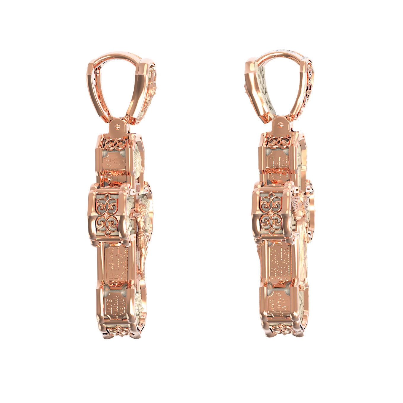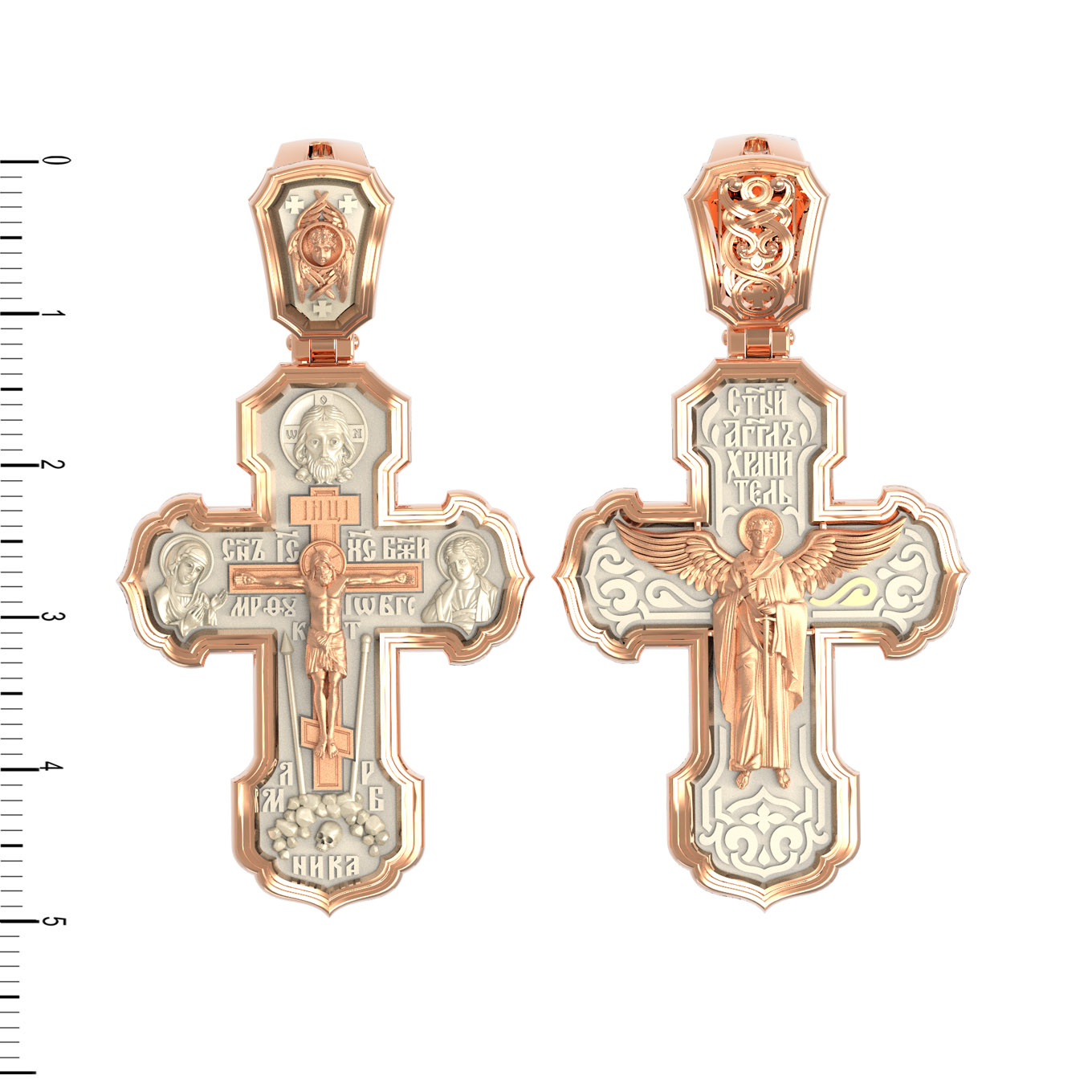 На лицевой стороне креста изображено Распятие Господа и Спасителя нашего Иисуса Христа. Крест- символ спасения и искупления рода человеческого, знамение победы над смертью и адом. Иисус Христос, как искупительная жертва освобождения человечества от власти греха, умер крестной смертью и в третий день воскрес. На верхней табличке, выше головы Иисуса, расположена надпись, составленная Понтием Пилатом — «IНЦI». Она означает «Иисус Назорей, Царь Иудейский». Надпись «IС» « ХС» означает Иисус Христос и помещается на разных сторонах поперечной (большой) перекладины креста. Рядом расположена надпись «Сын Божий». Выше Распятия изображен Нерукотворный образ Господа и Спасителя нашего Иисуса Христа. Слева от Распятия изображена Пресвятая Богородица, справа — апостол и евангелист Иоанн Богослов, один из ближайших учеников Иисуса Христа. Крест стоит на горе камней, символизирующих Голгофу. В ее основании различается череп — это голова Адама. Вдоль креста изображены копие сотника Лонгина и трость с губкой и буквы «К» и «Т». Надпись «МЛРБ» — «место лобное рай бысть» означает, что место лобное стало раем и помещаются в нижней части креста. Рядом — слово «НИКА», что означает «победитель». На православном кресте Христос не умирает, а свободно простирает руки, ладони Иисуса открыты, будто он хочет обнять все человечество, даря им свою любовь и открывая путь к вечной жизни. На кулонном кольце изображен шестикрылый Серафим.