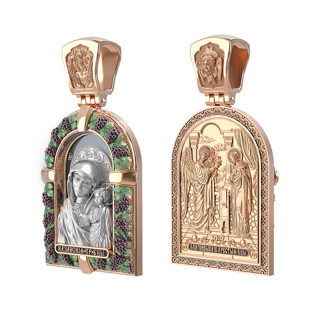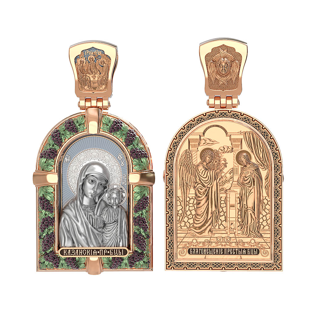 Казанская икона Божией Матери — одна из самых почитаемых в России чудотворных икон Богородицы. Богословское значение Казанской иконы — указать верующим истинный Путь к спасению, который лежит через Христа. Только Божия Матерь имеет настолько сильное дерзновение к Спасителю, что может ходатайствовать перед Ним за всех верных. Именно этот образ дарится новой повенчанной паре, как хранитель очага и семейная реликвия. Молитва перед Казанской иконой Божьей Матери помогает во всех сложных случаях жизни, в болезнях, во всех печалях, невзгодах, скорбях. Уникальная история появления, чудеса, случившиеся по молитвам православных людей возле образа — все это делает Казанскую Богородицу особенной, среди тысяч других икон. Вверху — икона Святой Троицы, на которой запечатлено явление Триединого Бога праотцу Аврааму в виде трех ангелов. Образок обвивает виноградная лоза — один из самых распространенных символических образов христианства. Она является символом Иисуса Христа, Который в Евангелии говорит о Себе: «Я есмь истинная виноградная лоза, и Отец мой — виноградарь». (Ин. 15:1). Поэтому именно из винограда изготавливается вино для Причастия, призванное символизировать Кровь Христову.