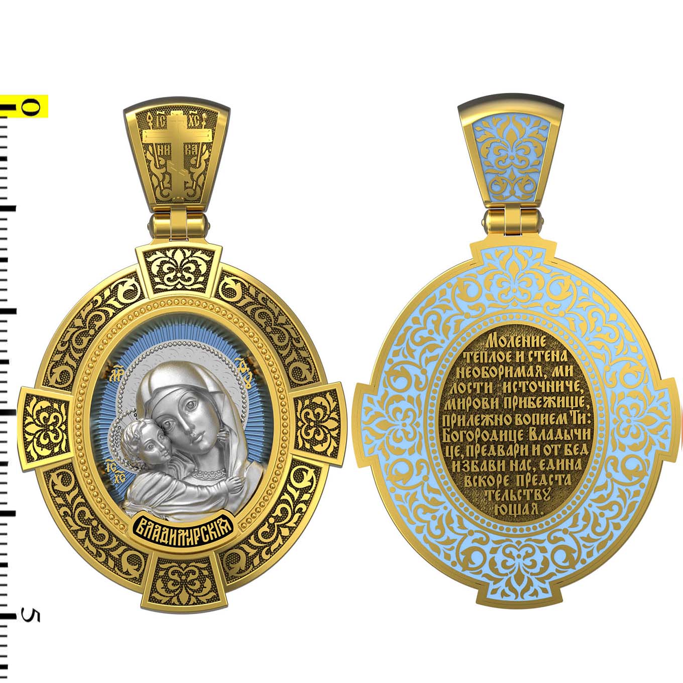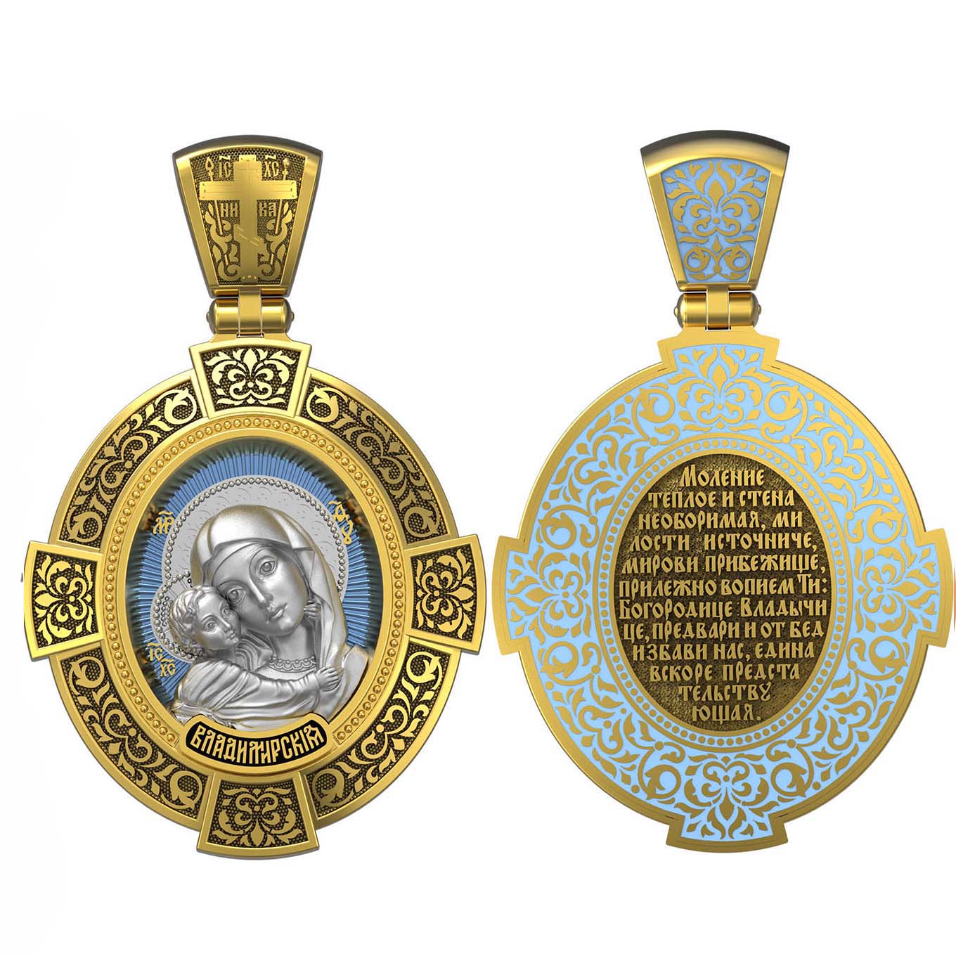 На лицевой стороне образка изображена Владимирская икона Божией Матери — одна из самых чтимых святынь Русской православной церкви. По преданию, икона была написана Святым апостолом и евангелистом Лукой во время земной жизни Богородицы. Дева Мария, увидев Свое изображение, молвила: «Отныне ублажат Мя вси роди. Благодать Рождшегося от Меня и Моя с сим образом да будет». Образ написан в лирическом иконографическом типе «Умиление». Младенец припал щекой к щеке Матери и тянется к ней правой рукой, другой нежно обнимая за шею. Икона вплоть до V века находилась в Иерусалиме, затем была перевезена в Византию. На Русь икона была привезена в 1131 г. За прошедшие столетия святыня неоднократно переезжала из Владимира в Москву и обратно, не раз спасая страну от захватчиков. Русская Православная Церковь установила троекратное празднование Владимирской иконе Божьей Матери. Каждый из дней празднования связан с избавлением русского народа от порабощения иноплеменниками по молитвам ко Пресвятой Богородице. В последующие века у иконы происходили многие важные исторические события: подписание актов, принятие присяги значимых государственных деятелей и возведение на престол. На кулонном кольце изображен Спас Нерукотворный — образ Господа и Спасителя нашего Иисуса Христа, чудесно отпечатавшийся на плате, котором Христос вытер свой лик.