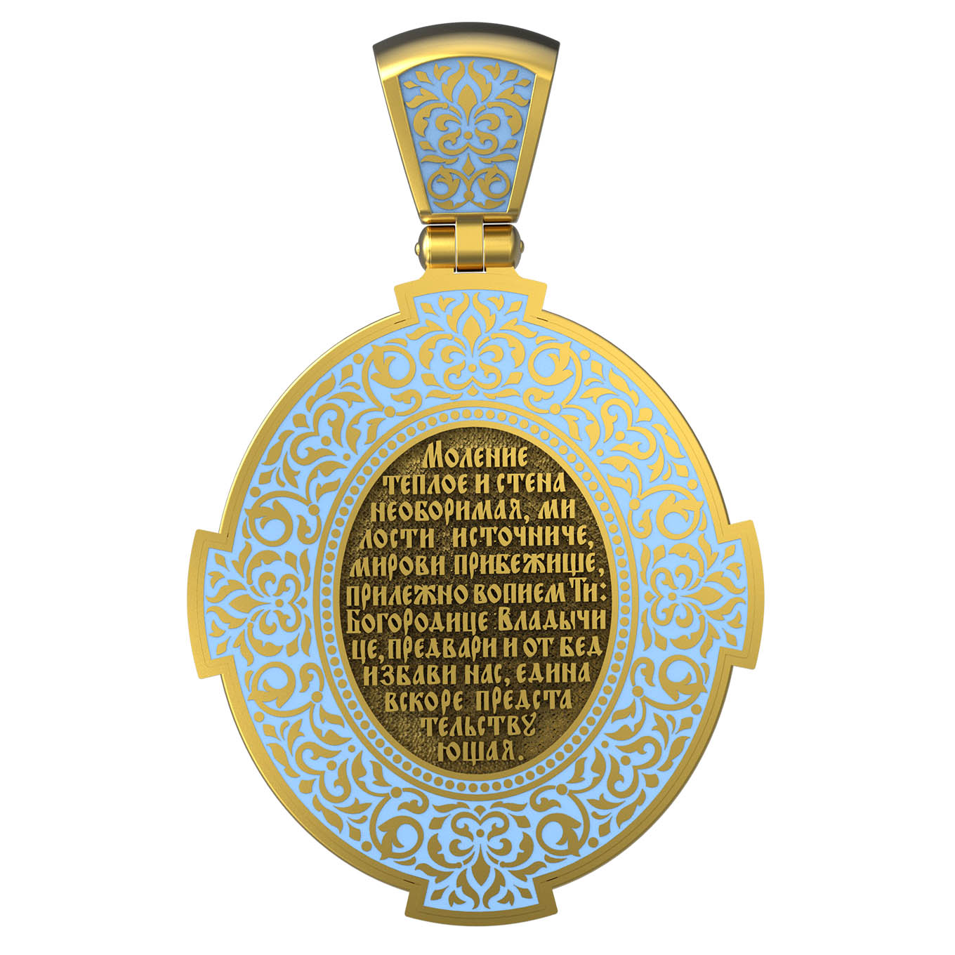 На оборотной стороне образка изображена молитва " Моление теплое и стена необоримая, милости источниче, мирови прибежище, прилежно вопием Ти: Богородице Владычице, предвари, и от бед избави нас, Едина вскоре Предстательствующая».
