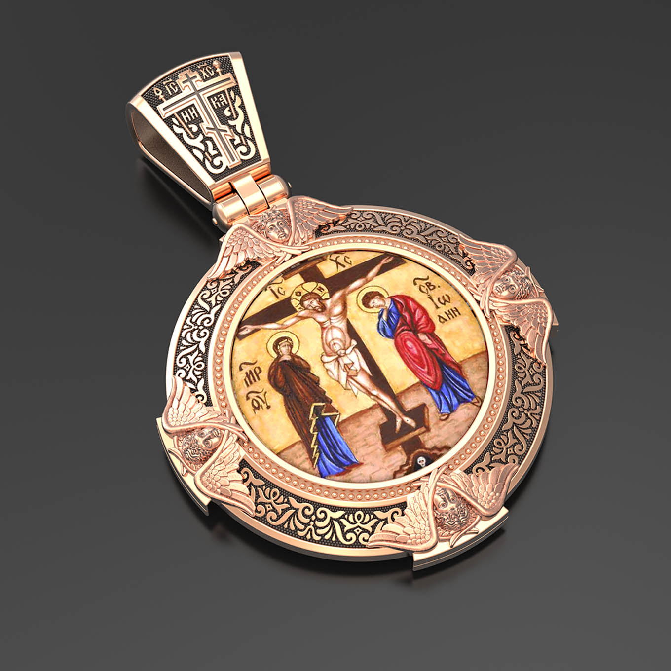 На лицевой стороне образка изображено Распятие Господа и Спасителя нашего Иисуса Христа. Своими крестными страданиями Господь смыл наши грехи, покрыл наш долг перед Богом или, на языке Писания, нас «искупил». В Голгофе сокрыта непостижимая тайна бесконечной правды и любви Бога. Крест стал символом победы добра над злом, жизни над смертью, напоминанием бесконечной Божьей любви, предметом радости. Воплотившийся Сын Божий Своею кровью освятил крест и сделал его проводником Своей благодати, источником освящения верующих. На верхней табличке, выше головы Иисуса, расположена надпись, составленная Понтием Пилатом — «IНЦI». Она означает «Иисус Назорей, Царь Иудейский». Ниже перекладины написано сокращенно имя Спасителя «IC» «XC» — Иисус Христос. Крест стоит на горе камней, символизирующих Голгофу. Под подножием Креста изображена покоящаяся голова (череп) Адама. Слева от Распятия стоят оплакивающие Господа Пресвятая Богородица и святая мироносица Мария Клеопова. Справа — апостол и евангелист Иоанн Богослов, один из ближайших учеников Иисуса Христа и сотник Лонгин с крестом в правой руке и копьем — в левой. По преданию, увидя, что они горько плачут, Иисус сказал Матери Своей: «Жено! Се сын Твой!» Потом сказал ученику Иоанну: «Се мати твоя». С этого времени Иоанн взял Матерь Божию к себе, и Она жила в его доме до самой смерти.