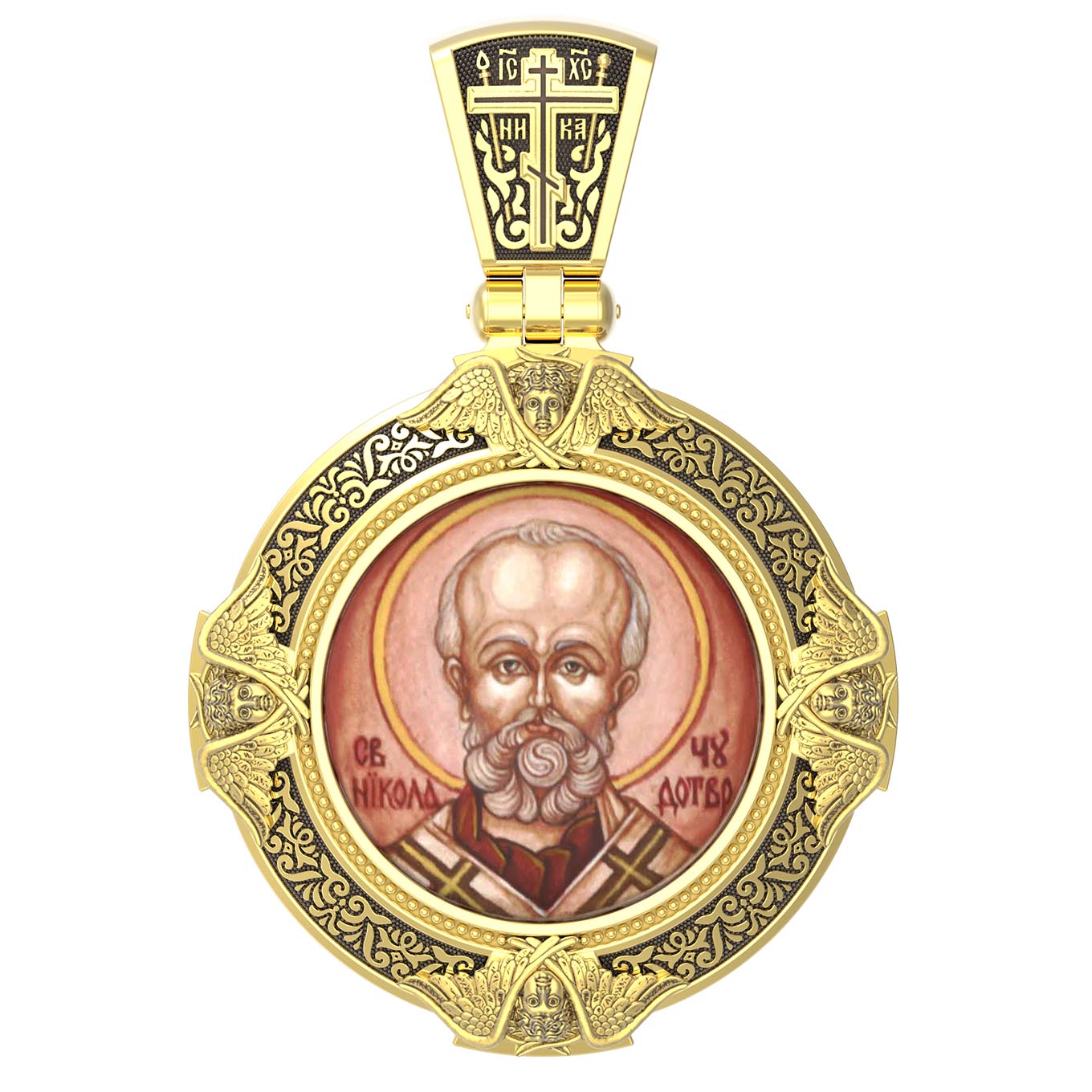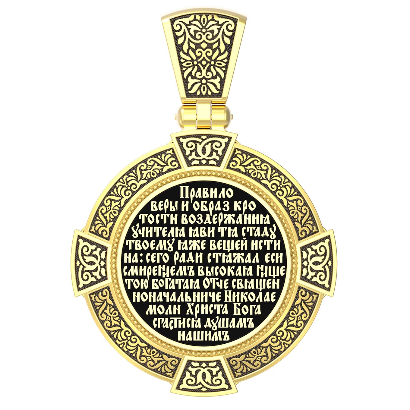 Лицевую сторону возглавляет икона Святителя Николая Чудотворца. Живший в III веке епископ Ликийского города Миры — самый почитаемый святой не только в России, но и во всем мире. Николай Чудотворец, помощник в делах, покровитель учащихся, утешитель обиженных и нуждающихся, целитель самых страшных и тяжелых недугов, предстатель и молитвенник за людей перед Богом. Также Святитель Николай Чудотворец известен своими молитвами за путешественников, когда непрестанный ветер и бушующие волны утихают и корабль заходит в спокойную гавань.