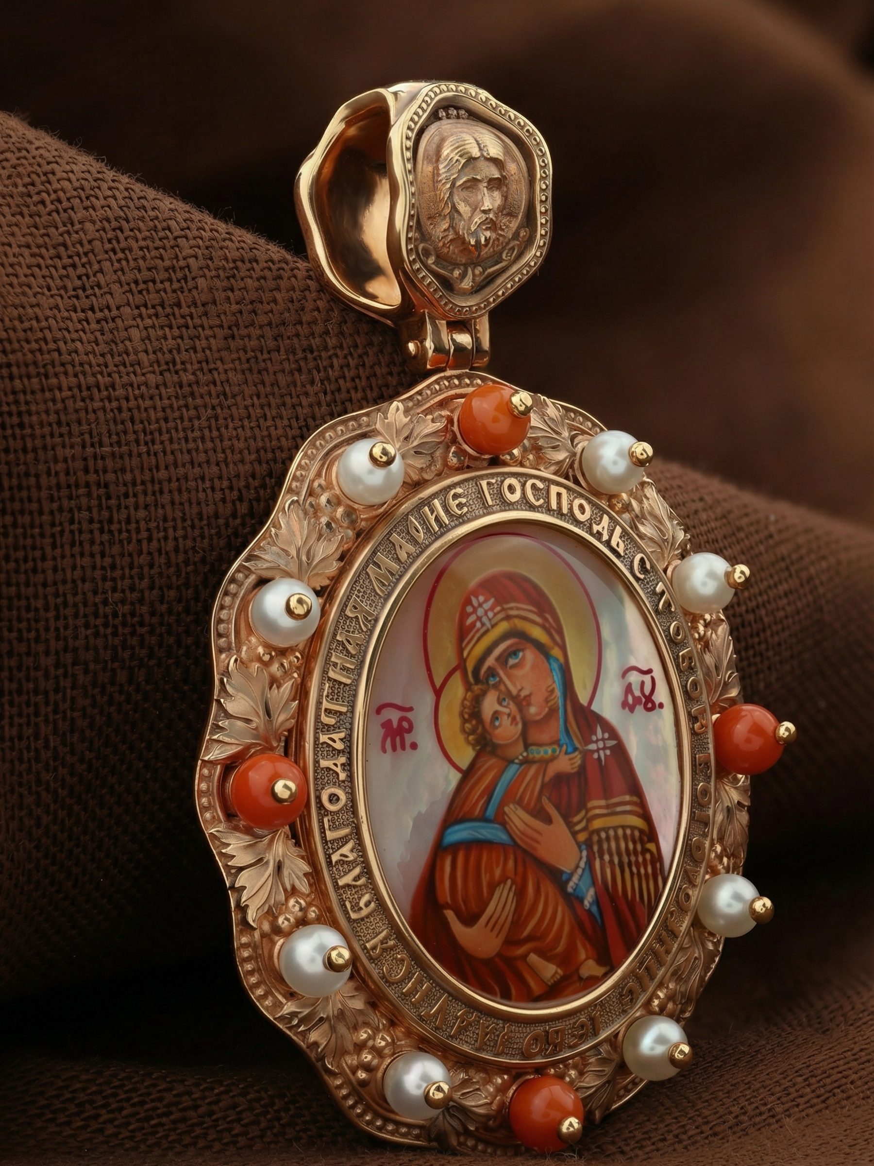 Образок из золота c эмаль, жемчугом, кораллом и перламутром