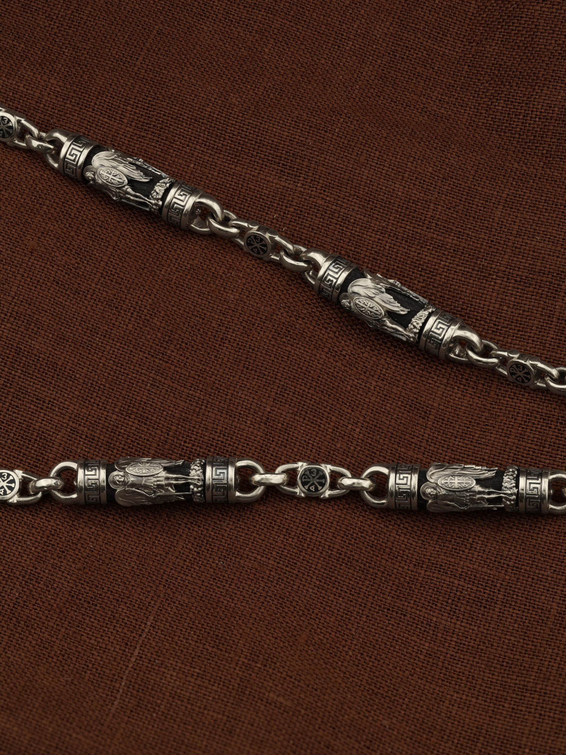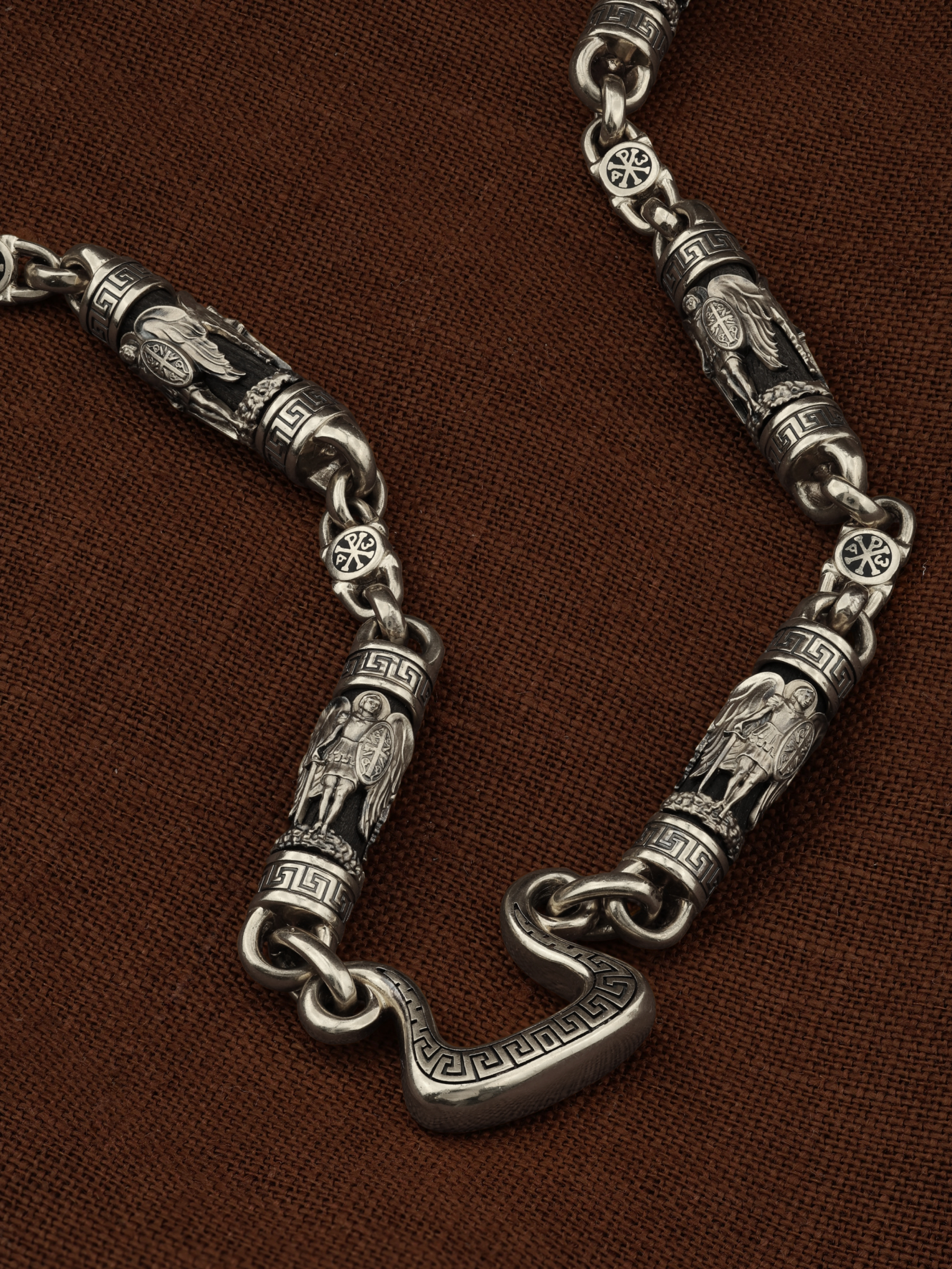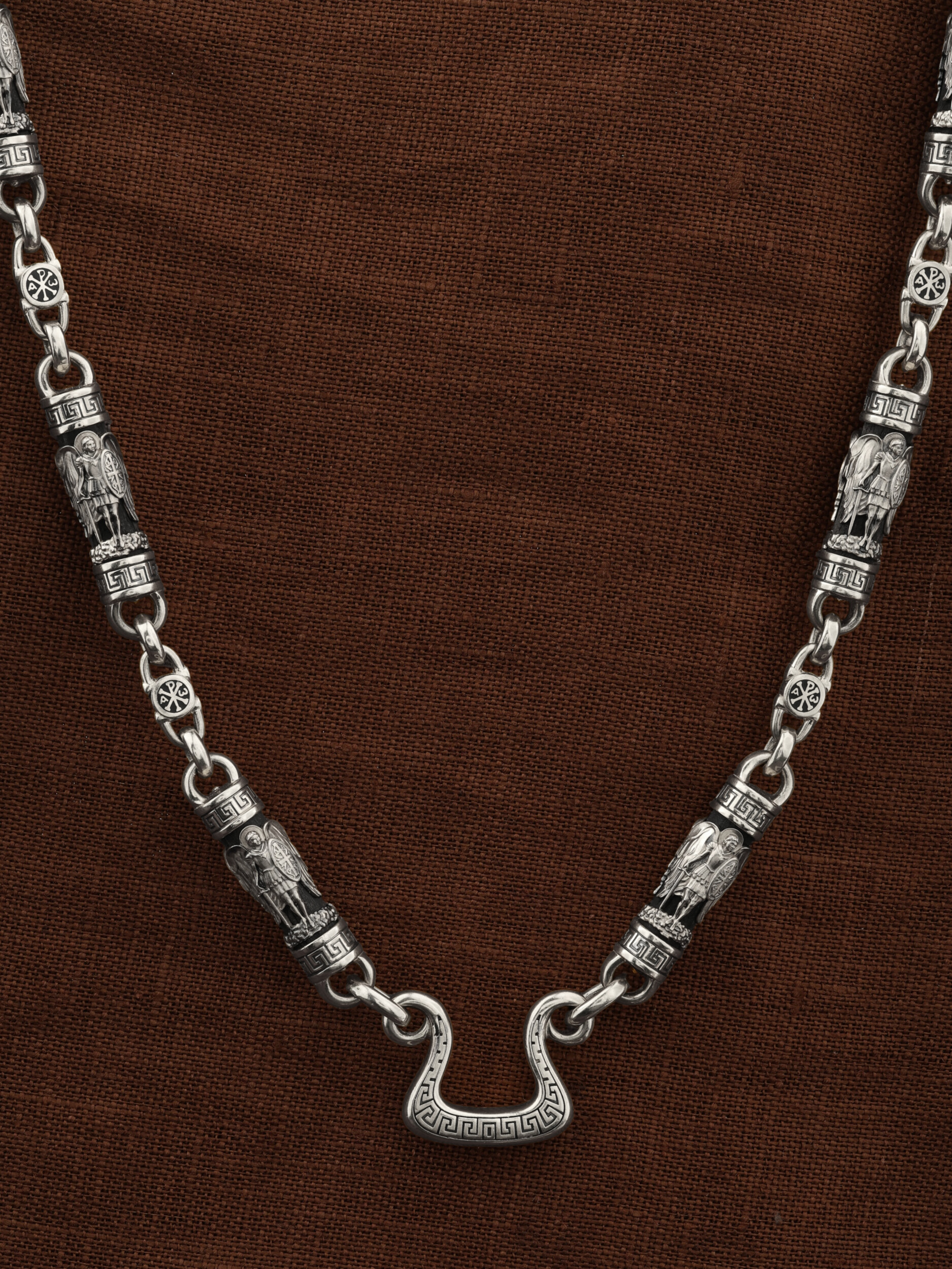 На звеньях цепи изображена Хризма — монограмма имени Христа, которая состоит из двух начальных греческих букв имени  — Х (хи) и Р (ро), скрещённых между собой. По краям монограммы помещены греческие буквы a и w. Такое употребление этих букв восходит к тексту Апокалипсиса: «Аз есмь Альфа и Омега, начало и конец, говорит Господь, Который есть и был и грядет, Вседержитель.» (Откр. 1:8; см. также Откр. 22:13). Также на звеньях изображен Святой Ангел-Хранитель в виде прекрасного юноши держащего в правой руке мечь, а в левой — щит. Ангел-Хранитель — это Ангел приставляемый Богом к человеку при крещении для охраны и помощи в добрых делах. Он невидимо находится при человеке на протяжении всей его жизни, если человек сохраняет в себе любовь к Богу и истинную веру перед Ним. Ангел-Xранитель делают для нас все, что служит к истинному нашему благу и спасению. Невидимо пребывая при нас постоянно, он, руководствуя нас ко спасению, не только по нашему желанию таинственно наставляет нас на все доброе и полезное, не только возносит наши молитвы к Богу, но еще и сам от себя охраняют и защищают нас от врагов видимых и невидимых и ходатайствует за нас пред Богом. Ангел-Хранитель так любит нас, как никто на земле любить не может. Одного лишь каждому из нас он желает — спасения души; к этому он направляет все свои заботы. И если видит нас также заботящимися о спасении, радуется, если же видит нас пребывающими в нерадении о душе своей, скорбит. Но и самый великий грешник может примириться со своим Ангелом-Хранителем посредством искреннего раскаяния в грехах и оставления их навсегда. В таком случае, по слову Писания, великая радость бывает для всех ангелов на небесах (Лк. 15:10). Цепь украшена орнаментом.