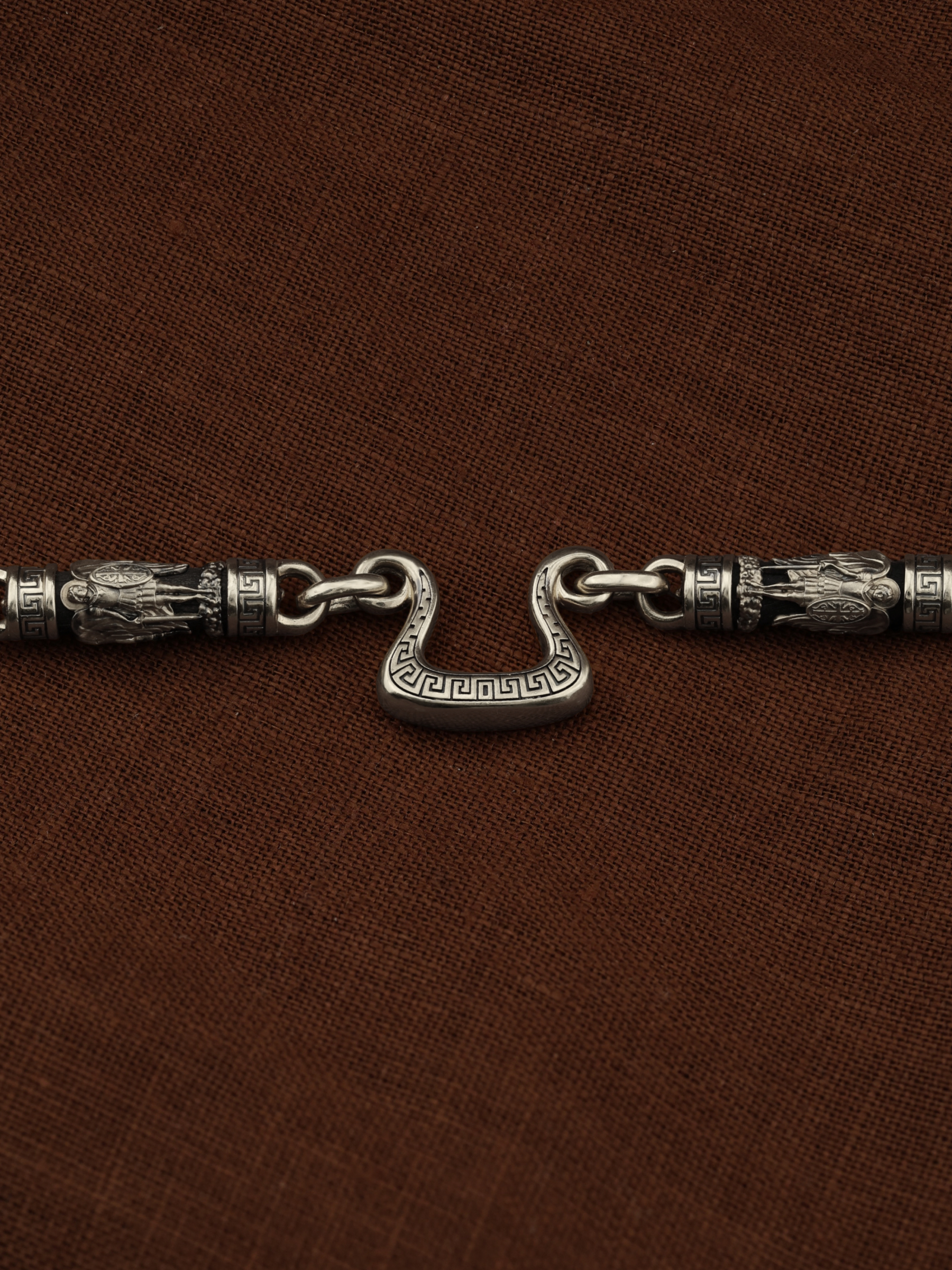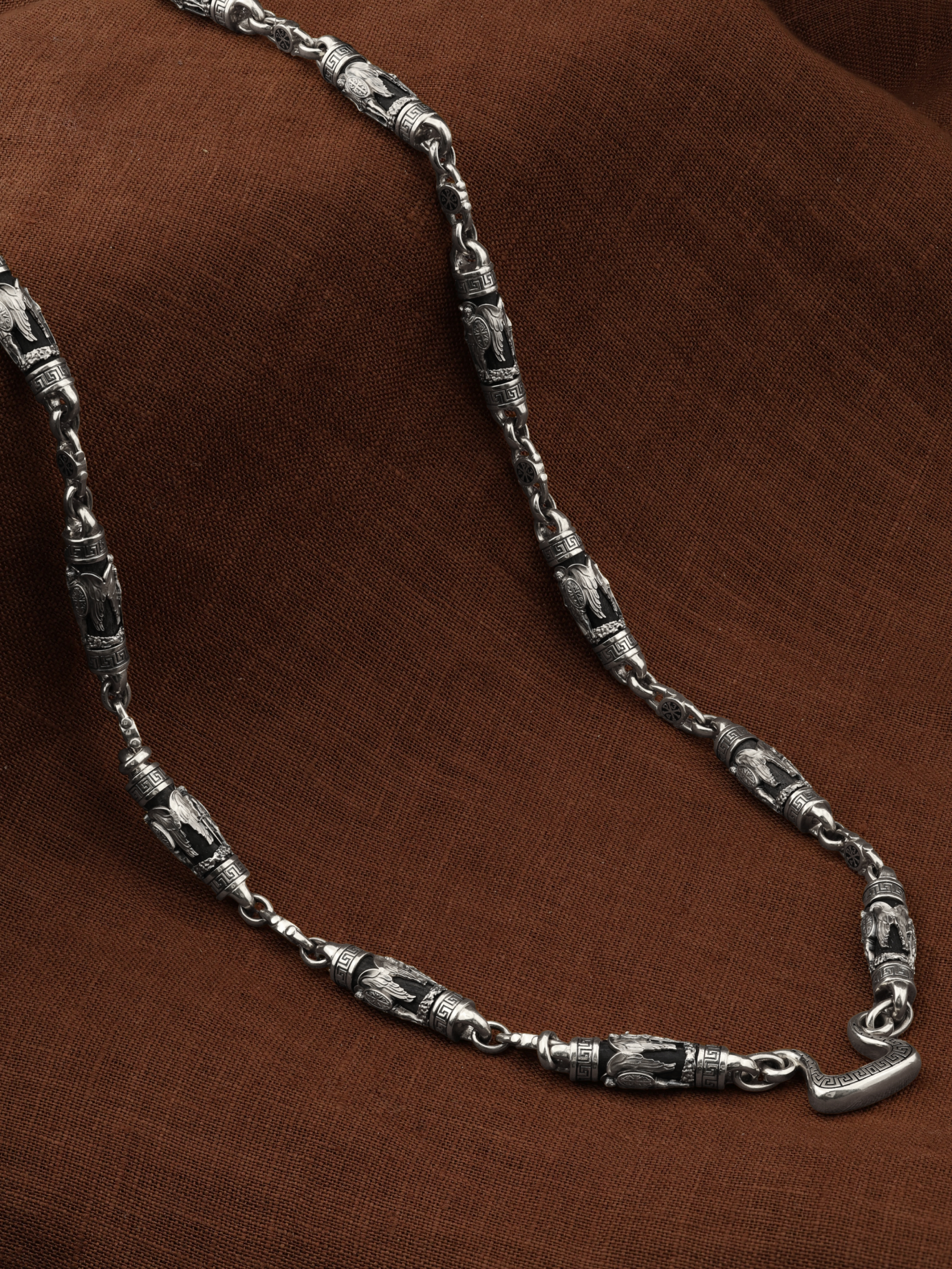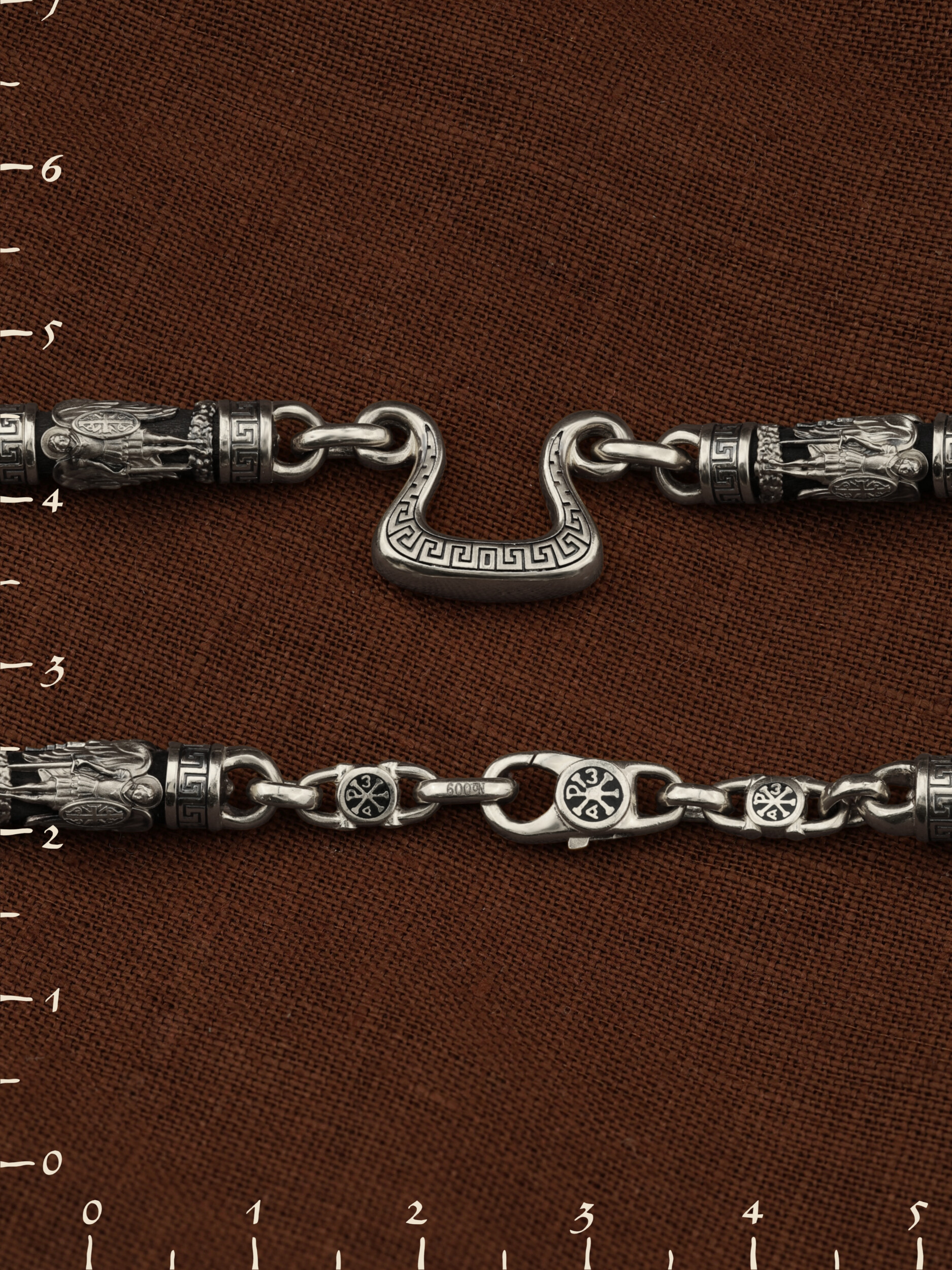 На звеньях цепи изображена Хризма — монограмма имени Христа, которая состоит из двух начальных греческих букв имени  — Х (хи) и Р (ро), скрещённых между собой. По краям монограммы помещены греческие буквы a и w. Такое употребление этих букв восходит к тексту Апокалипсиса: «Аз есмь Альфа и Омега, начало и конец, говорит Господь, Который есть и был и грядет, Вседержитель.» (Откр. 1:8; см. также Откр. 22:13). Также на звеньях изображен Святой Ангел-Хранитель в виде прекрасного юноши держащего в правой руке мечь, а в левой — щит. Ангел-Хранитель — это Ангел приставляемый Богом к человеку при крещении для охраны и помощи в добрых делах. Он невидимо находится при человеке на протяжении всей его жизни, если человек сохраняет в себе любовь к Богу и истинную веру перед Ним. Ангел-Xранитель делают для нас все, что служит к истинному нашему благу и спасению. Невидимо пребывая при нас постоянно, он, руководствуя нас ко спасению, не только по нашему желанию таинственно наставляет нас на все доброе и полезное, не только возносит наши молитвы к Богу, но еще и сам от себя охраняют и защищают нас от врагов видимых и невидимых и ходатайствует за нас пред Богом. Ангел-Хранитель так любит нас, как никто на земле любить не может. Одного лишь каждому из нас он желает — спасения души; к этому он направляет все свои заботы. И если видит нас также заботящимися о спасении, радуется, если же видит нас пребывающими в нерадении о душе своей, скорбит. Но и самый великий грешник может примириться со своим Ангелом-Хранителем посредством искреннего раскаяния в грехах и оставления их навсегда. В таком случае, по слову Писания, великая радость бывает для всех ангелов на небесах (Лк. 15:10). Цепь украшена орнаментом.