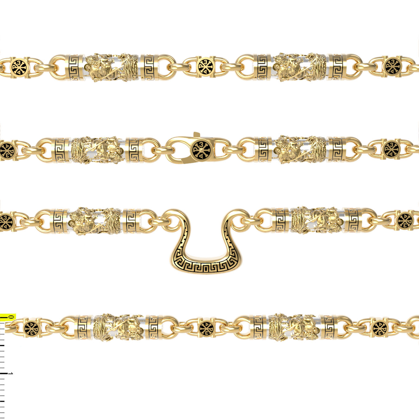 На звеньях цепи изображена Хризма — монограмма имени Христа, которая состоит из двух начальных греческих букв имени — Х (хи) и Р (ро), скрещённых между собой. По краям монограммы помещены греческие буквы a и w. Такое употребление этих букв восходит к тексту Апокалипсиса: «Аз есмь Альфа и Омега, начало и конец, говорит Господь, Который есть и был и грядет, Вседержитель.» (Откр. 1:8; см. также Откр. 22:13). Также на звеньях цепи помещено изображен святого великомученика Георгия Победоносца — одного из самых почитаемых и удивительных святых. Георгий родился в Каппадокии (Малая Азия) в семье богатых и знатных горожан. Юношей поступил на службу к римскому императору Диоклетиану, за отличное знание военного дела и проявленную в боях и походах храбрость был приближен к императору и удостоен высокого воинского звания. Во время начавшихся гонений на христиан, перешел на сторону гонимых и, отвергнув человеческий страх, стал ярым проповедником учения Христа. Мучители подвергли опального воеводу жесточайшим восьмидневным пыткам и казнили его (обезглавили) в возрасте около тридцати лет в 303 году. На Руси он известен как Юрий или Егорий, заступник для верующих, чья жизнь имеет какое-либо отношение к военным делам, помощник в крестьянском труде. На цепи Георгий изображен как воитель, сидящий на вздыбленном коне и поражающий копьем огнедышащего змея. Змей символизирует собою сатанинские силы. Молитвами вознесенными к Всевышнему и своей непреклонной верой он смог одолеть чудовище. Святой убил змея, спас царскую дочь, принесенную в жертву, и жителей города, их души от влияния дьявола, породив в них надежду и веру в Господа, призывая людей принять христианскую веру. Цепь украшена орнаментом.