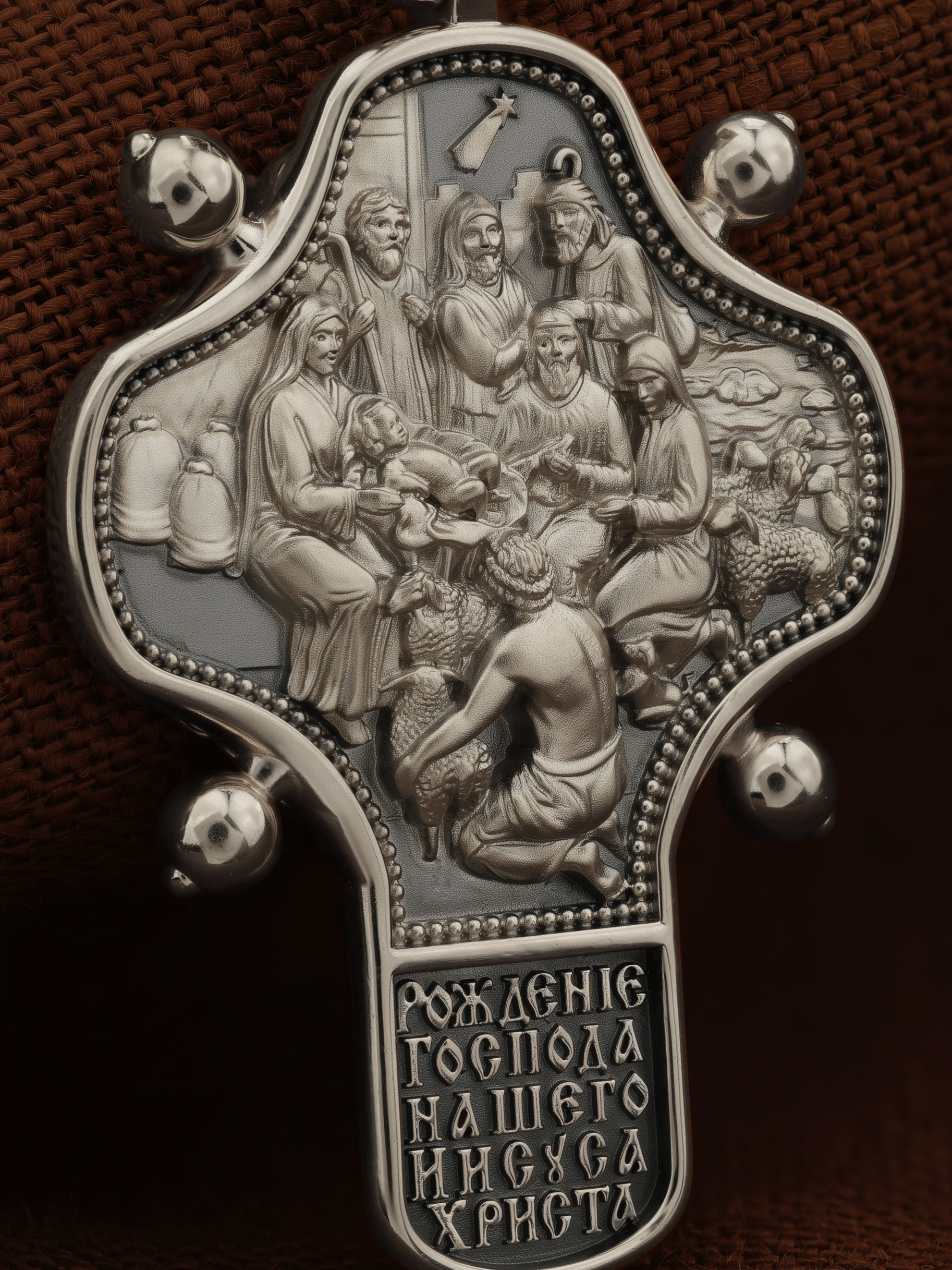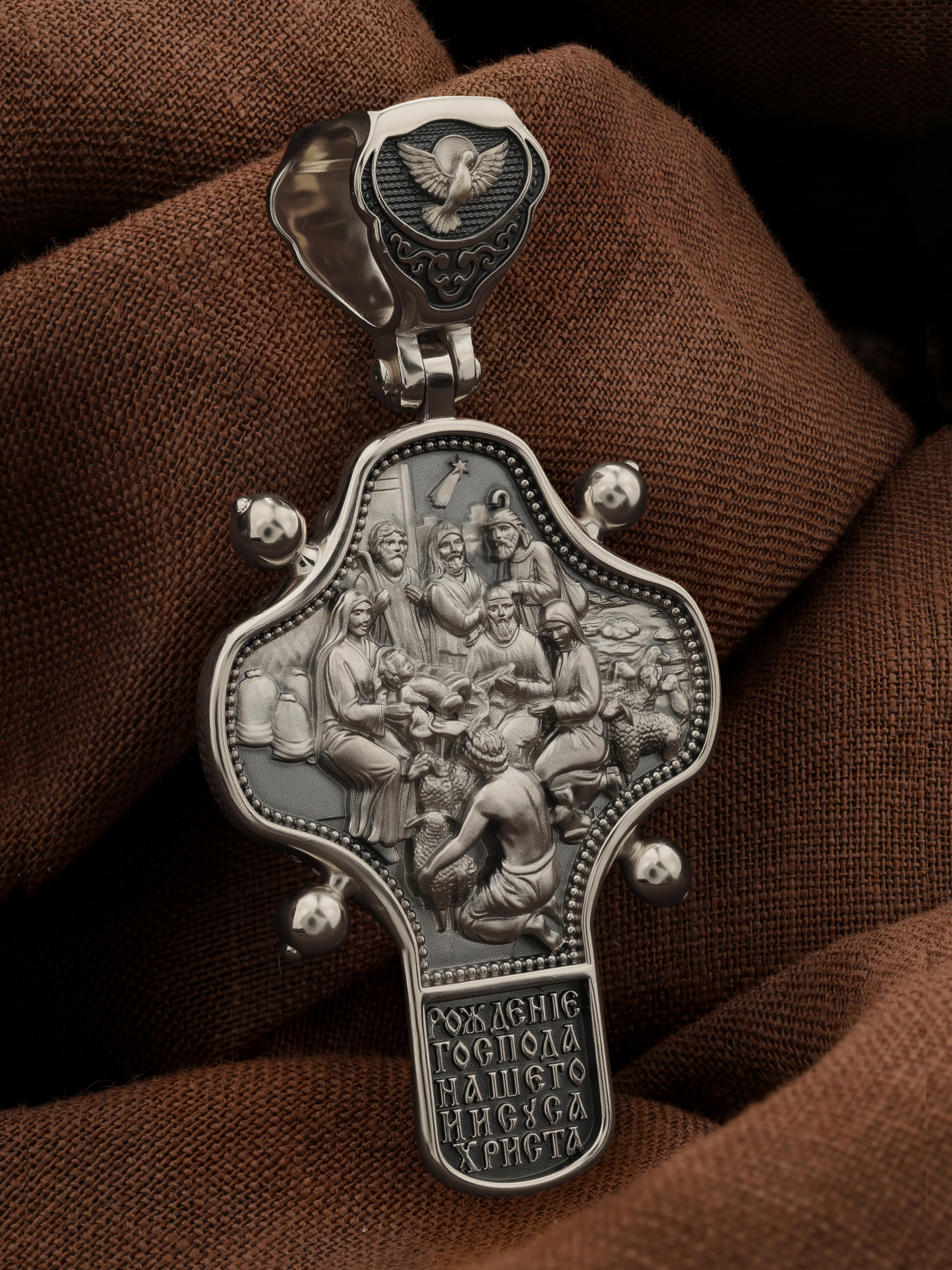 На оборотной стороне креста помещено изображение иконы «Рождество Христово». Господь Иисус Христос родился от Пресвятой Девы Марии в царствование императора Августа в городе Вифлееме. Как раз в это время Август повелел сделать всенародную перепись по всей своей империи, согласно которой каждый житель Палестины должен был идти в тот город, к которому испокон веков принадлежал его род. Пресвятая Богородица и праведный Иосиф, как происходившие от рода Давидова, должны были идти в Вифлеем (город Давида), чтобы внести свои имена в список подданных кесаря: «Пошел также и Иосиф из Галилеи, из города Назарета, в Иудею, в город Давидов, называемый Вифлеем, потому что он был из дома и рода Давидова, записаться с Мариею, обрученною ему женою, которая была беременна. Когда же они были там, наступило время родить Ей; и родила Сына своего Первенца, и спеленала Его, и положила Его в ясли, потому что не было им места в гостинице» (Лк.2:4−7).После рождения Спасителя на поле близ Вифлеема простым пастухам явились ангелы, благовествовавшие о пришествии в мир Христа песней славословия Господу: «Слава в вышних Богу, и на земли мир, в человецех благоволение!». Они повелели пастырям идти поклониться Младенцу. В это же время к Рожденному с дарами из дальних стран — златом, ливаном и смирной — пришли волхвы, которых к яслям Богомладенца привела воссиявшая в небе новая звезда. На кулонном кольце изображен Дух Святой в виде голубя сходящего с небес.