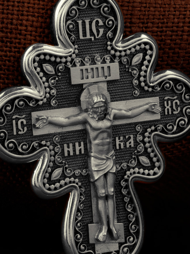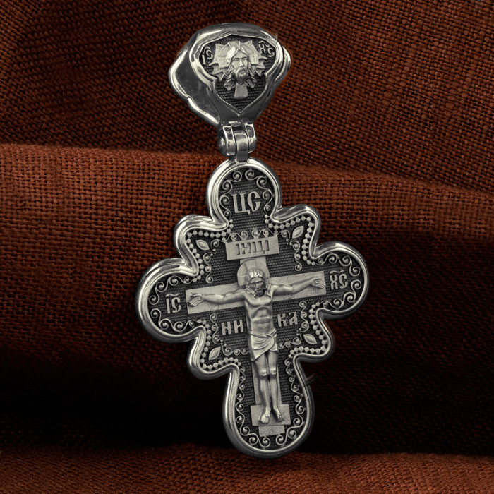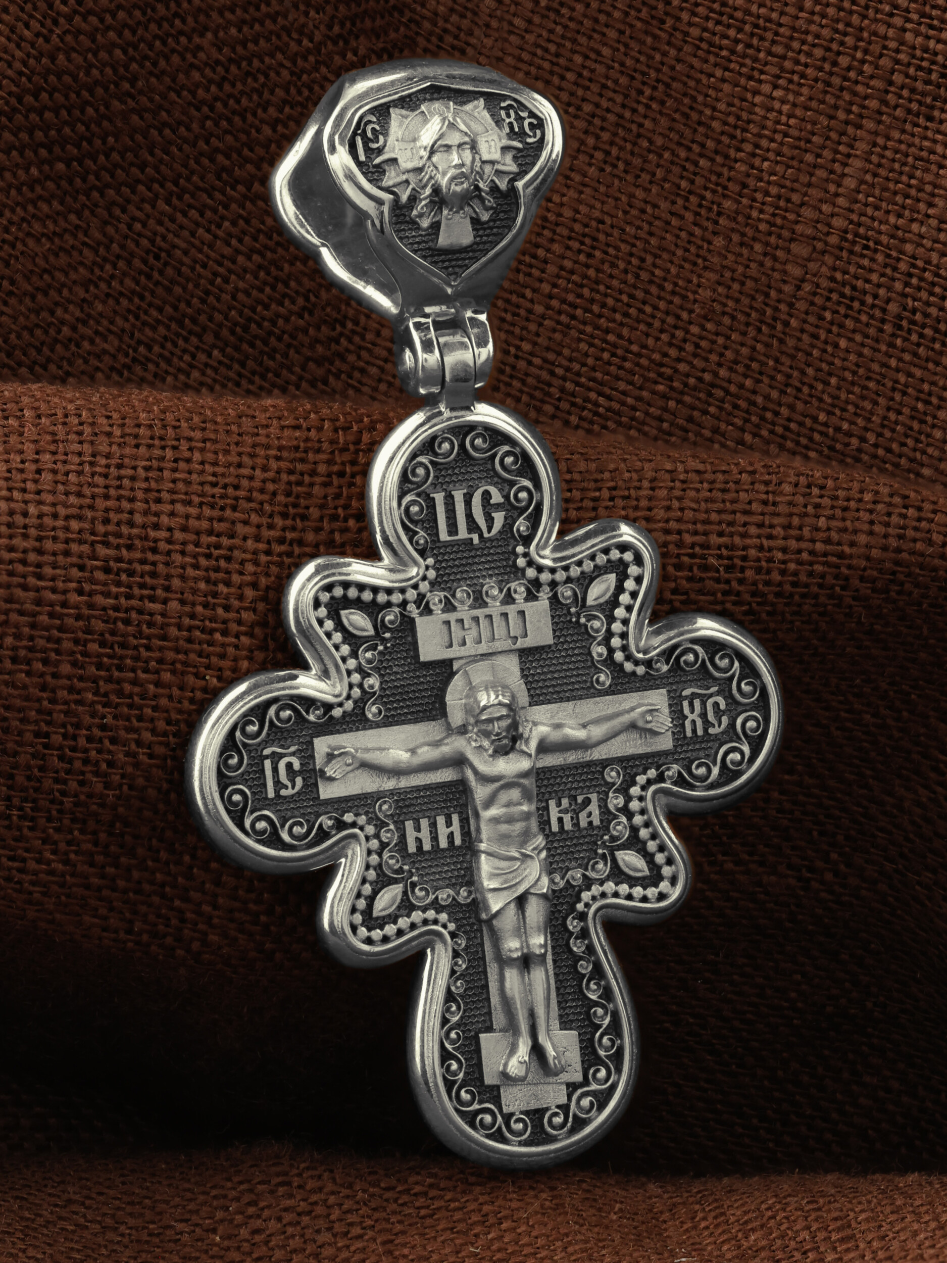 На лицевой стороне креста изображено Распятие Господа и Спасителя нашего Иисуса Христа. Крест- символ спасения и искупления рода человеческого, знамение победы над смертью и адом. Иисус Христос, как искупительная жертва освобождения человечества от власти греха, умер крестной смертью и в третий день воскрес. Над Распятием помещена надпись «Царь Славы». На верхней табличке, выше головы Иисуса, расположена надпись, составленная Понтием Пилатом — «IНЦI». Она означает «Иисус Назорей, Царь Иудейский». Надпись «IC» «ХC», означает Иисус Христос, помещается на разных сторонах поперечной перекладины креста. Рядом — слово «НИКА», что означает «победитель». На кулонном кольце изображен Нерукотворный образ Господа и Спасителя нашего Иисуса Христа, чудесно отпечатавшийся на плате, которым Христос вытер свой лик.
