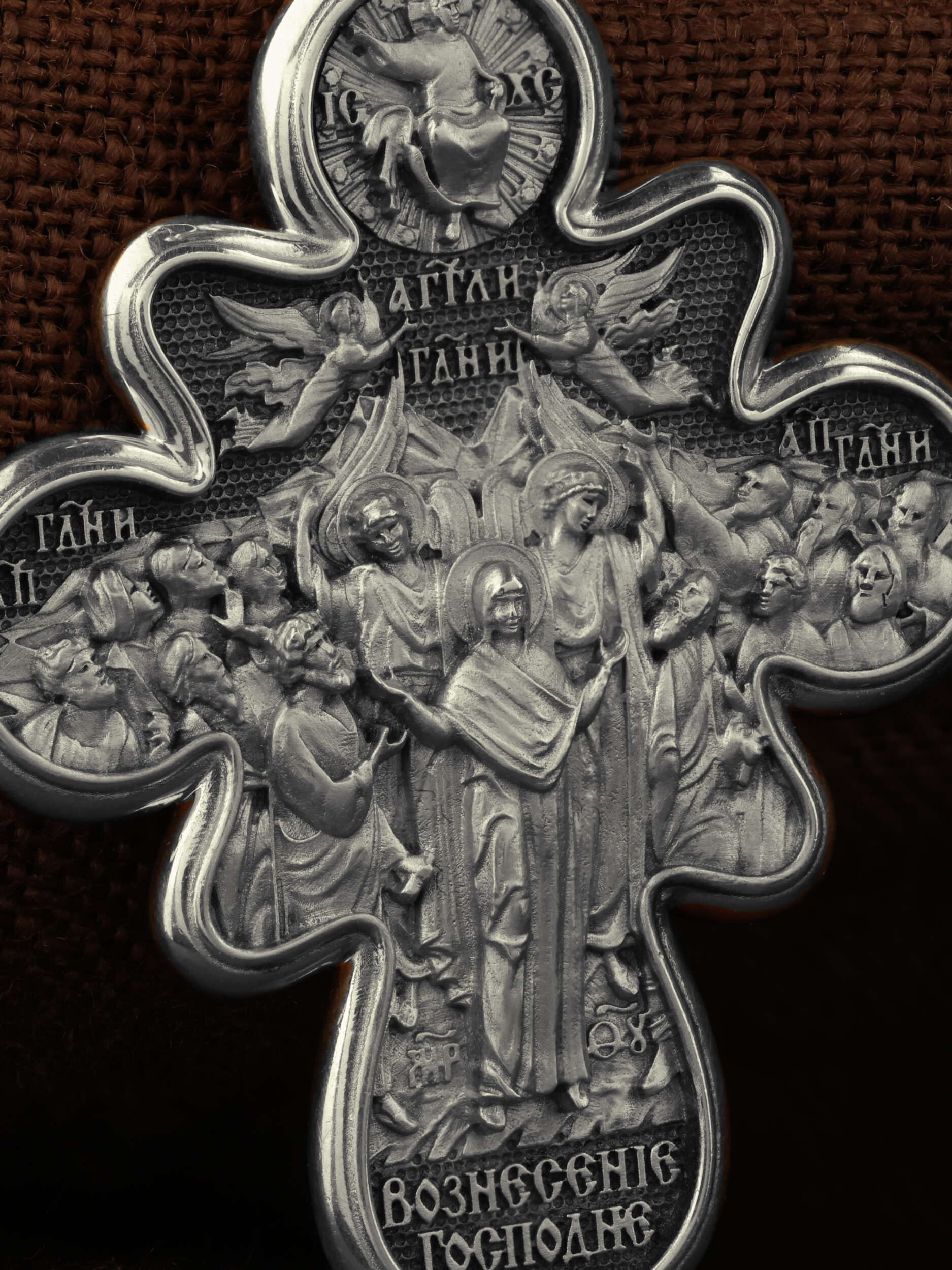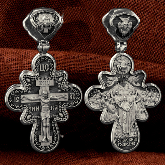 На оборотной стороне креста изображена икона Вознесение Господне. Описание события Вознесения Христова содержится в Евангелиях от Луки (Лк. 24, 50−51) и Марка (Мк. 16, 19), а также в Деяниях свв. апостолов (Деян 1, 9−11). Согласно этим повествованиям, после Своего Воскресения из мертвых Спаситель неоднократно являлся ученикам, чтобы удостоверить их в истинности Своего телесного Воскресения, укрепить в них веру и подготовить к принятию обетованного Святого Духа (Ин. 16, 7). На сороковой день после Своего Воскресения Господь Иисус Христос вывел учеников, собранных в Иерусалиме, из города в Вифанию, на гору Елеон (Деян. 1, 12). Здесь, после благословения апостолов, Он стал отдаляться от них и возноситься на небо. В Деяниях св. апостолов также упомянуто, что во время Вознесения Христова явились «два мужа в белой одежде», которые возвестили Его Второе пришествие: «Мужи галилейские! Что вы стоите и смотрите на небо? Сей Иисус, вознесшийся от вас на небо, придет таким же образом, как вы видели его восходящим на небо» (Деян. 1, 11). После Вознесения Господня ученики с радостью вернулись в Иерусалим (Лк. 24, 52), ожидая сошествия на них Святого Духа, которое произошло через несколько дней (Деян. 2, 1−4). На кулонном кольце изображен шестикрылый Ангел — Серафим.