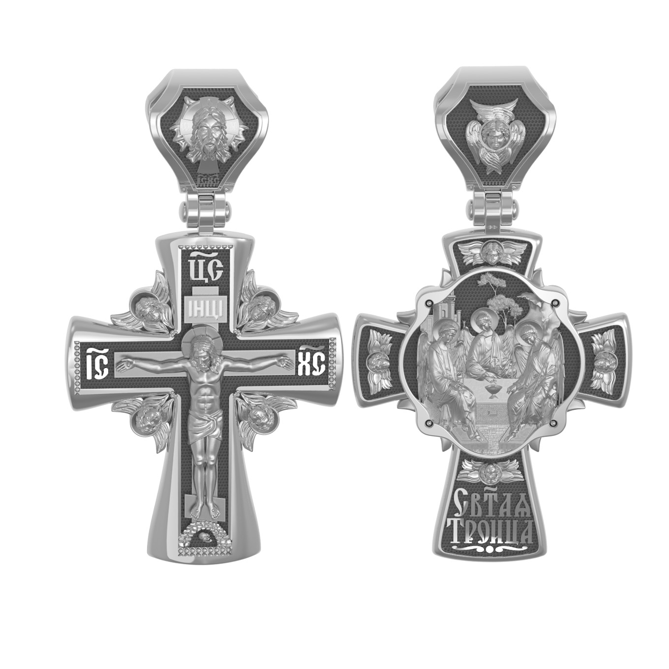 На оборотной стороне креста изображена икона Святой Троицы. На иконе изображены три ангела, являющихся образом Единосущного и Триипостасного Бога — Святой Троицы. Фигуры ангелов расположены так, что линии их фигур образуют как бы замкнутый круг. Три ангела безмятежно и неторопливо ведут беседу. Их позы непринужденны, одежды просты и свободны. В руках у них скипетры, символы власти. В центре иконы — чаша, как символ страданий Христа. За центральной фигурой — древо жизни, а левее от него — здание, символизирующее церковь. В правом верхнем углу изображена гора, как искупление падшего мира, прототип Голгофы, на которую взойдет Иисус. Единство трёх ипостасей Святой Троицы является совершенным прообразом всякого единения и любви — «Да будут все едино, как Ты, Отче, во Мне, и Я в Тебе, так и они да будут в Нас едино» (Ин.17:21). На кулонном кольце изображен шестикрылый Ангел — Серафим.