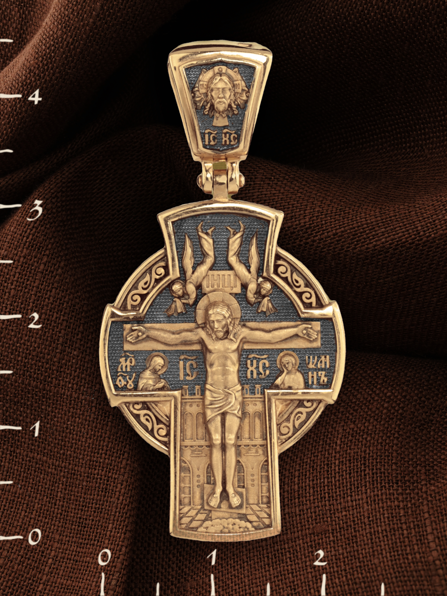 На лицевой стороне креста изображено Распятие Господа и Спасителя нашего Иисуса Христа, отдавшего Себя на смерть, для искупления грехов мира. Крест является символом жертвенной любви всеблагого Бога к падшим людям, всепобеждающим духовным оружием христиан, основанием и средоточием церковной жизни. Верхняя перекладина символизирует титло — табличку, на которой, согласно Евангелию, было начертано: Иисус Назорей Царь Иудейский (IНЦI). Надпись «IC» «ХC», означает Иисус Христос, помещается ниже поперечной перекладины креста. Слева от Распятия изображена Пресвятая Богородица, справа — апостол и евангелист Иоанн Богослов, один из ближайших учеников Иисуса Христа. За крестом высится Иерусалимская стена, в знак того, что Господь был распят вне стен города. Возвышение, на котором стоит Крест, символизирует гору Голгофу, на которой произошло Распятие. На кулонном кольце изображен Нерукотворный образ Господа и Спасителя нашего Иисуса Христа, чудесно отпечатавшийся на плате, которым Христос вытер свой лик.