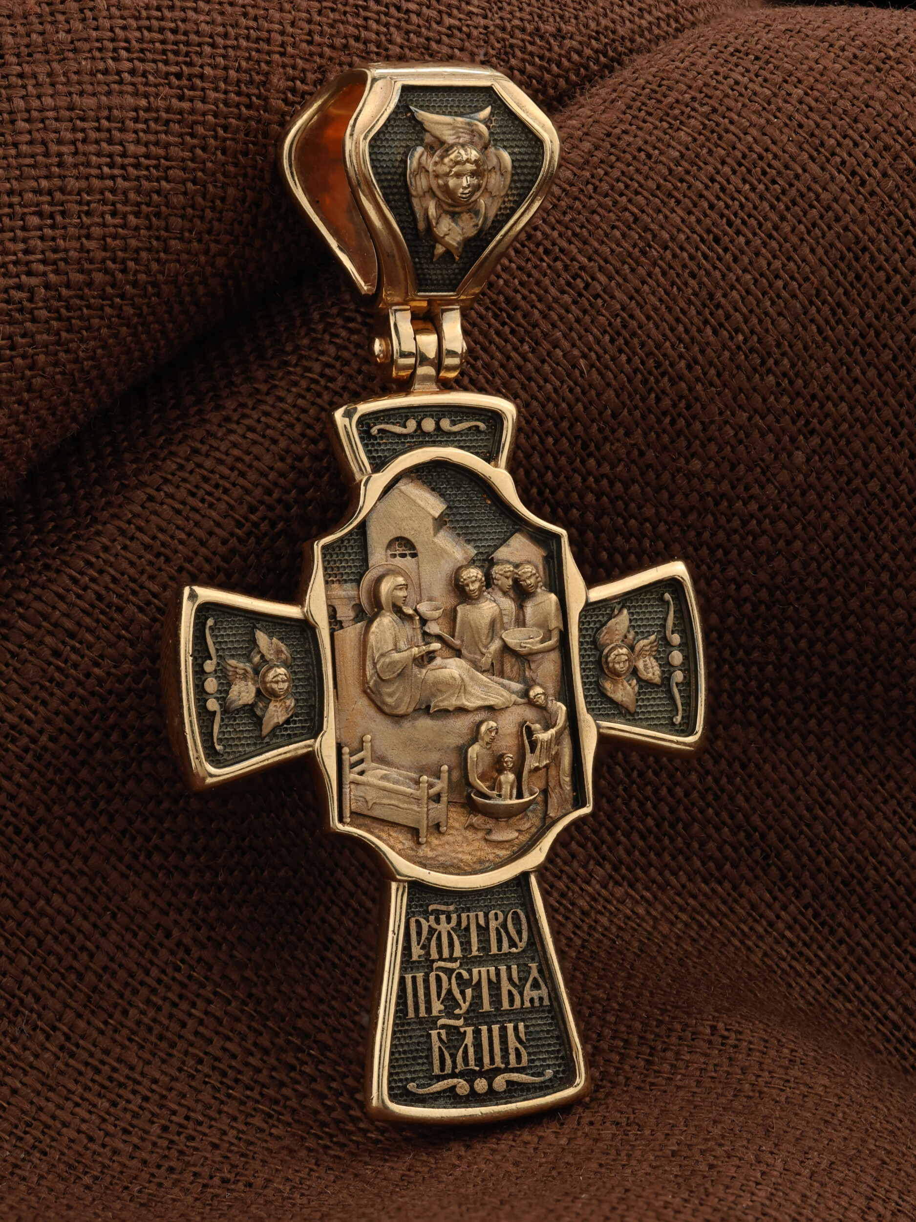 На оборотной стороне креста изображена икона Рождество Пресвятой Богородицы. Согласно церковному Преданию, Пресвятая Дева Мария родилась в небольшом галилейском городе Назарете. Родителями Её были праведные Иоаким и Анна. Супруги были бездетны, но не теряли надежды, что Господь может разрешить неплодство Анны даже в её преклонном возрасте. Они горячо молились и просили Господа даровать им дитя, которое обещали посвятить Богу для служения в храме. И Господь услышал их молитвы: Праведная Анна зачала и разрешилась дочерью Марией — будущей Пресвятой Богородицей. На кулонном кольце изображен шестикрылый Ангел — Серафим.