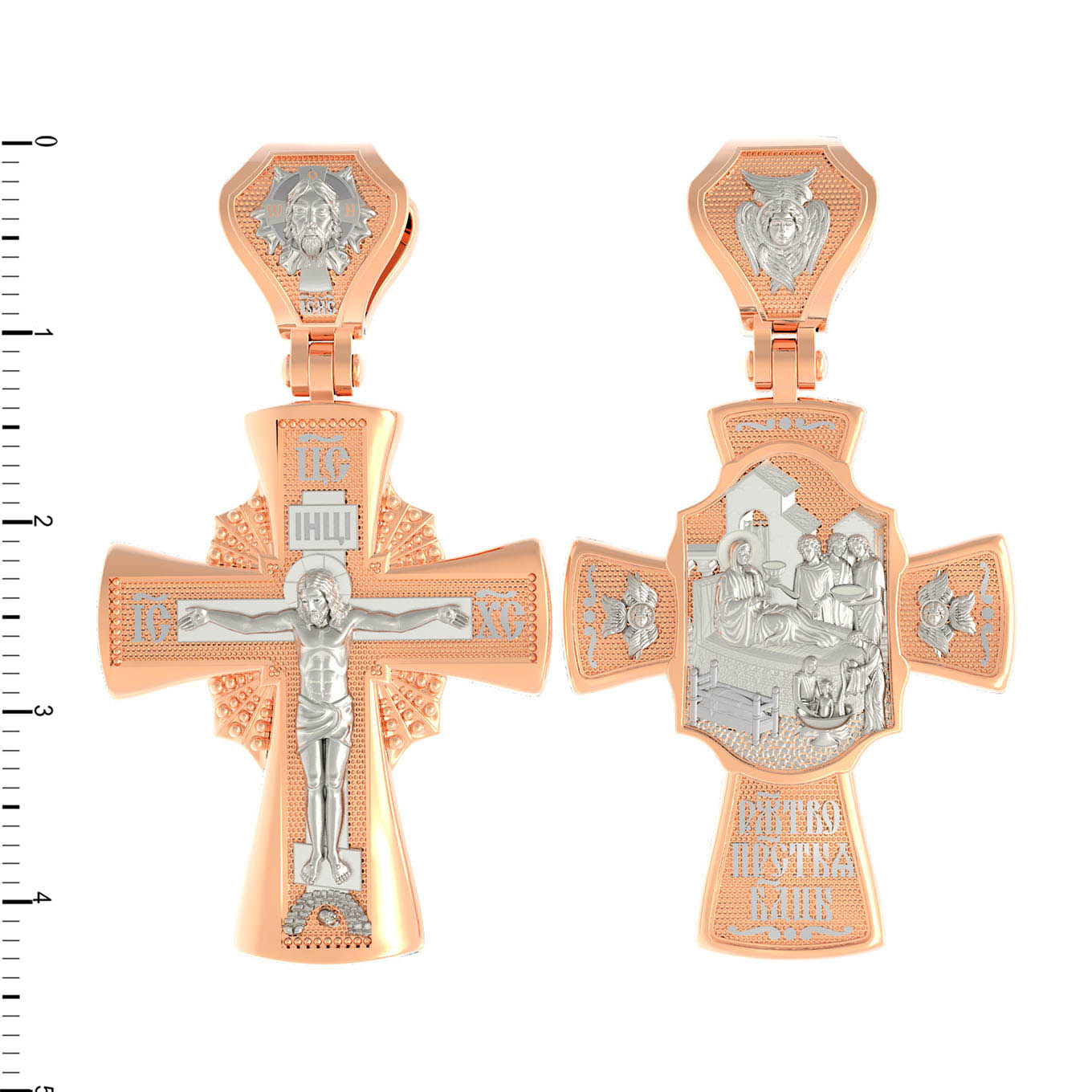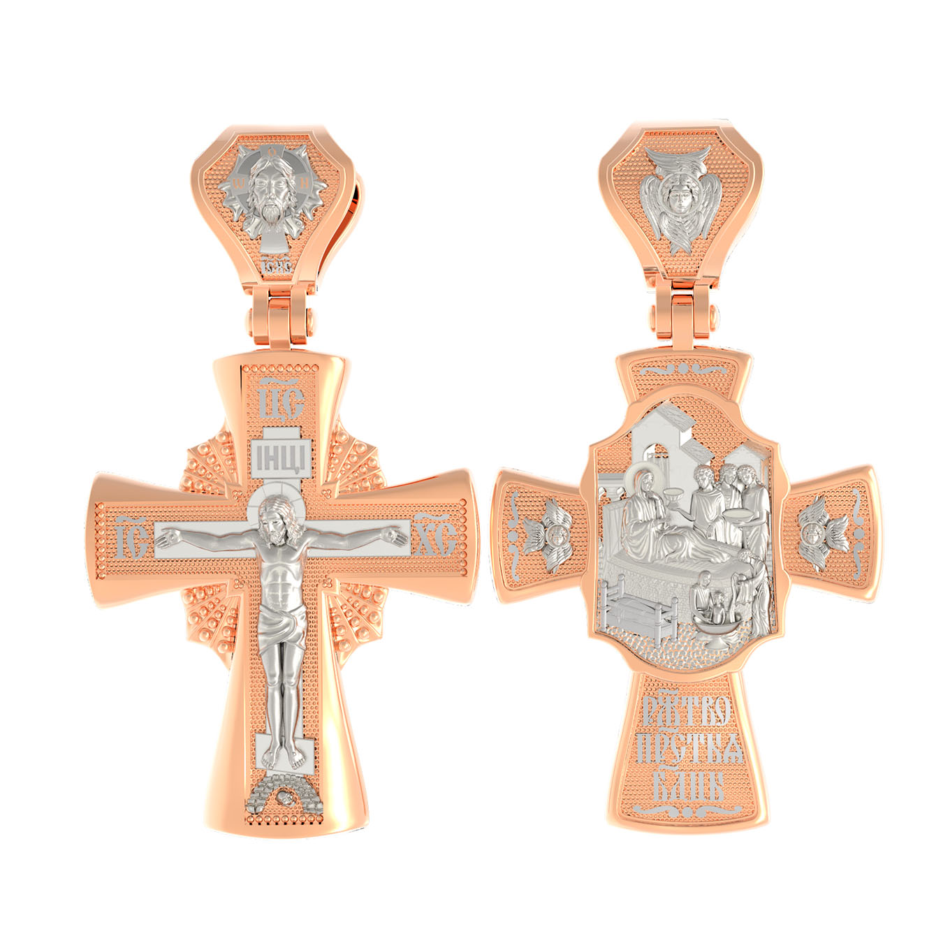 На оборотной стороне креста изображена икона Рождество Пресвятой Богородицы. Согласно церковному Преданию, Пресвятая Дева Мария родилась в небольшом галилейском городе Назарете. Родителями Её были праведные Иоаким и Анна. Супруги были бездетны, но не теряли надежды, что Господь может разрешить неплодство Анны даже в её преклонном возрасте. Они горячо молились и просили Господа даровать им дитя, которое обещали посвятить Богу для служения в храме. И Господь услышал их молитвы: Праведная Анна зачала и разрешилась дочерью Марией — будущей Пресвятой Богородицей. На кулонном кольце изображен шестикрылый Ангел — Серафим.