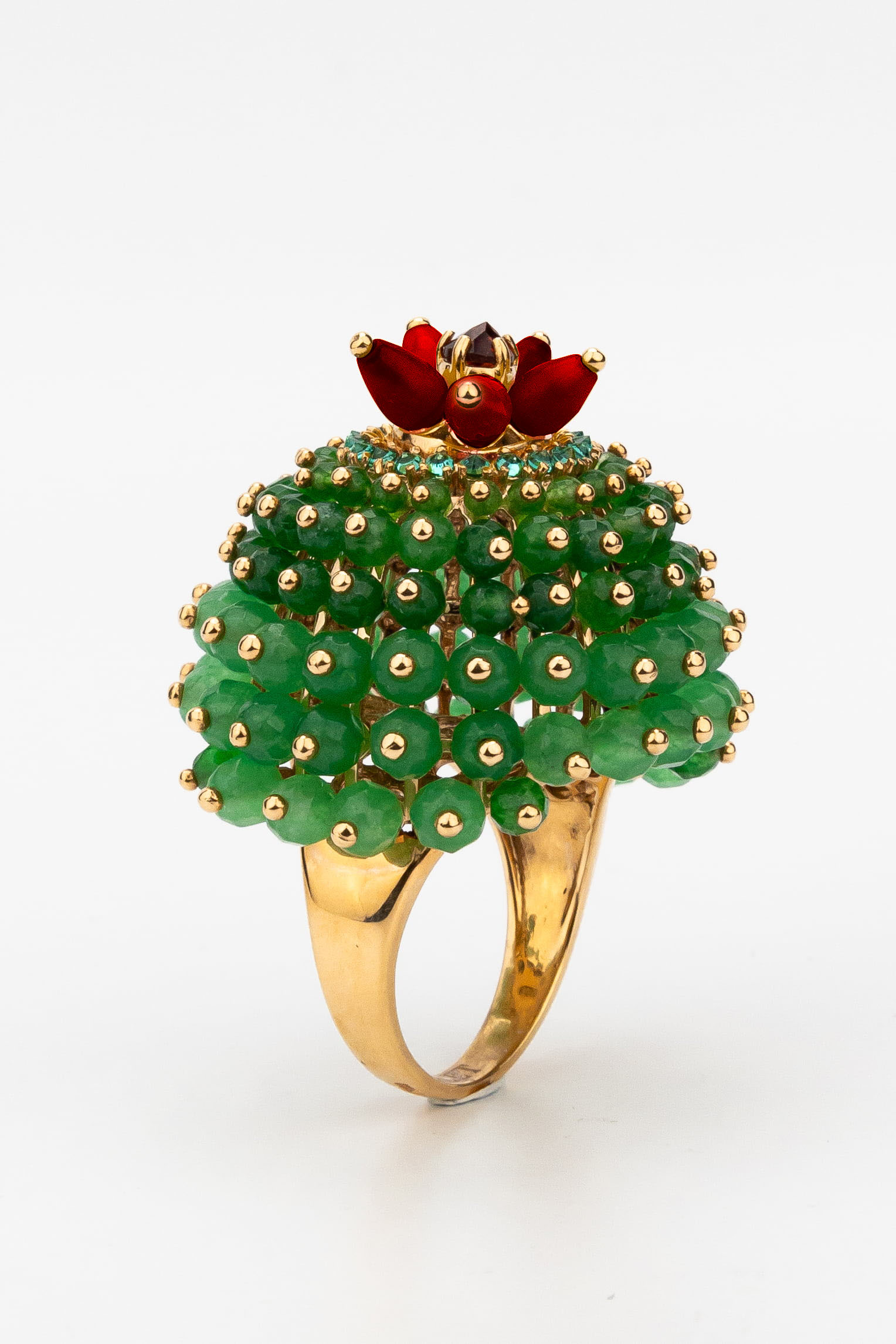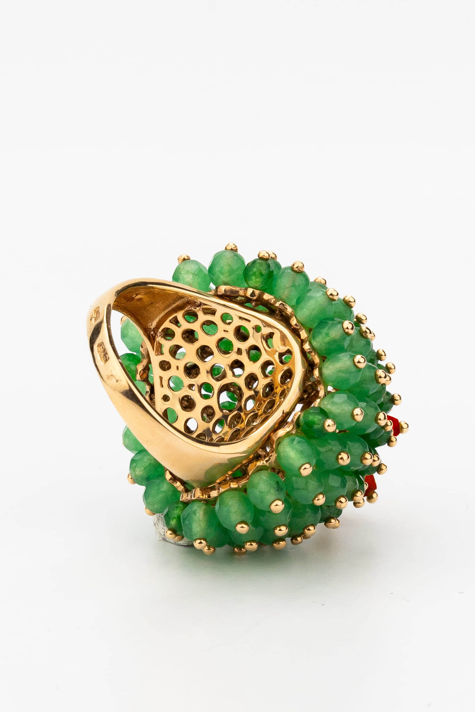 Кольцо из золота c гранатом, хризопразом, изумрудом и кораллом
