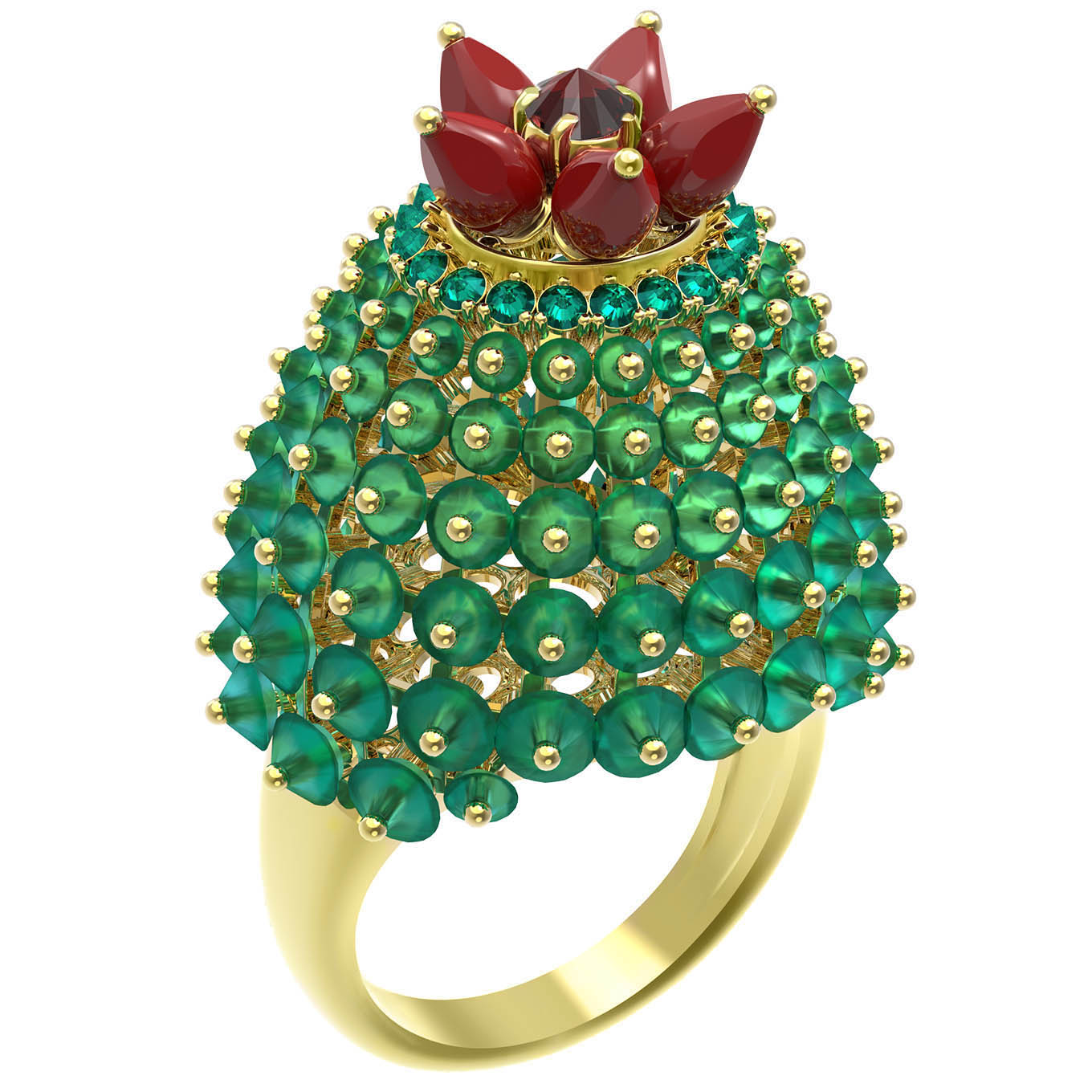 Кольцо из лимонного золота c гранатом, хризопразом, изумрудом и кораллом