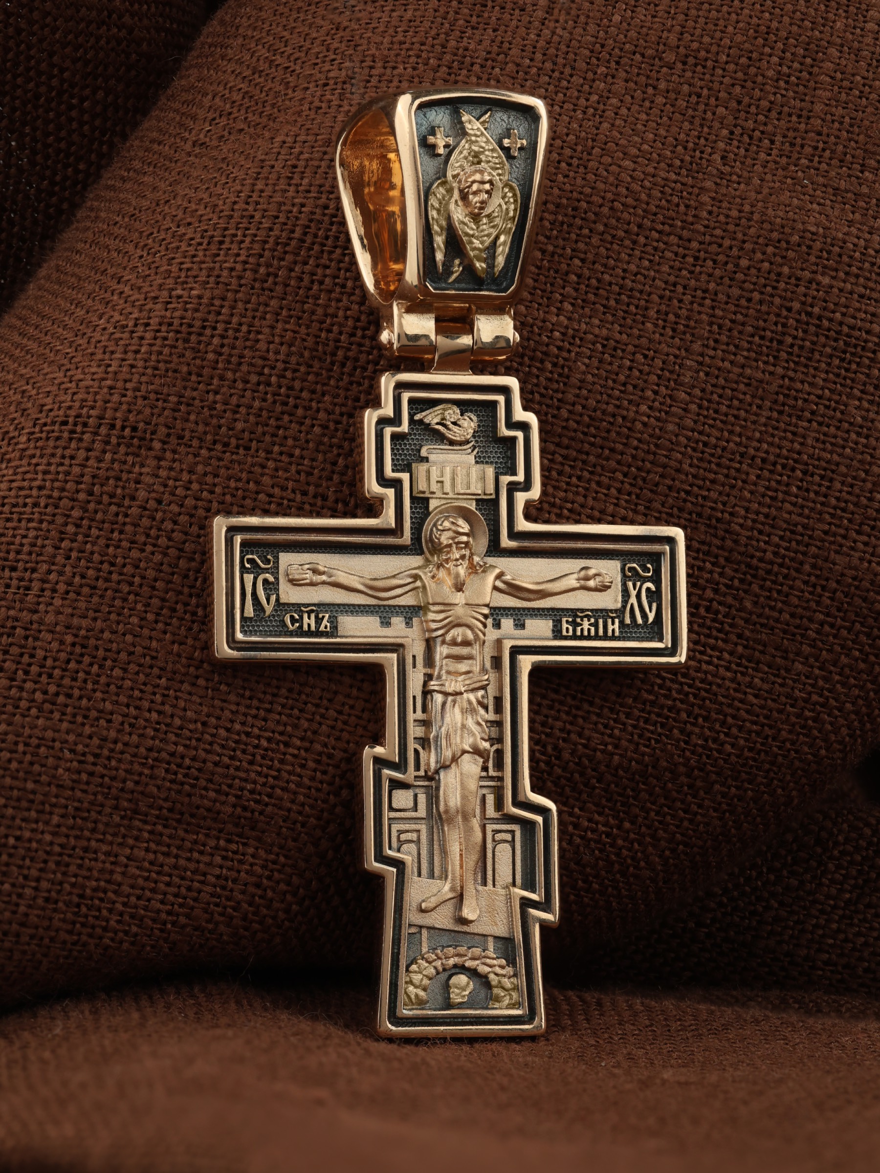 Восьмиконечный нательный крест с Распятием Иисуса Христа на горе Голгофе. Форма этого кресты является одной из самых распространенных на Руси и более всего соответствует тому Кресту, на котором был распят Христос.