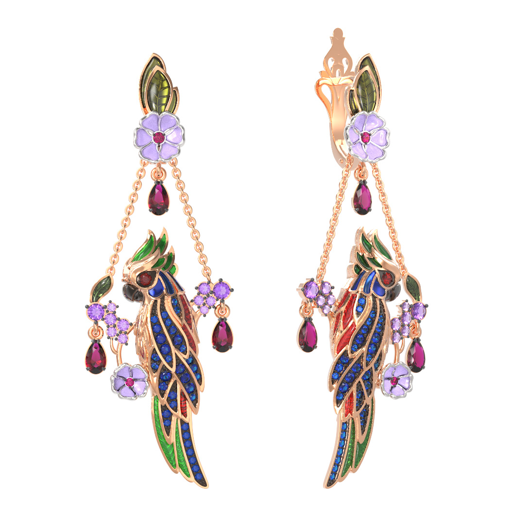 Серьги из золота c эмаль, аметистом, рубином, аметистом и сапфиром