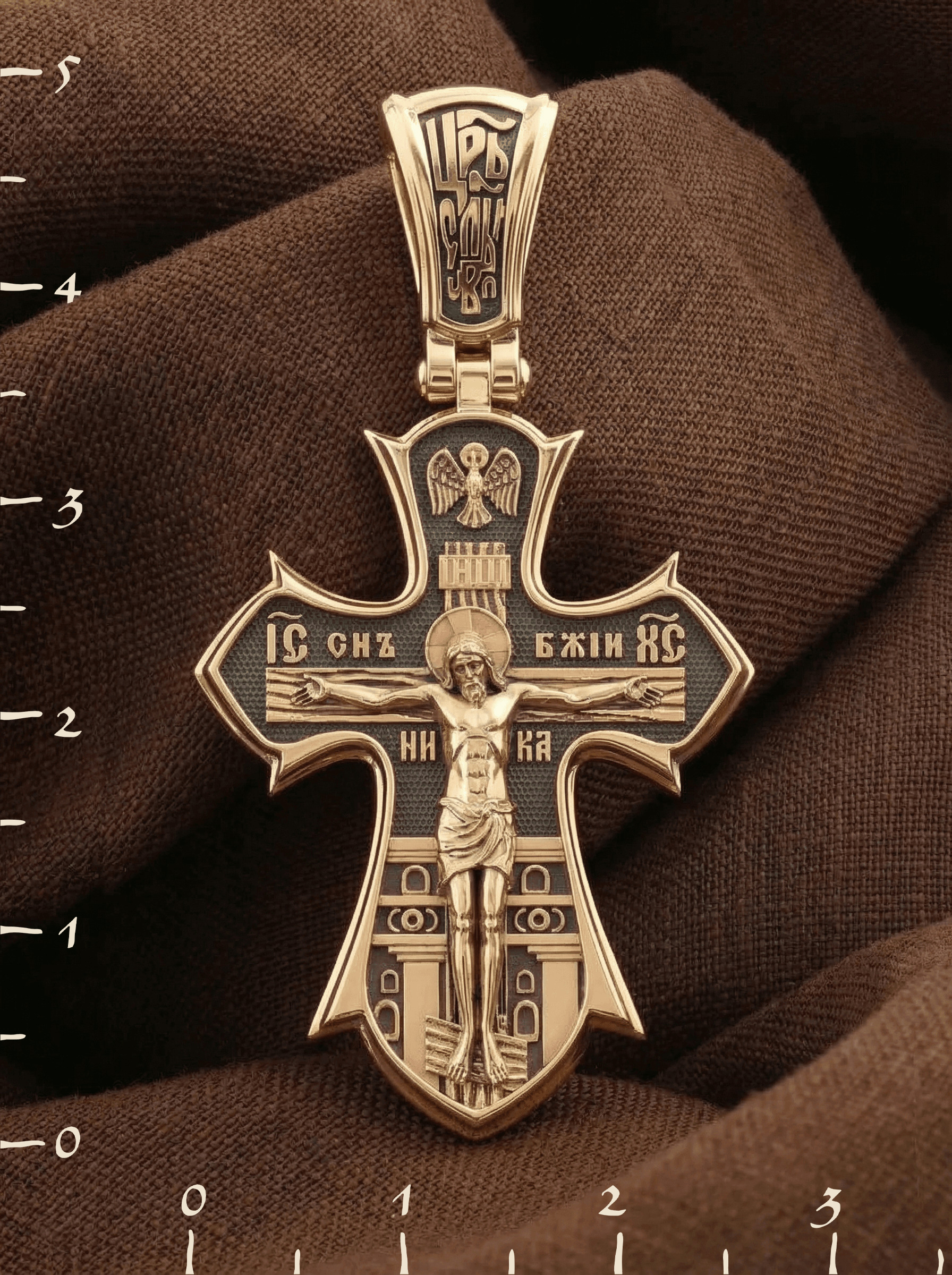 На лицевой стороне креста изображено Распятие Иисуса Христа. Господь представлен свободно покоящимся на кресте с простертыми руками и как бы обнимающим всю Вселенную. Он — Спаситель, искупивший грехи мира, «поправший смертию смерть» и призывающий к Себе «все концы земли». Поэтому рядом с Его образом помещены слова — «НИКА» и «Царь Славы». Эти слова характеризуют Господа как Великого Архиерея, победителя смерти. Верхняя перекладина символизирует титло — табличку, на которой, согласно Евангелию, было начертано: Иисус Назорей Царь Иудейский (IНЦI). Также Распятие сопровождается надписями, олицетворяющими Христа. Это святое имя Христа «IC» (Иисус) «ХС» (Христос), и словосочетание «СЫН БОЖИЙ».