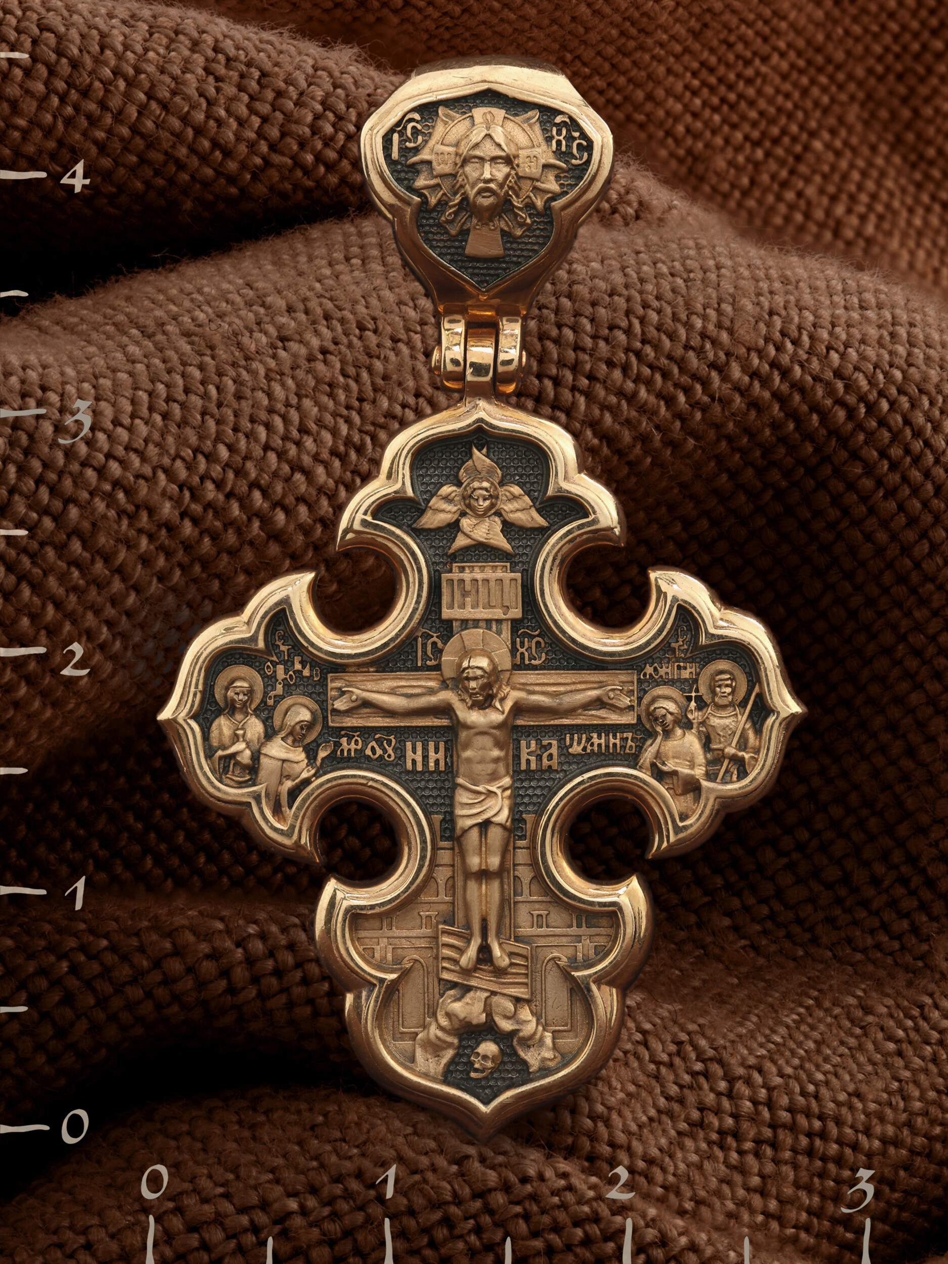 На лицевой стороне креста изображено Распятие Господа и Спасителя нашего Иисуса Христа. Своими крестными страданиями Господь смыл наши грехи, покрыл наш долг перед Богом или, на языке Писания, нас «искупил». В Голгофе сокрыта непостижимая тайна бесконечной правды и любви Бога. Крест стал символом победы добра над злом, жизни над смертью, напоминанием бесконечной Божьей любви, предметом радости. Воплотившийся Сын Божий Своею кровью освятил крест и сделал его проводником Своей благодати, источником освящения верующих. На верхней табличке, выше головы Иисуса, расположена надпись, составленная Понтием Пилатом — «IНЦI». Она означает «Иисус Назорей, Царь Иудейский». Ниже перекладины написано сокращенно имя Спасителя «IC» «XC» — Иисус Христос. Крест стоит на горе камней, символизирующих Голгофу. Под подножием Креста изображена покоящаяся голова (череп) Адама. Слева от Распятия стоят оплакивающие Господа Пресвятая Богородица и святая мироносица Мария Клеопова. Справа — апостол и евангелист Иоанн Богослов, один из ближайших учеников Иисуса Христа и сотник Лонгин с крестом в правой руке и копьем — в левой. По преданию, увидя, что они горько плачут, Иисус сказал Матери Своей: «Жено! Се сын Твой!» Потом сказал ученику Иоанну: «Се мати твоя». С этого времени Иоанн взял Матерь Божию к себе, и Она жила в его доме до самой смерти. На кулонном кольце изображен Спас Нерукотворный — образ Господа и Спасителя нашего Иисуса Христа, чудесно отпечатавшийся на плате, которым Христос вытер свой лик.