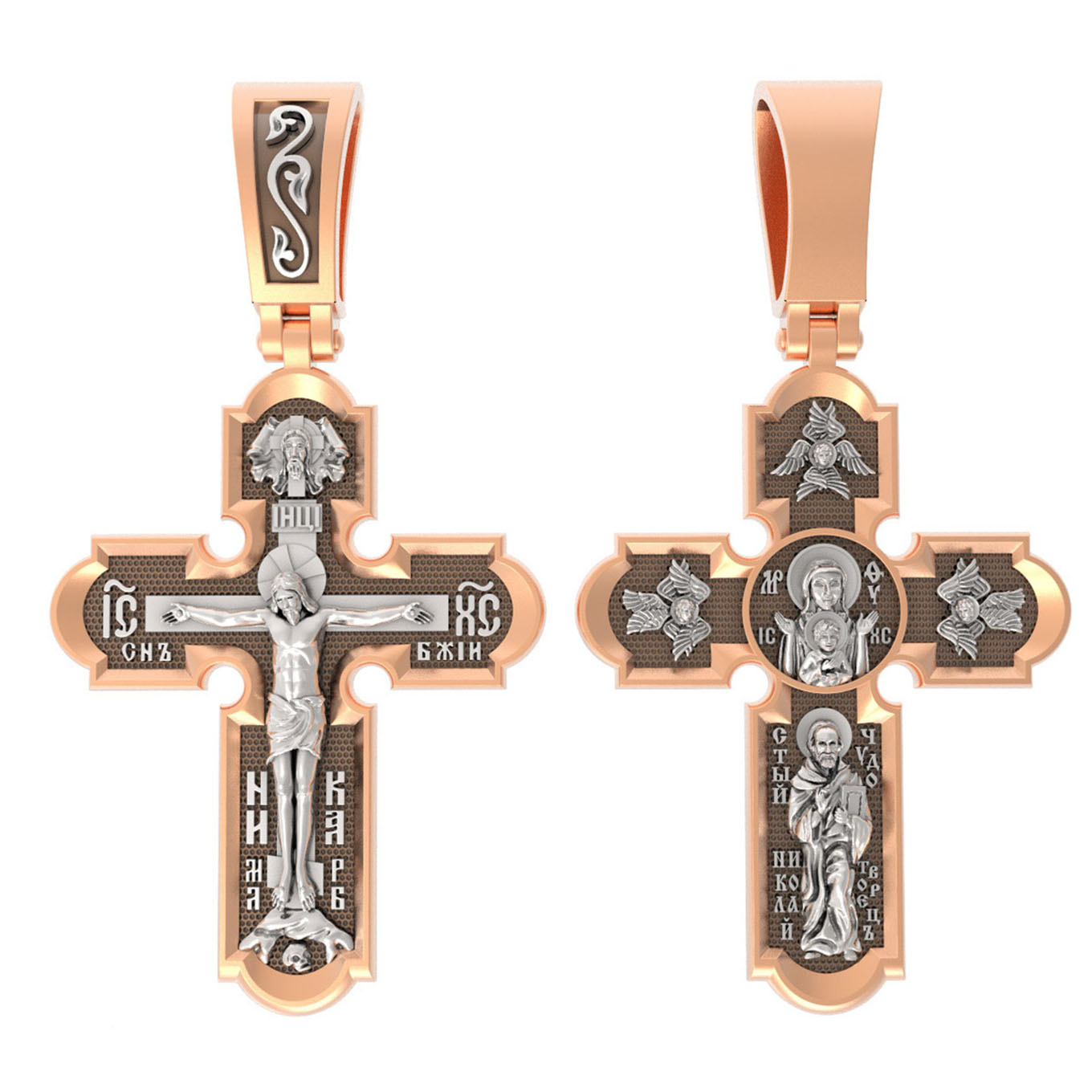 На лицевой стороне нательного креста по традиции изображено Распятие Господа нашего Иисуса Христа. Крест Господень стоит на небольшом каменистом возвышении, символизирующем гору Голгофу, которая обозначена буквами МЛРБ (Место Лобное Рай Бысть). Над головой Господа на поперечной перекладине написано «ИНЦИ», что символизирует табличку, которая была прибита к Кресту, с надписью «Иисус Назорей Царь Иудейский». Этим иудеи хотели посмеяться над Христом, не зная, что распинают истинного Царя всех царей. По сторонам основной перекладины расположены позолоченные рельефные инициалы Христа «ИС ХС». Под перекладиной, по сторонам древа, находится надпись «СЫН БОЖИЙ», а в основании креста — надпись «НИКА» (Победитель).