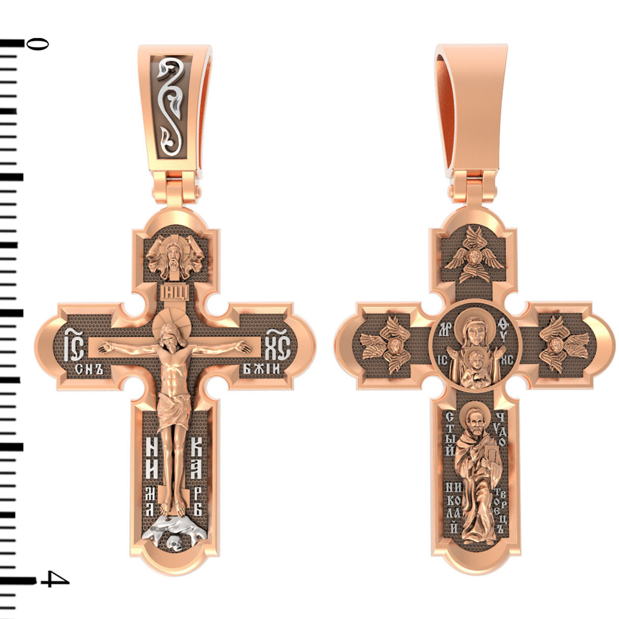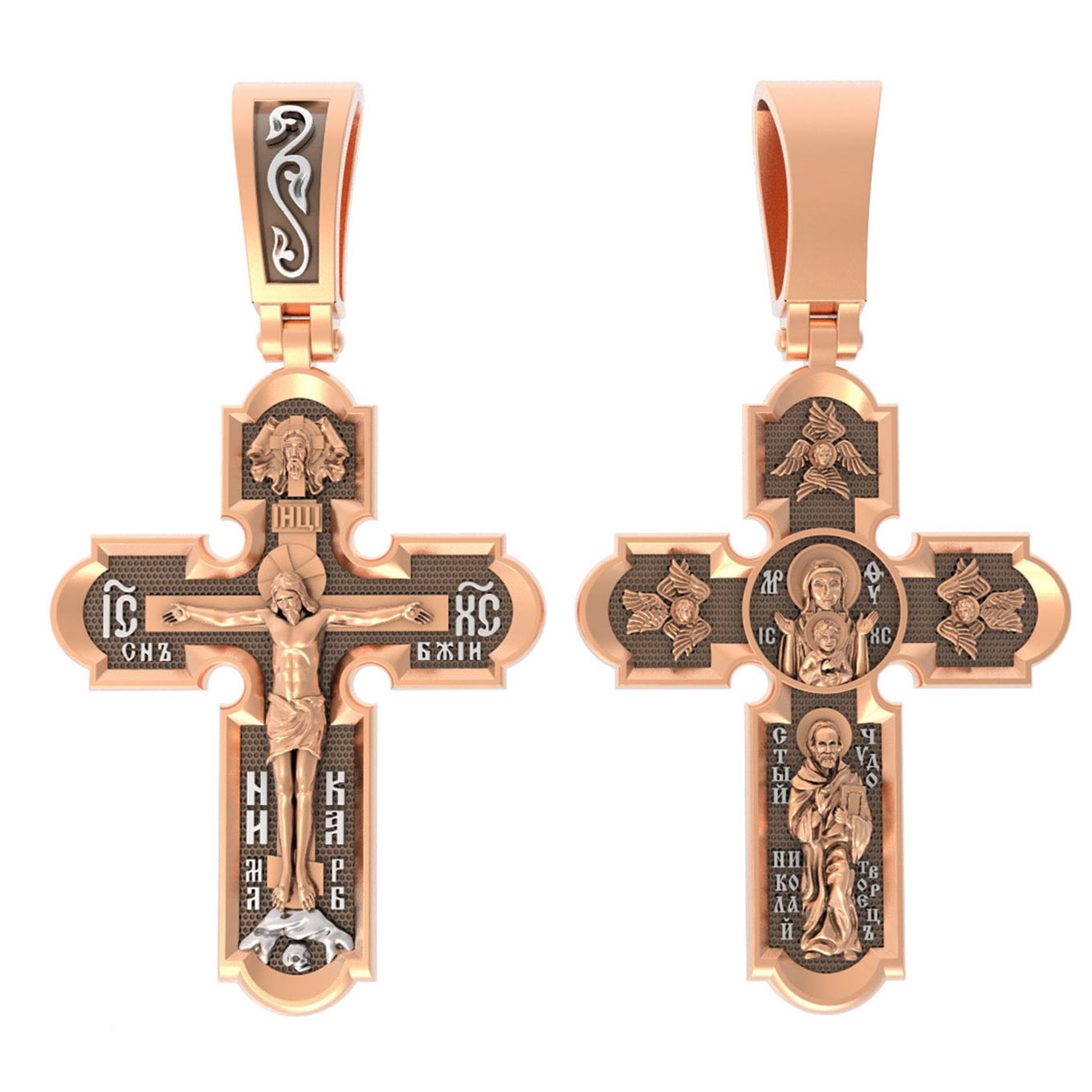 На лицевой стороне нательного креста по традиции изображено Распятие Господа нашего Иисуса Христа. Крест Господень стоит на небольшом каменистом возвышении, символизирующем гору Голгофу, которая обозначена буквами МЛРБ (Место Лобное Рай Бысть). Над головой Господа на поперечной перекладине написано «ИНЦИ», что символизирует табличку, которая была прибита к Кресту, с надписью «Иисус Назорей Царь Иудейский». Этим иудеи хотели посмеяться над Христом, не зная, что распинают истинного Царя всех царей. По сторонам основной перекладины расположены позолоченные рельефные инициалы Христа «ИС ХС». Под перекладиной, по сторонам древа, находится надпись «СЫН БОЖИЙ», а в основании креста — надпись «НИКА» (Победитель).