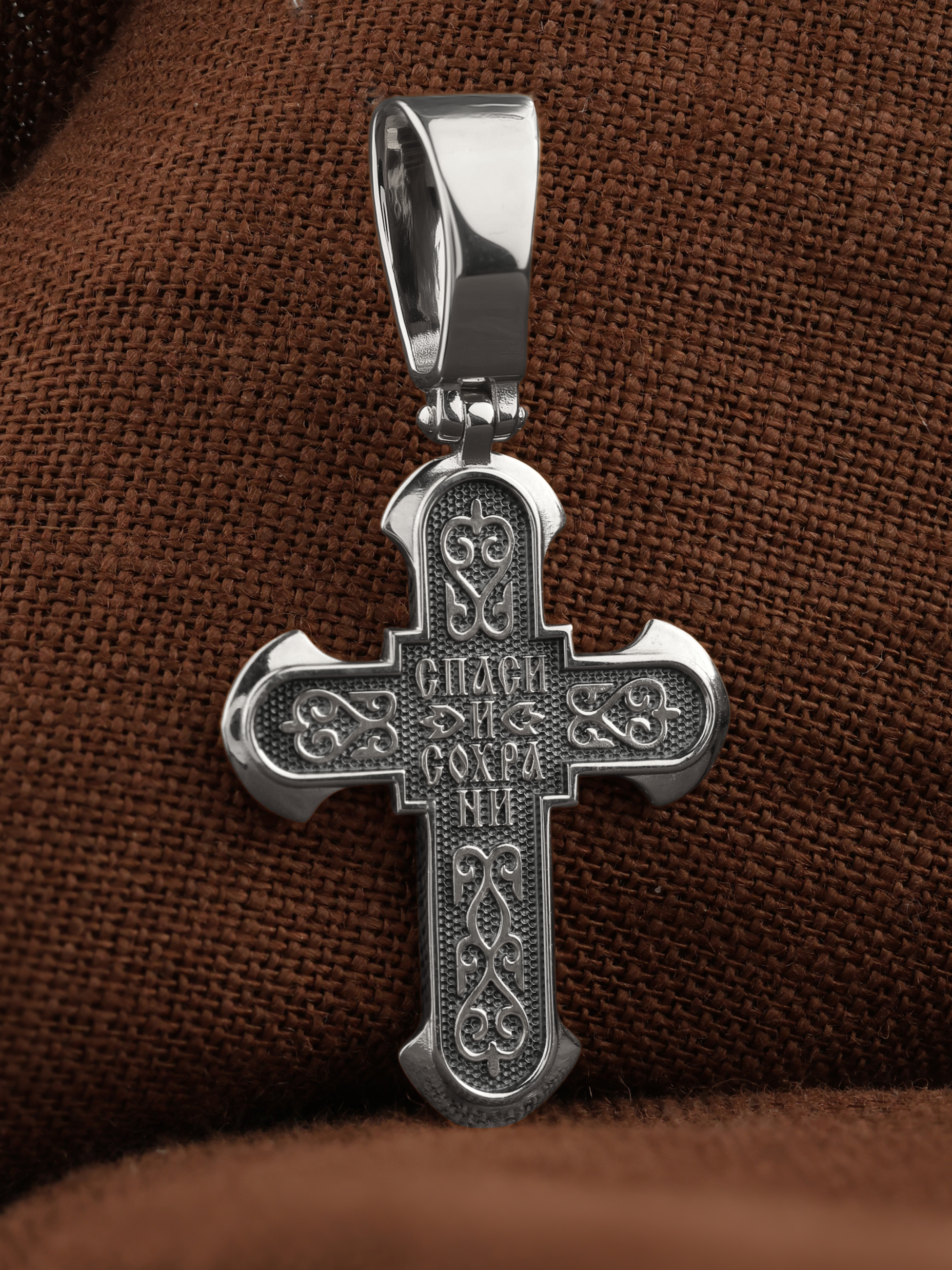 Обратная сторона креста выполнена с использованием растительного орнамента. Такой крест с растительным узором вводит мотив процветшего креста и символизирует Древо Жизни. Умерев за наши грехи, Христос возродил всех для Жизни Вечной, «Смертию смерть поправ…». Своими страданиями Он искупил грехи человечества, умерев и сошествовав во ад, победил сатану, освободил души праведников от вечной смерти и открыл им небесные врата рая. Поэтому на обороте данного креста написано молитвенное славословие: «Спаси и сохрани».