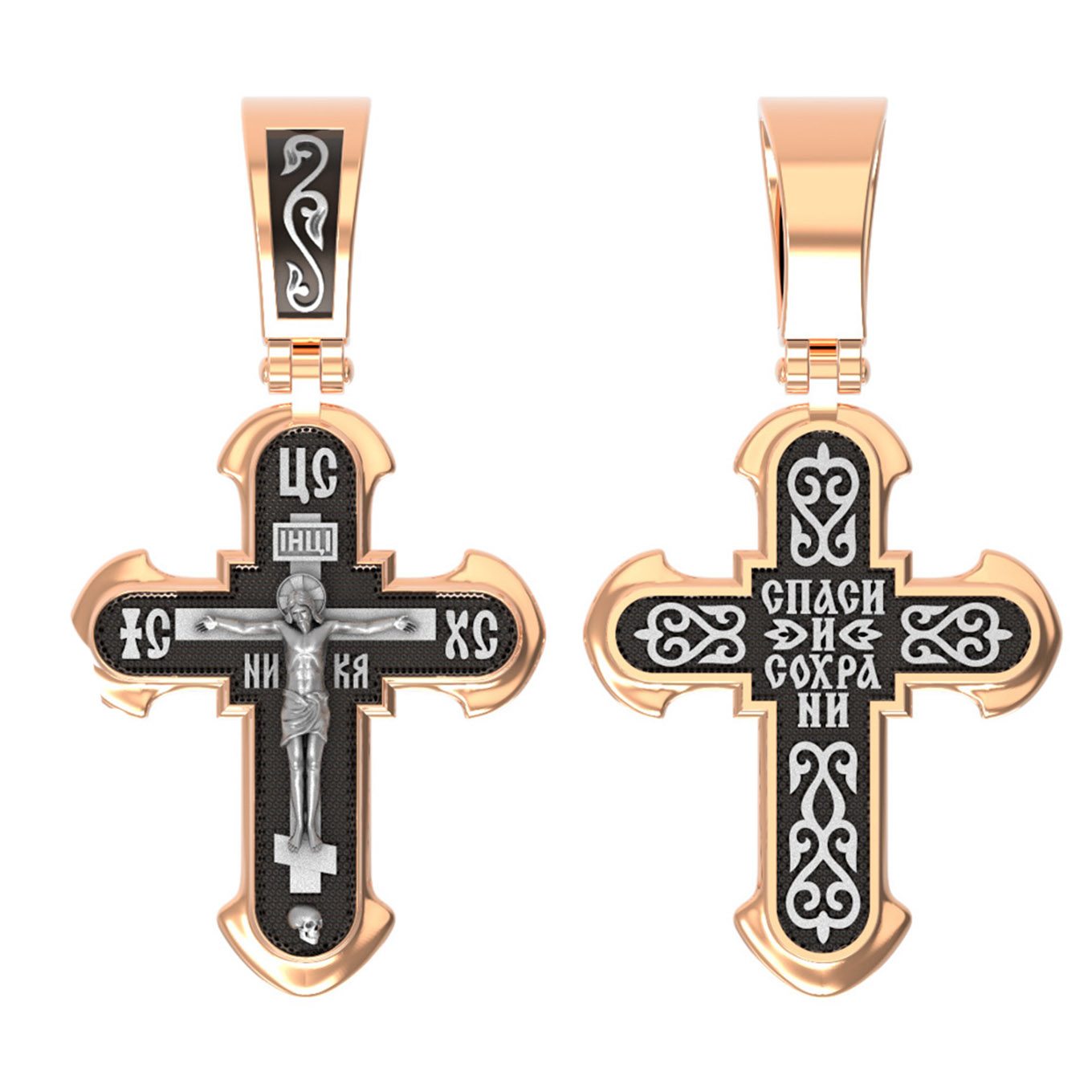 На лицевой стороне креста изображено Распятие, потому что это орудие казни Иисус Христос сделал орудием победы над грехом и смертью. Своими страданиями Он искупил грехи человечества, умерев и сошествовав во ад, победил сатану, освободил души праведников от вечной смерти и открыл им небесные врата рая. Жертва Христа сделала возможным спасение для каждого человека. На православном кресте Христос не умирает, а свободно простирает руки, ладони Иисуса открыты, будто он хочет обнять все человечество, даря им свою любовь и открывая путь к вечной жизни. Над титлом видим слова «ЦРЬ СЛВЫ» — Царь Славы. Верхняя перекладина символизирует собой табличку с надписью «IHЦI» — Иисус Назарянин Царь Иудейский. Возле перекладины пишется сокращенно имя Спасителя «IC XC» — Иисус Христос, ниже добавляется «НИКА» (греч. — Победитель). Возвышение, на котором стоит Крест, символизирует гору Голгофу, на которой произошло Распятие. У подножия Креста изображают прах Адама, обозначенный черепом.