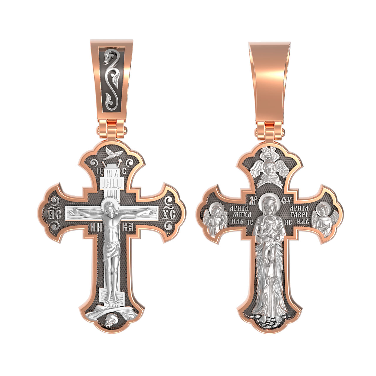 На лицевой стороне креста изображено Распятие, потому что это орудие казни Иисус Христос сделал орудием победы над грехом и смертью. Своими страданиями Он искупил грехи человечества, умерев и сошествовав во ад, победил сатану, освободил души праведников от вечной смерти и открыл им небесные врата рая. Жертва Христа сделала возможным спасение для каждого человека. На православном кресте Христос не умирает, а свободно простирает руки, ладони Иисуса открыты, будто он хочет обнять все человечество, даря им свою любовь и открывая путь к вечной жизни.