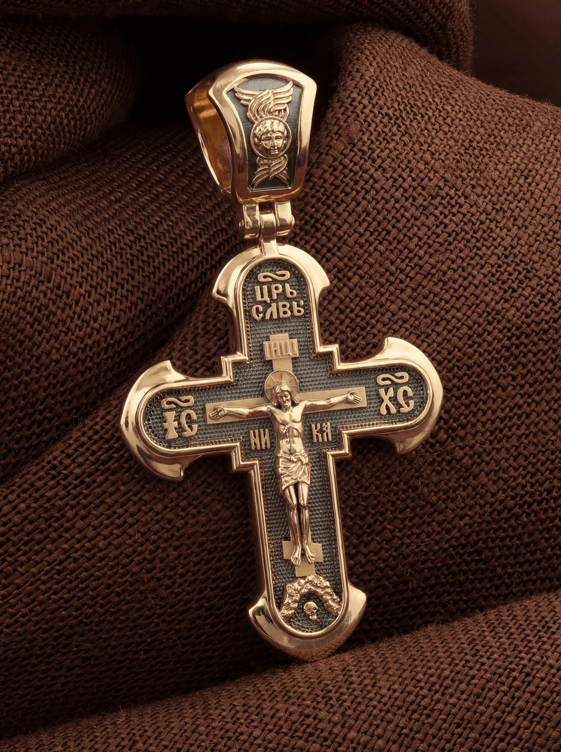 На лицевой стороне креста изображено Распятие Господа нашего Иисуса Христа. В традиции Православия — принято изображать Спасителя как Воскресшего Крестоносителя, призывающего в Свои объятия все концы мира. Его руки имеют горизонтальное положение, открытые ладони пробиты гвоздями, голова наклонена вправо, вокруг головы крестчатый нимб. Крест стоит на горе камней, символизирующих Голгофу, в основании которой различается череп. Это голова Адама. По преданию, тело Адама было погребено Симом, сыном Ноя, на месте, где впоследствии возникла гора Голгофа. Над головой Господа на поперечной перекладине аббревиатура «IНЦI», что символизирует табличку, которая была прибита к Кресту, с надписью «Иисус Назорей Царь Иудейский». Этим иудеи хотели посмеяться над Христом, не зная, что распинают истинного Царя всех царей. По бокам поперечной перекладины титлы святого имени Христа «IC» (Иисус) «ХС» (Христос), и слово «НИКА», что в переводе с греческого означает «победитель». Венчает лицевую сторону креста надпись «Царь Славы».