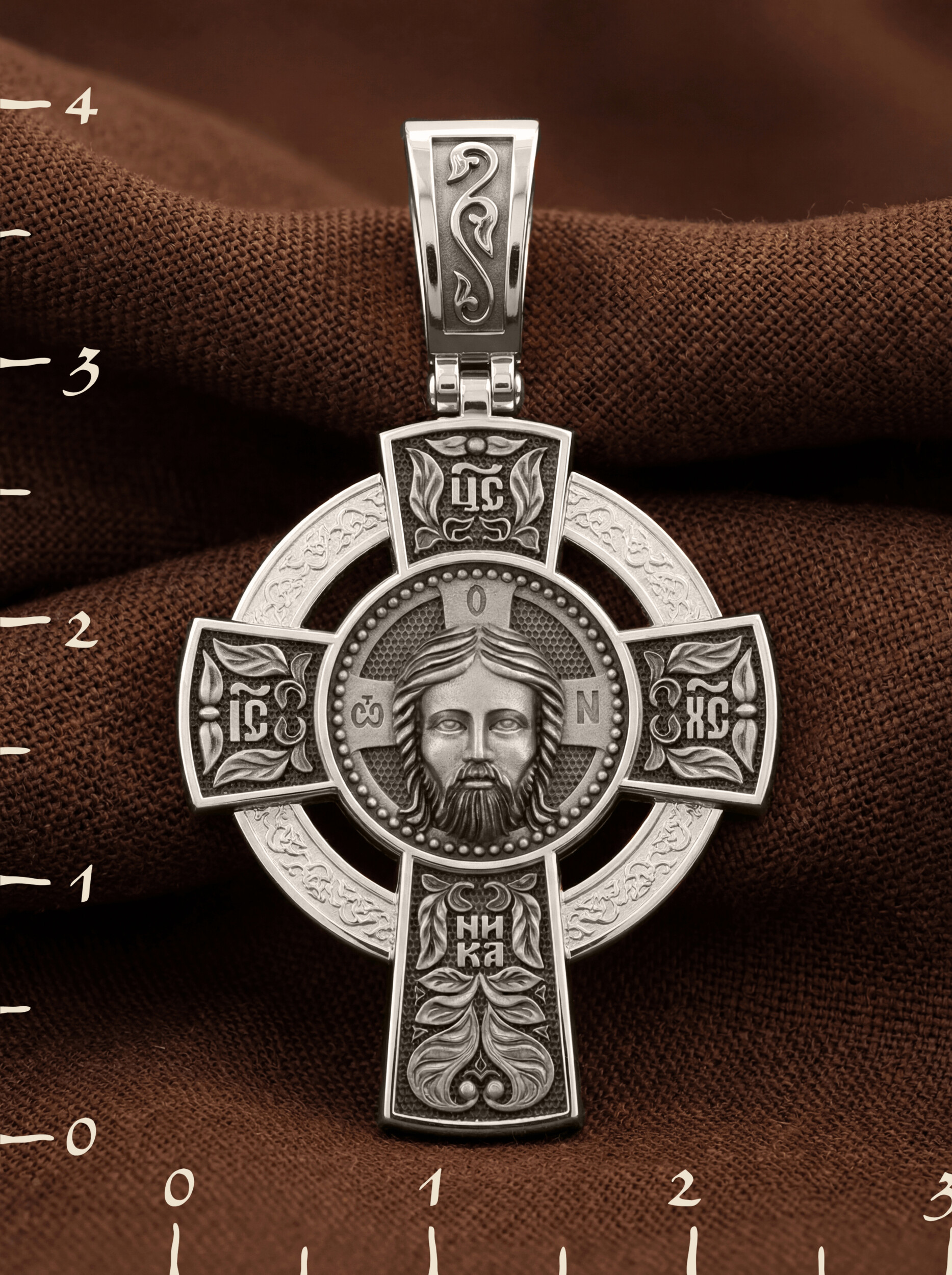 На лицевой стороне креста изображен Нерукотворной образ Спасителя, который Он Сам запечатлел на плате и передал для исцеления больному проказой царю Эдессы. Лик Спасителя — в трехчастно разделенном нимбе, на котором начертана греческая монограмма «W OH», что означает «Сущий» или «Тот, кто есть». По краям оконечностей креста, в пышном растительном узоре, запечатлены символичные надписи, традиционно сопровождающие образ Спасителя. Это сокращенное имя Христа «ИС ХС», аббревиатура «ЦС» (Царь Славы), и надпись «НИКА» (Победитель).
