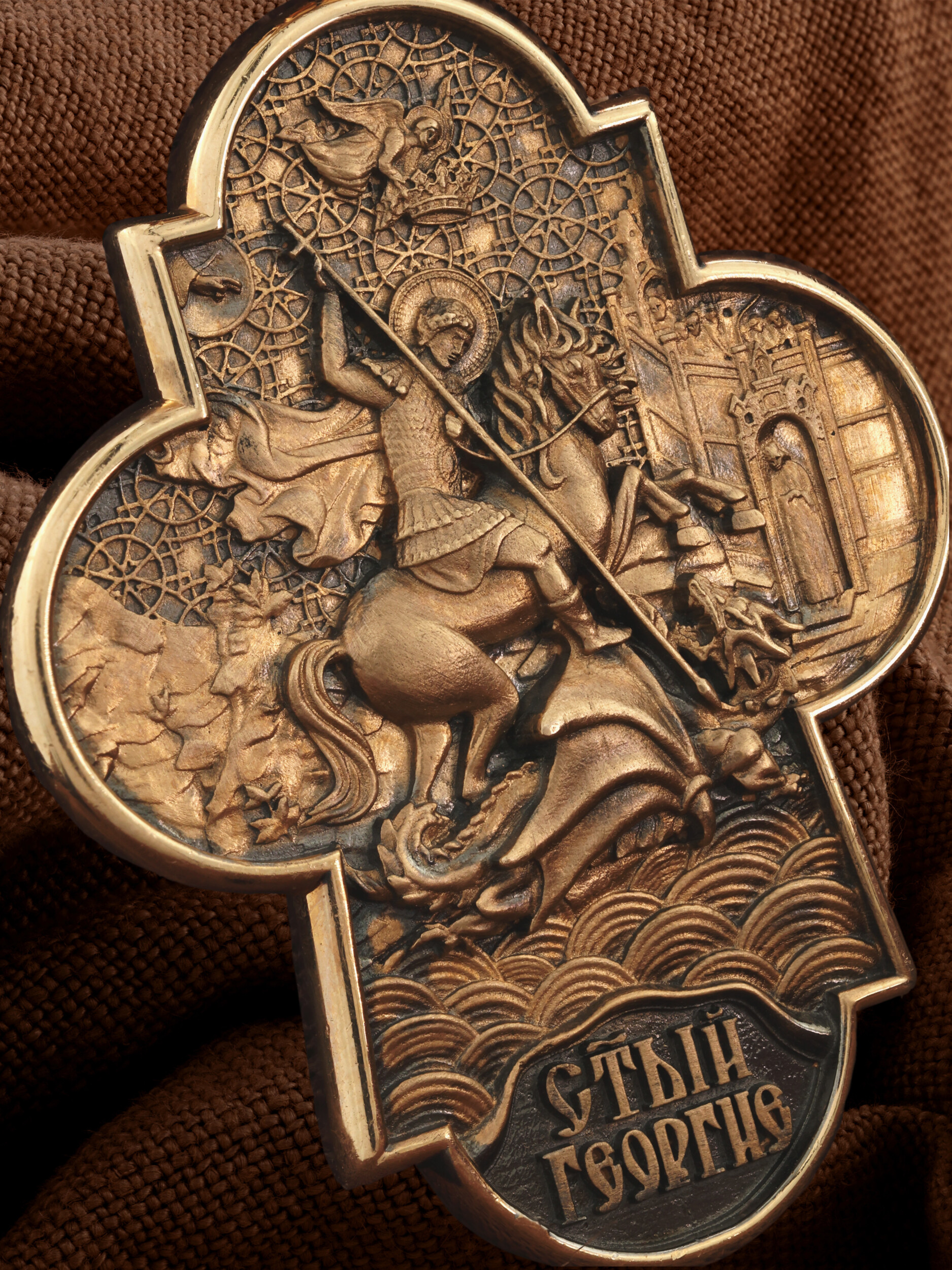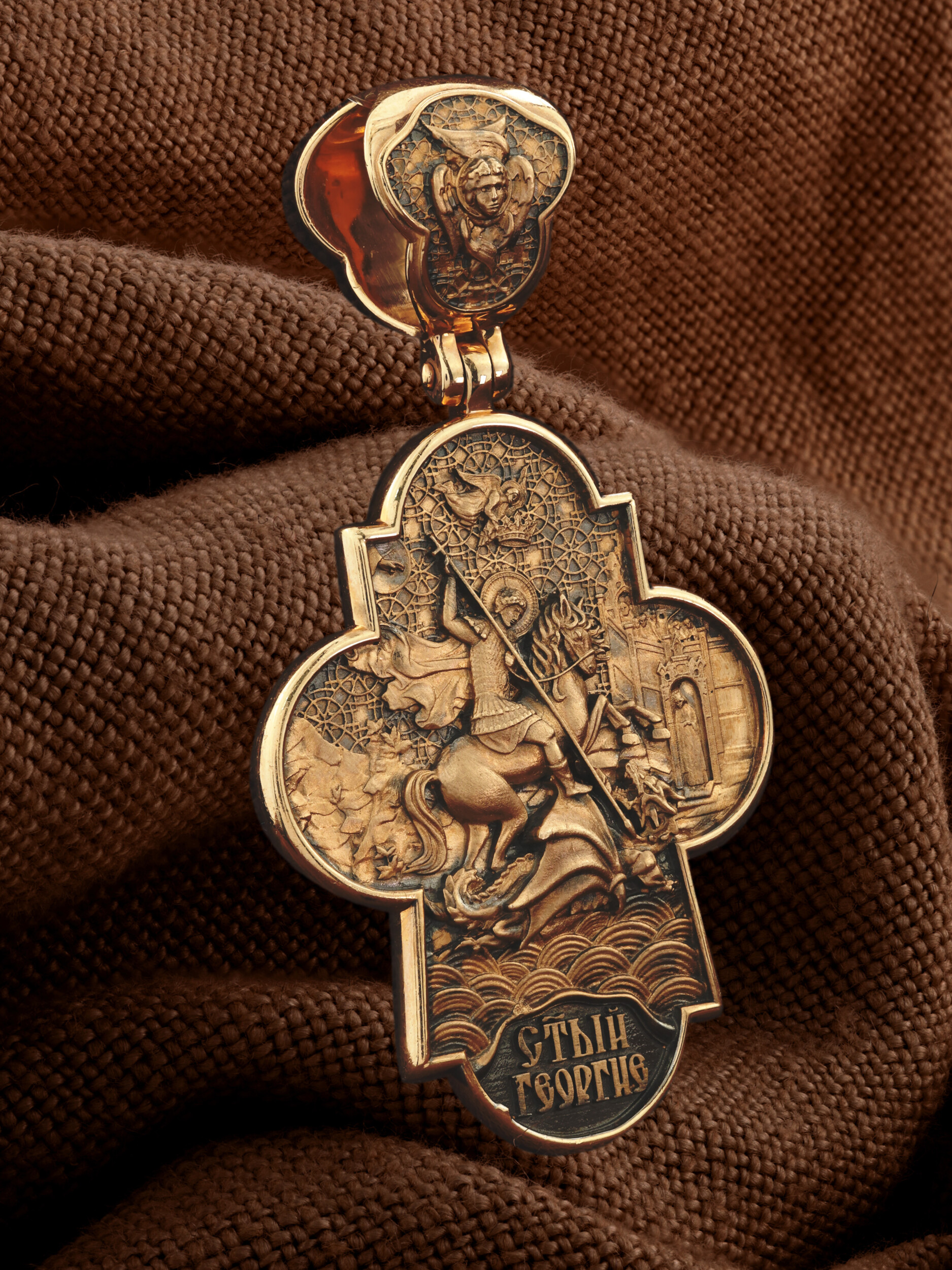На оборотной стороне креста помещено изображение Святого Великомученика Георгия Победоносца — одного из самых почитаемых и удивительных святых. Георгий родился в Каппадокии (Малая Азия) в семье богатых и знатных горожан. Юношей поступил на службу к римскому императору Диоклетиану, за отличное знание военного дела и проявленную в боях и походах храбрость был приближен к императору и удостоен высокого воинского звания. Во время начавшихся гонений на христиан, перешел на сторону гонимых и, отвергнув человеческий страх, стал ярым проповедником учения Христа. Мучители подвергли опального воеводу жесточайшим восьмидневным пыткам и казнили его (обезглавили) в возрасте около тридцати лет в 303 году. Георгий изображен как воитель, сидящий на вздыбленном коне и поражающий копьем огнедышащего змея. Слева над образом изображена благословляющая Божия десница. Над святым изображен ангел возлагающий на него венец мученика. Змей символизирует собою сатанинские силы. Молитвами вознесенными к Всевышнему и своей непреклонной верой он смог одолеть чудовище. Святой убил змея, спас царскую дочь, принесенную в жертву, и жителей города, их души от влияния дьявола, породив в них надежду и веру в Господа, призывая людей принять христианскую веру. На кулонном кольце изображен шестикрылый Ангел — Серафим.