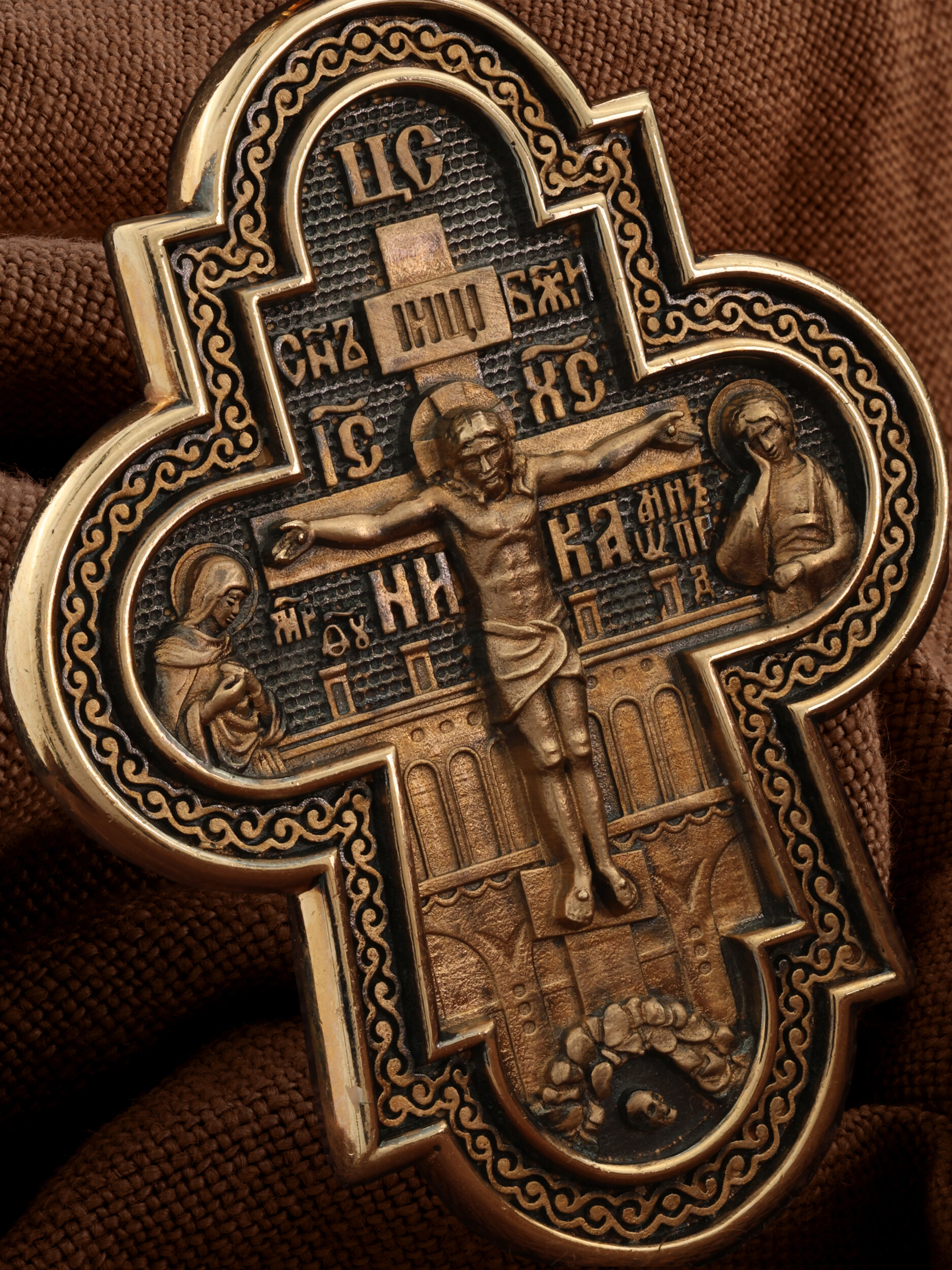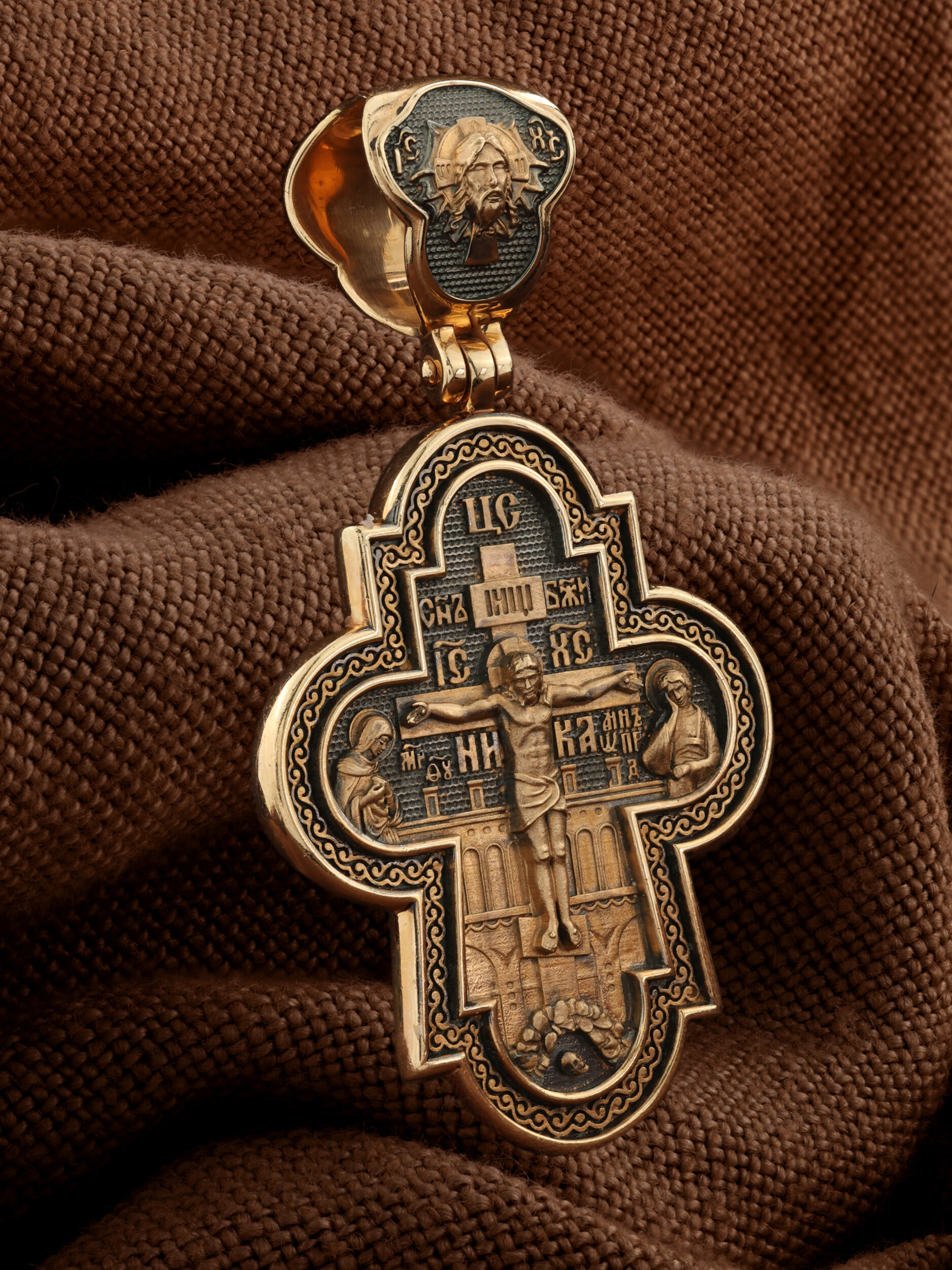 На лицевой стороне креста изображено Распятие Господа и Спасителя нашего Иисуса Христа, отдавшего Себя на смерть, для искупления грехов мира. Крест является символом жертвенной любви Всеблагого Бога к падшим людям, всепобеждающим духовным оружием христиан, основанием и средоточием церковной жизни. Господь сказал: кто хочет идти за Мною, отвергнись себя, и возьми крест свой, и следуй за Мною. (Мк. 8: 34). Над Распятием помещена надпись «Царь Славы». На верхней табличке, выше головы Иисуса, расположена надпись, составленная Понтием Пилатом — «IНЦI». Она означает «Иисус Назорей, Царь Иудейский». Надпись «IC» «ХC», означает Иисус Христос, помещается на разных сторонах поперечной перекладины креста. Возвышение, на котором стоит Крест, символизирует гору Голгофу, на которой произошло Распятие. Под подножием Креста изображена покоящаяся голова (череп) Адама. На кулонном кольце изображен Нерукотворный образ Господа и Спасителя нашего Иисуса Христа, чудесно отпечатавшийся на плате, которым Христос вытер свой лик.