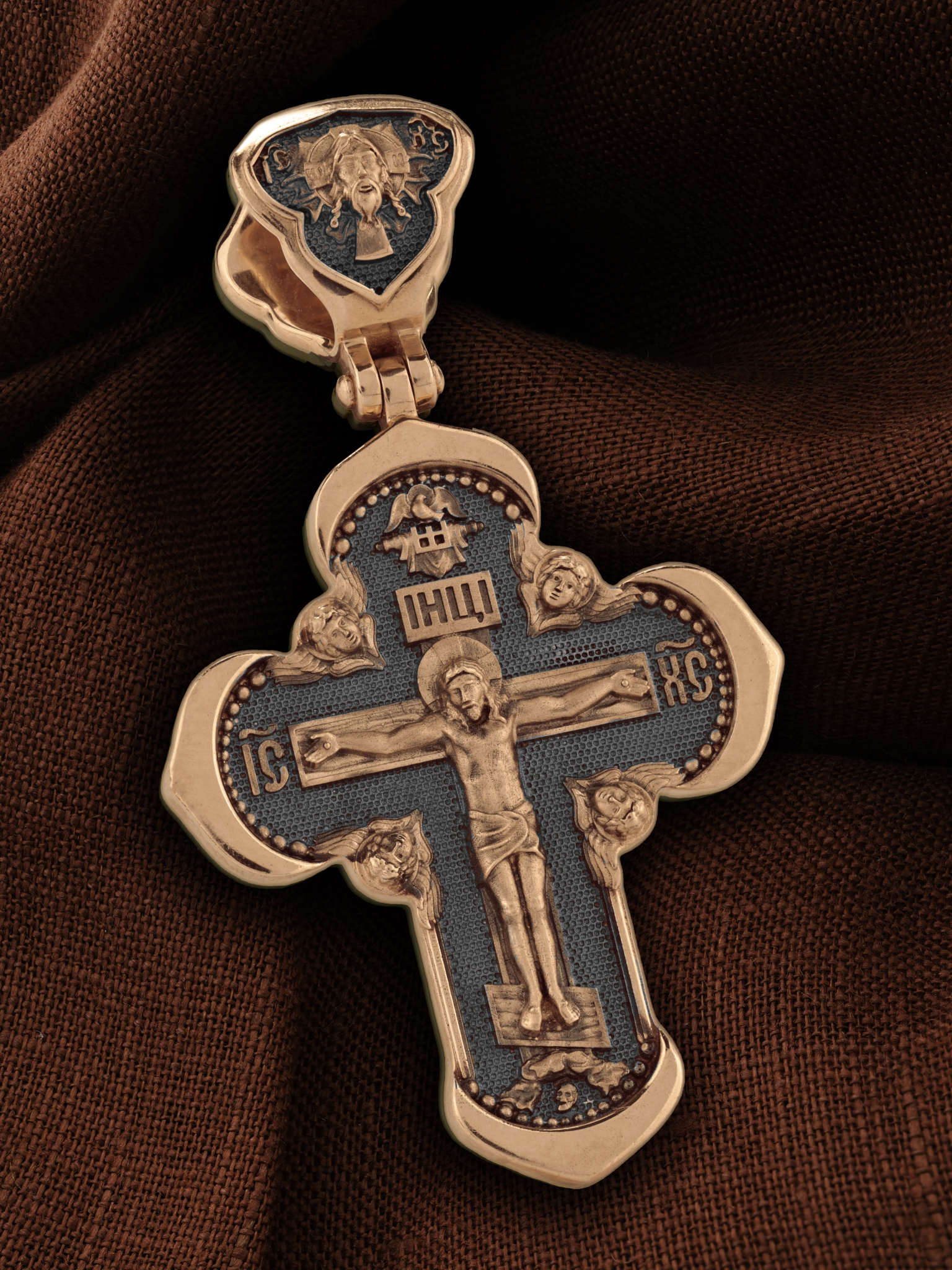 На лицевой стороне креста изображено Распятие Господа и Спасителя нашего Иисуса Христа, отдавшего Себя на смерть, для искупления грехов мира. Крест является символом жертвенной любви Всеблагого Бога к падшим людям, всепобеждающим духовным оружием христиан, основанием и средоточием церковной жизни. Господь сказал: «кто хочет идти за Мною, отвергнись себя, и возьми крест свой, и следуй за Мною». (Мк. 8: 34). На верхней табличке, выше головы Иисуса, расположена надпись, составленная Понтием Пилатом — «IНЦI». Она означает «Иисус Назорей, Царь Иудейский». Надпись «IC» «ХC», означает Иисус Христос, помещается на разных сторонах поперечной перекладины креста. Крест стоит на горе камней, символизирующих Голгофу. В ее основании различается череп– это голова Адама. На кулонном кольце изображен Нерукотворный образ Господа и Спасителя нашего Иисуса Христа, чудесно отпечатавшийся на плате, которым Христос вытер свой лик.